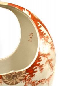 Asian Japanese style (19th Cent) orange and white decorated round shaped porcelain vase with open handle top and resting on 4 feet.