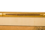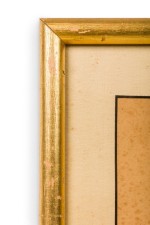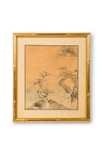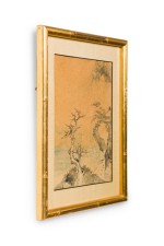 Japanese watercolor of a leafless tree on a hill with a house in the background in a gilt faux bamboo frame (companion pictures: 063897 and 063898).