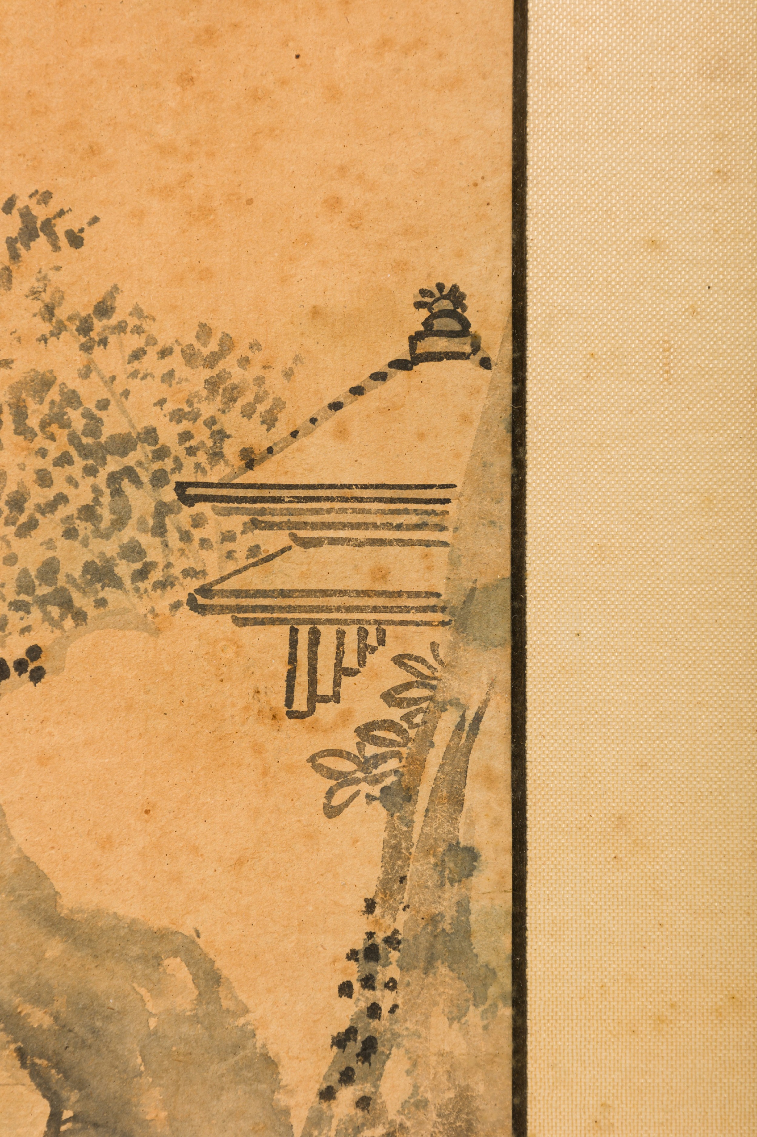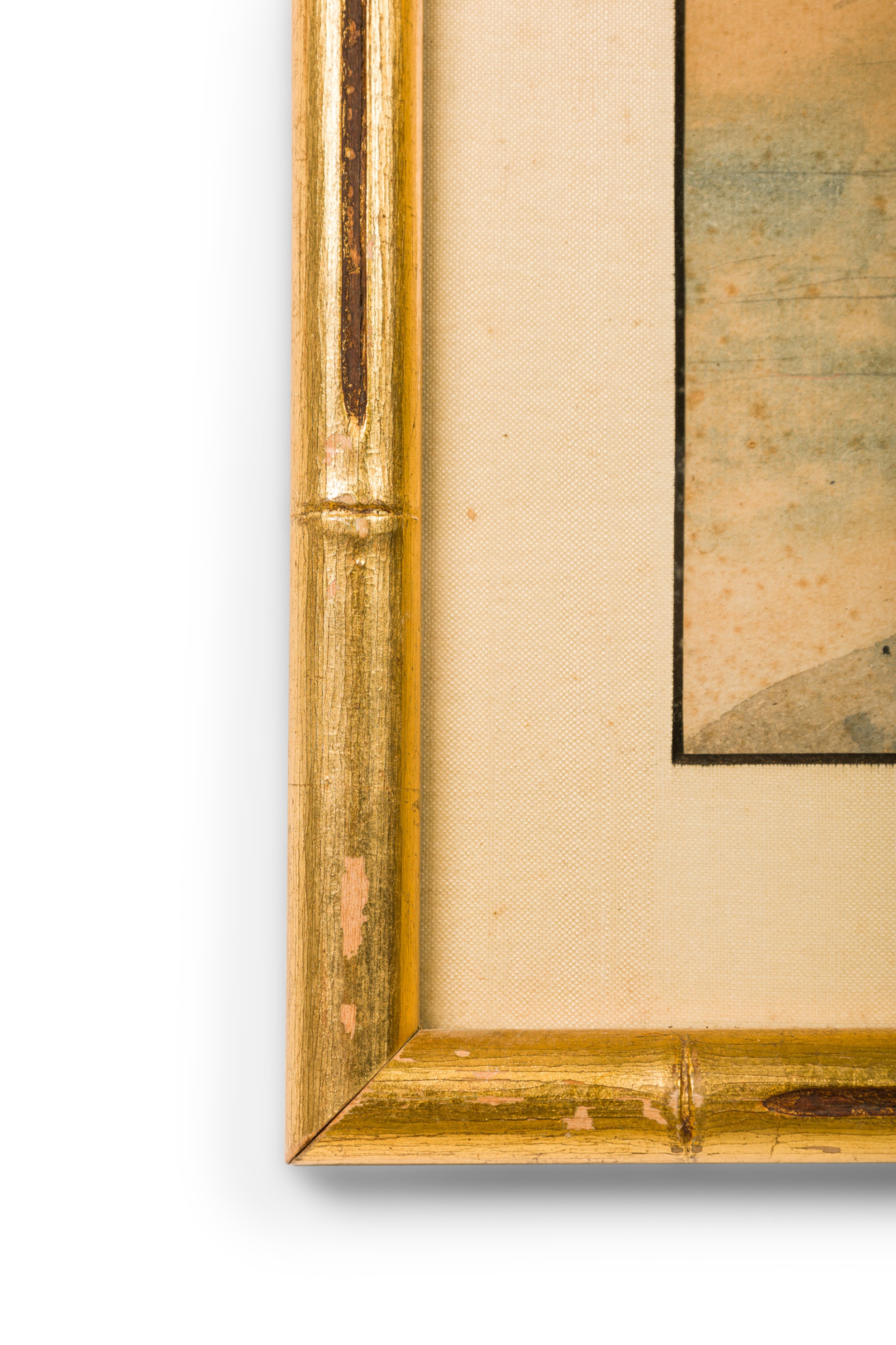 Japanese watercolor of a leafless tree on a hill with a house in the background in a gilt faux bamboo frame (companion pictures: 063897 and 063898)