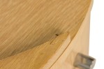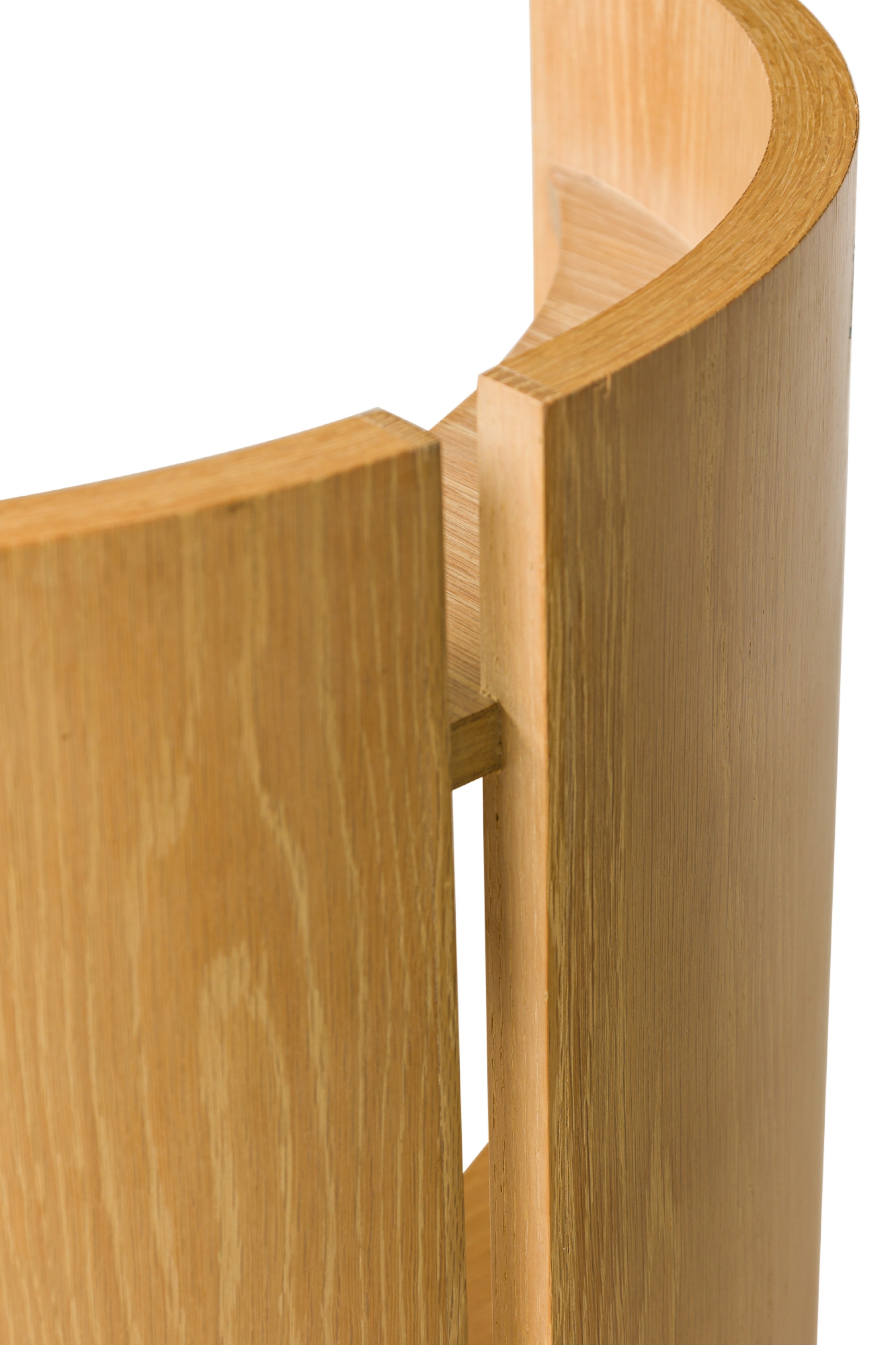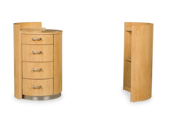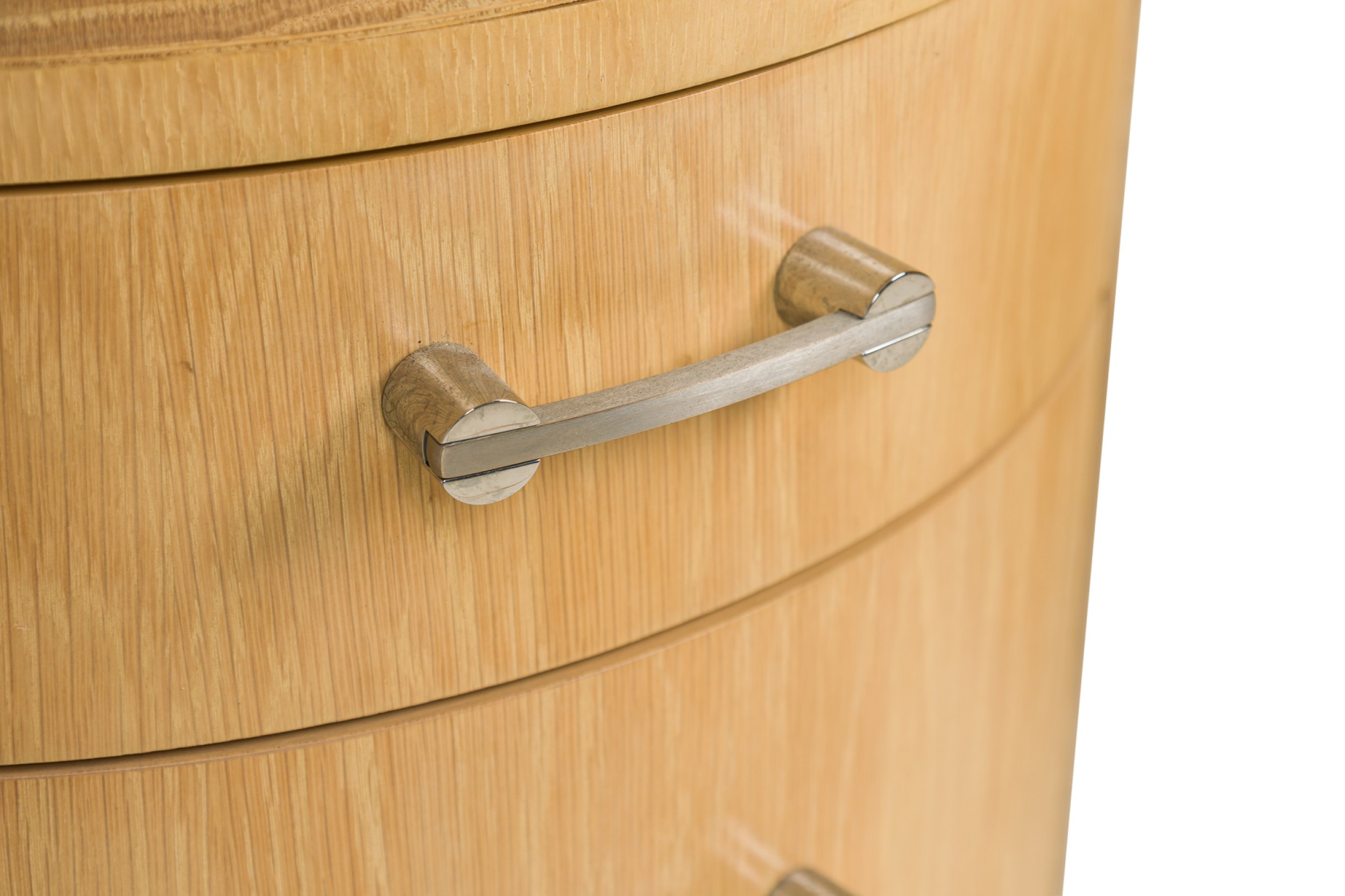 Vintage American Modern cerused oak veneer dressing / vanity table in two parts: one demilune wood piece with central shelf, and a cylindrical cabinet piece with four drawers mounted with brushed silver metal drawer pulls and base veneer, intended to support a missing glass (or mirrored) top. (JAY SPECTRE)