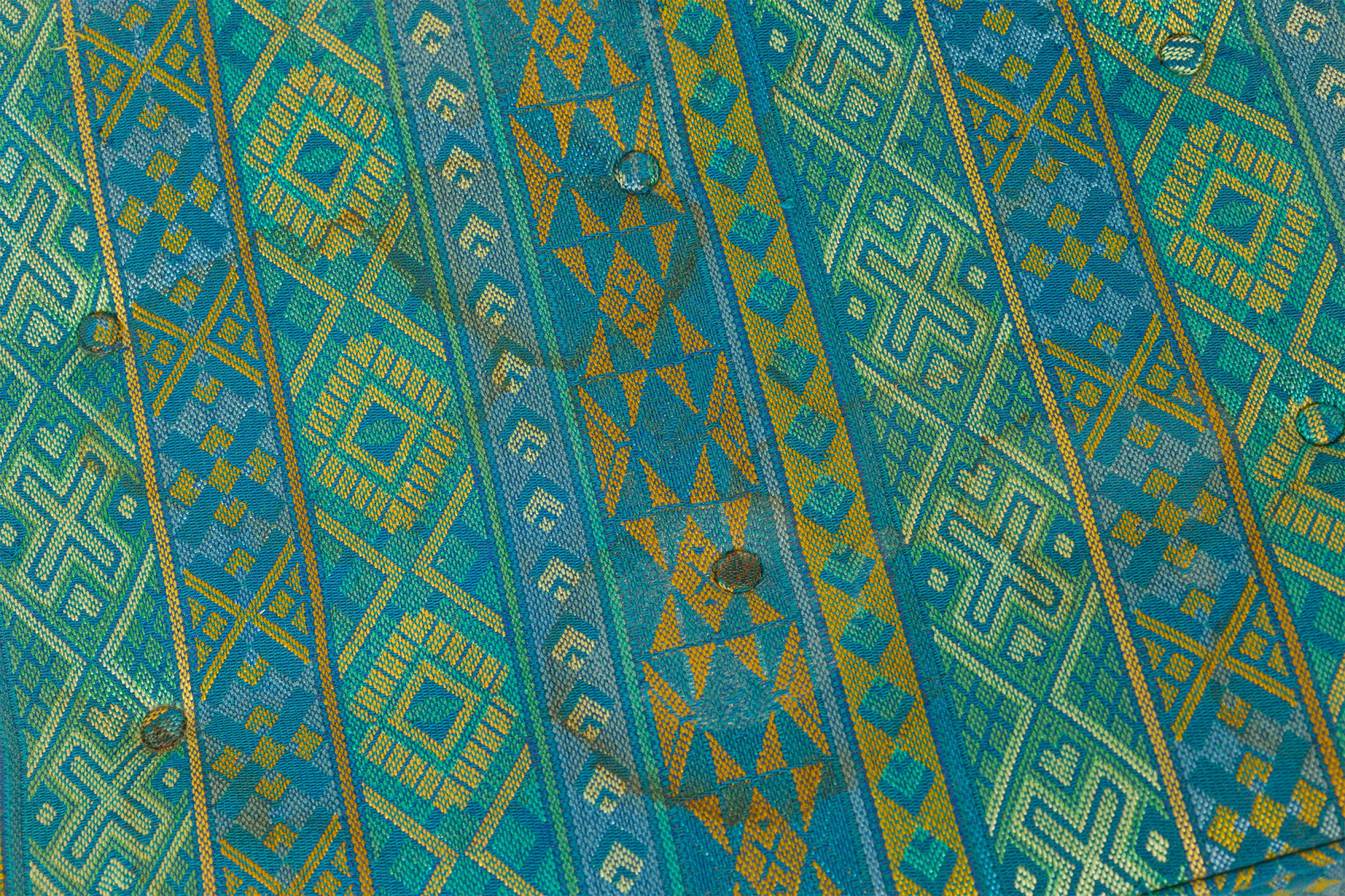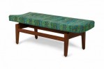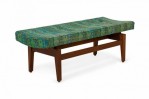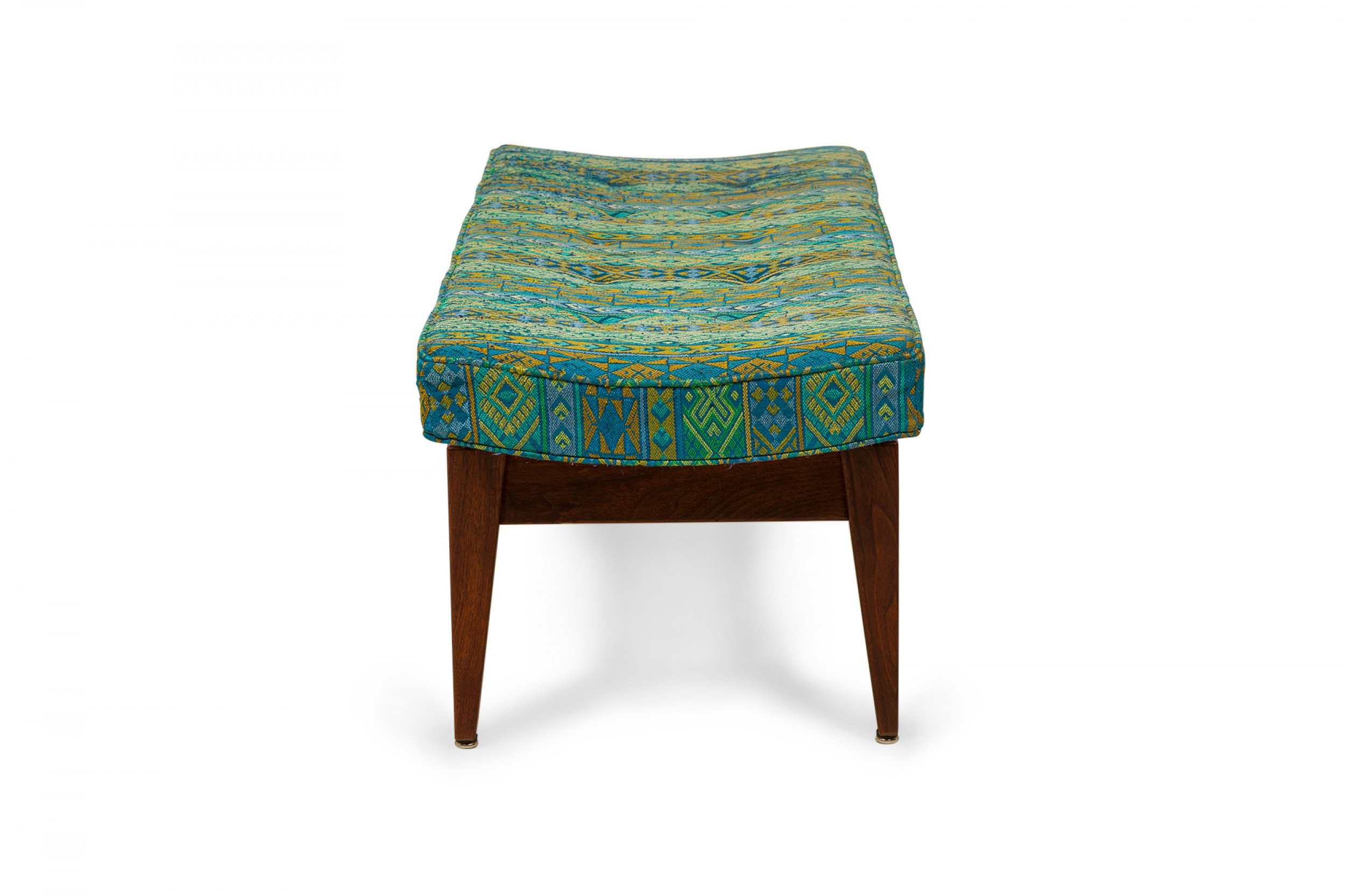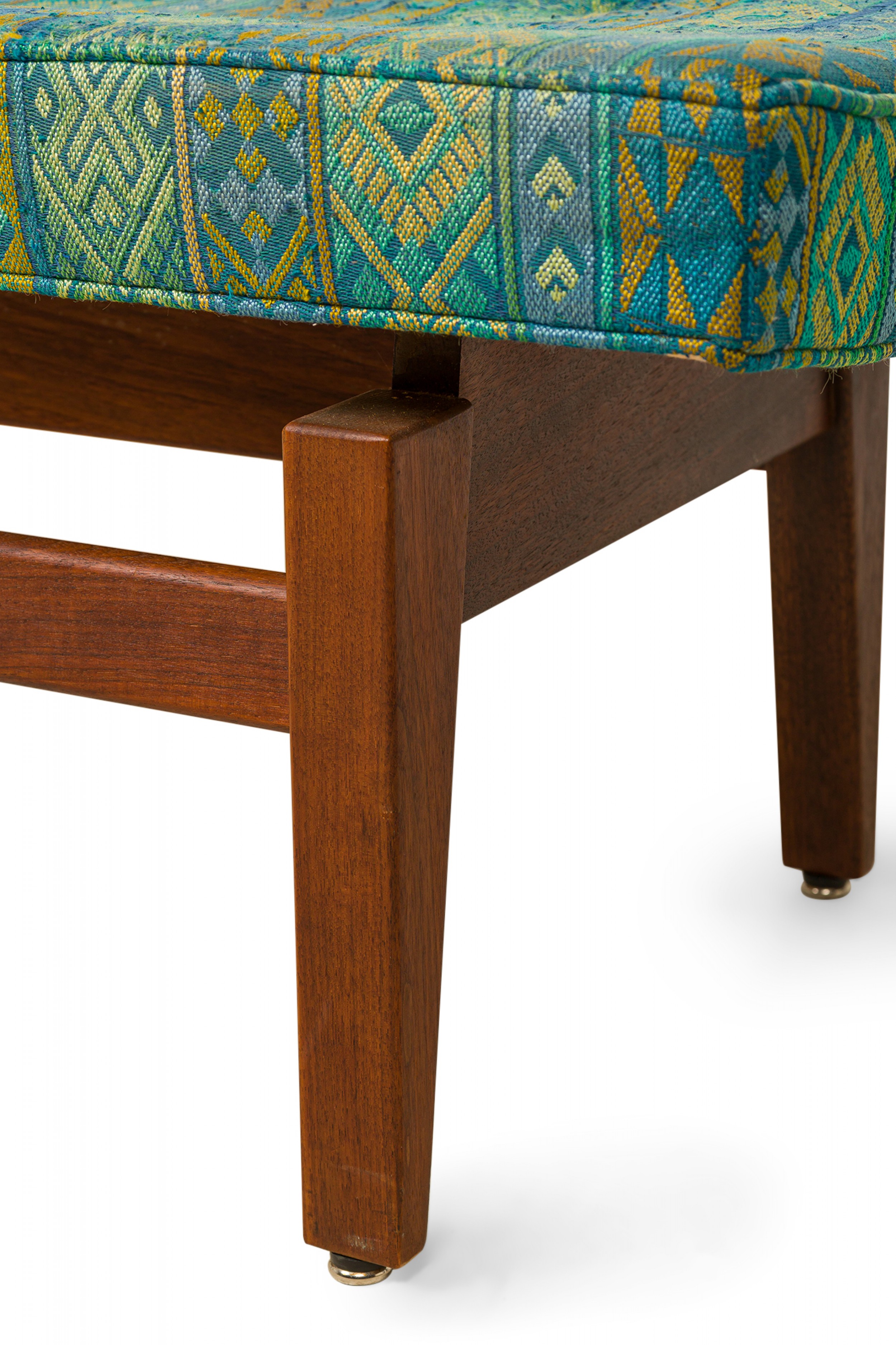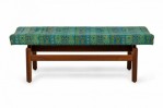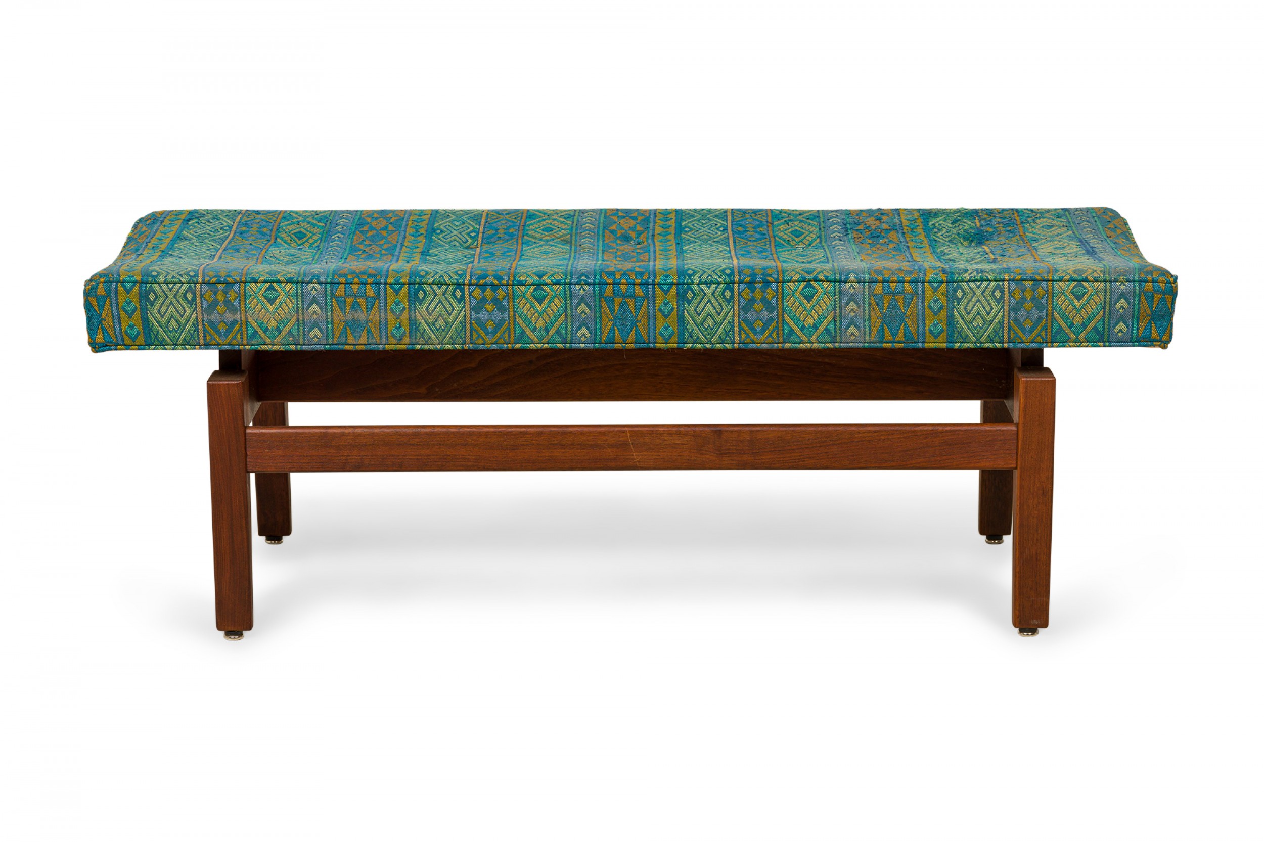 Danish Mid-Century rectangular floating bench with a banded Southwestern blue and green patterned fabric upholstered seat resting on a wooden floating frame base. (JENS RISOM)