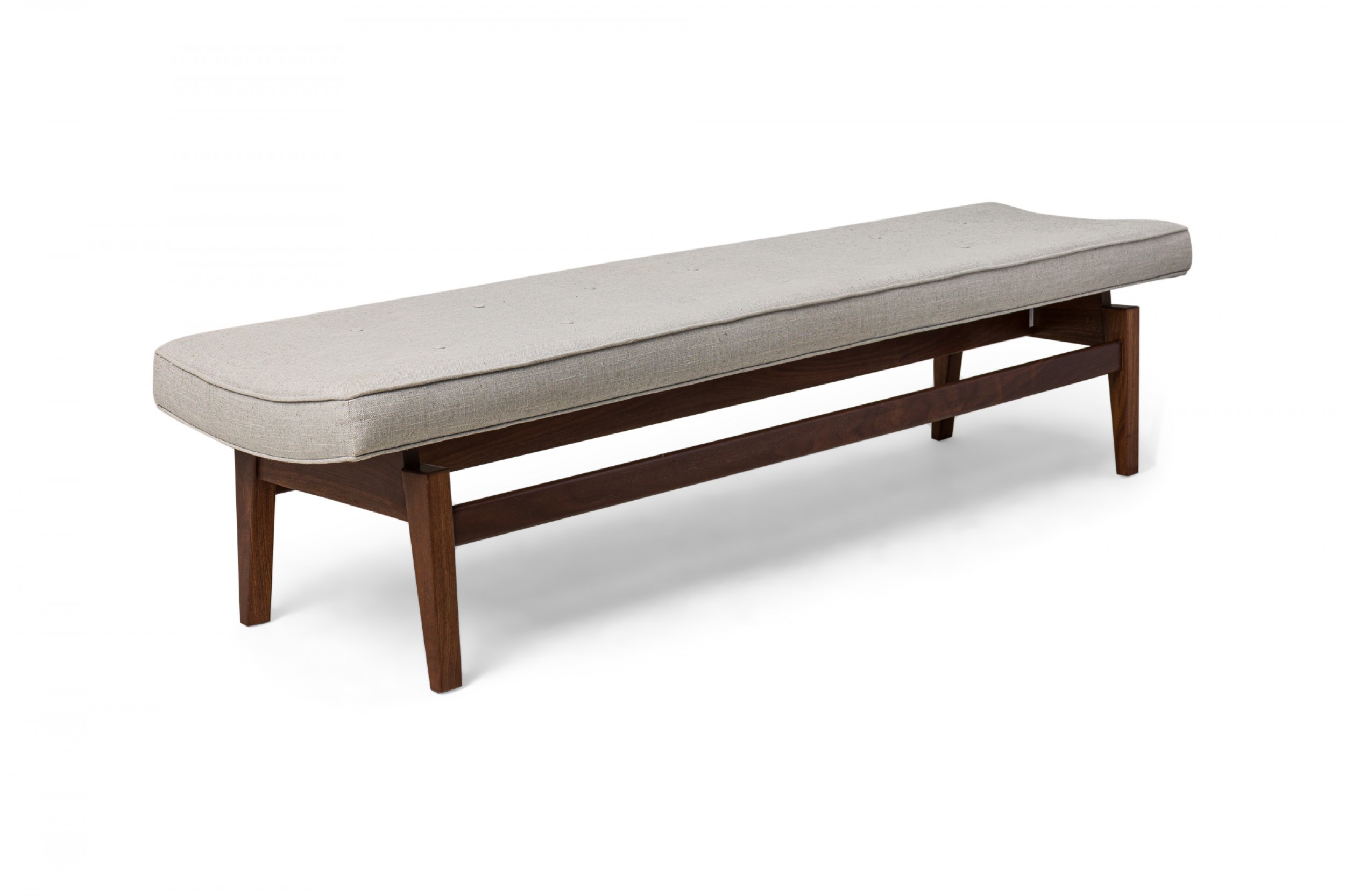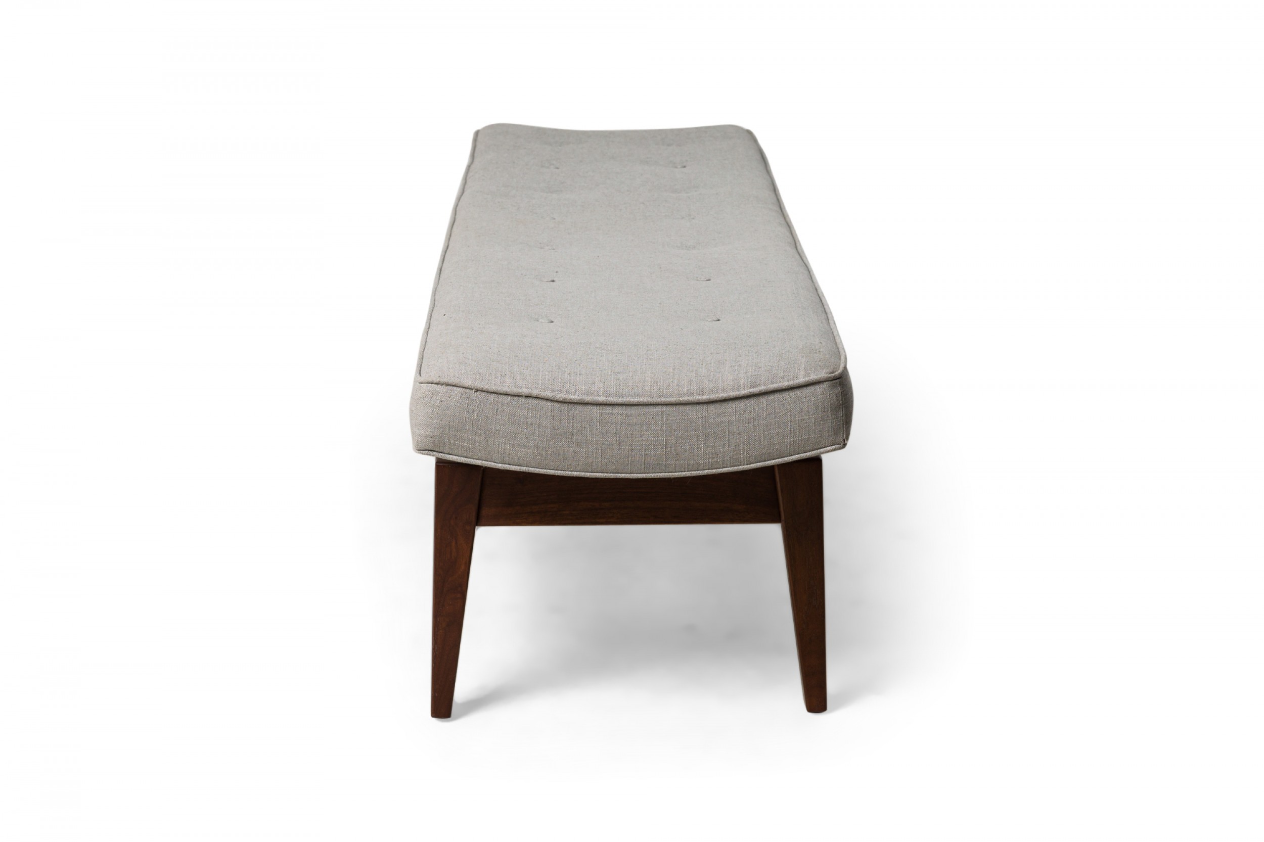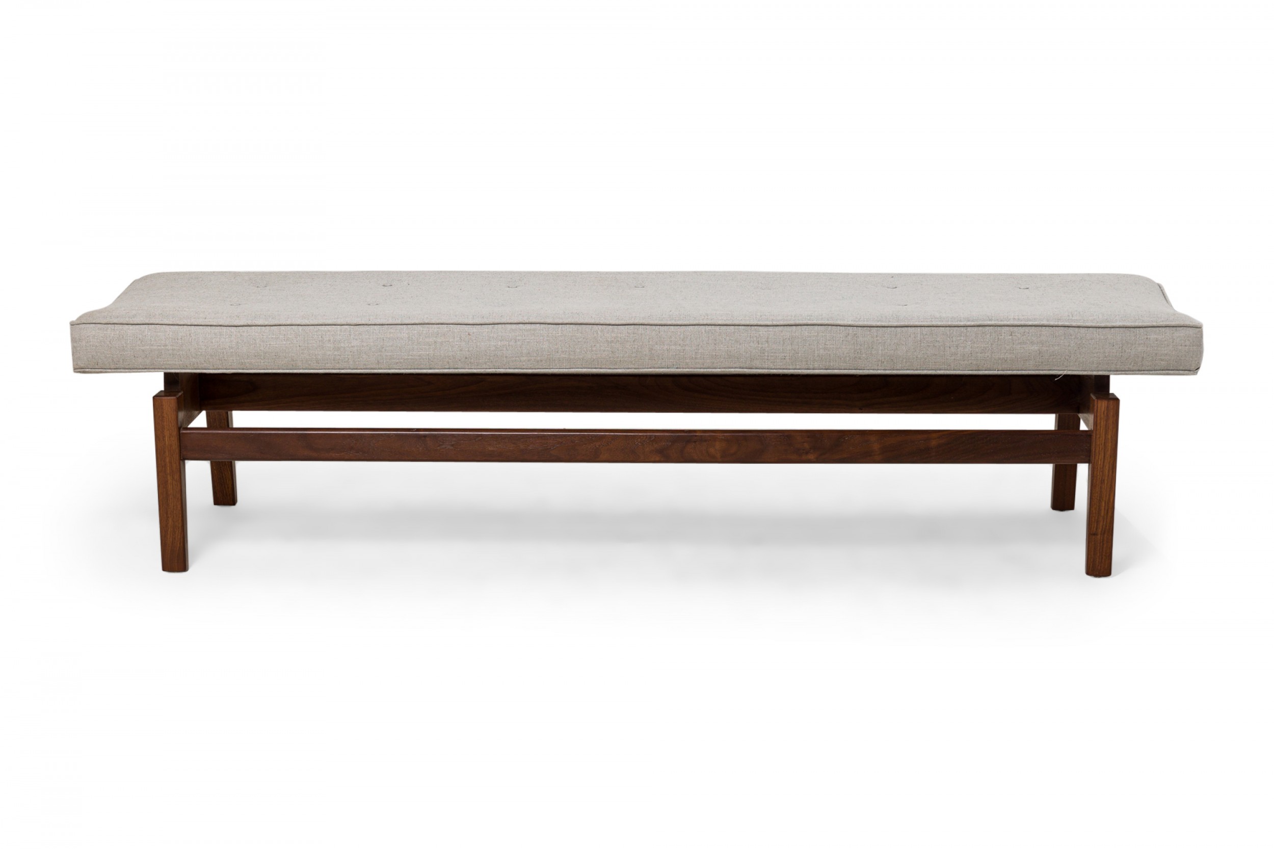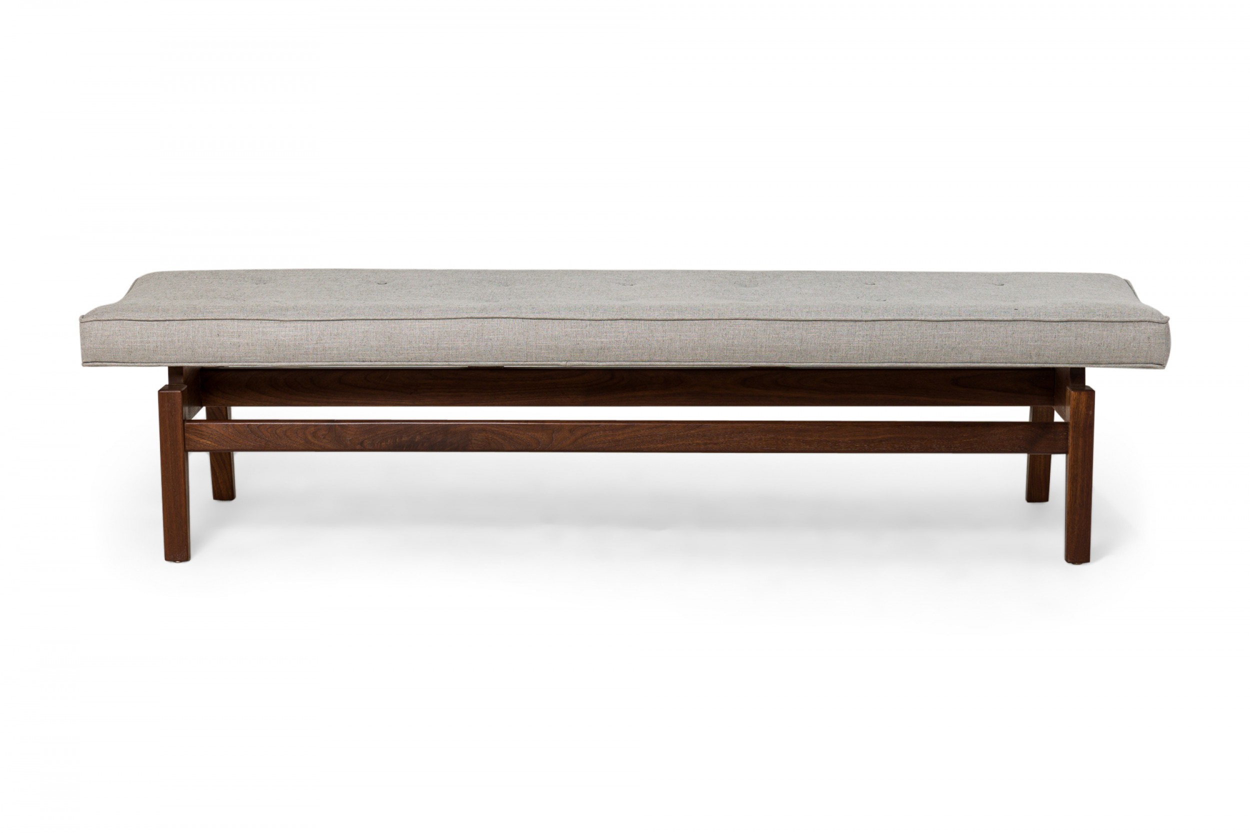 Danish Mid-Century floating bench with a walnut stretcher base supporting a rectangular seat cushion upholstered in light gray woven fabric with button tufted detail. (JENS RISOM)