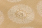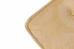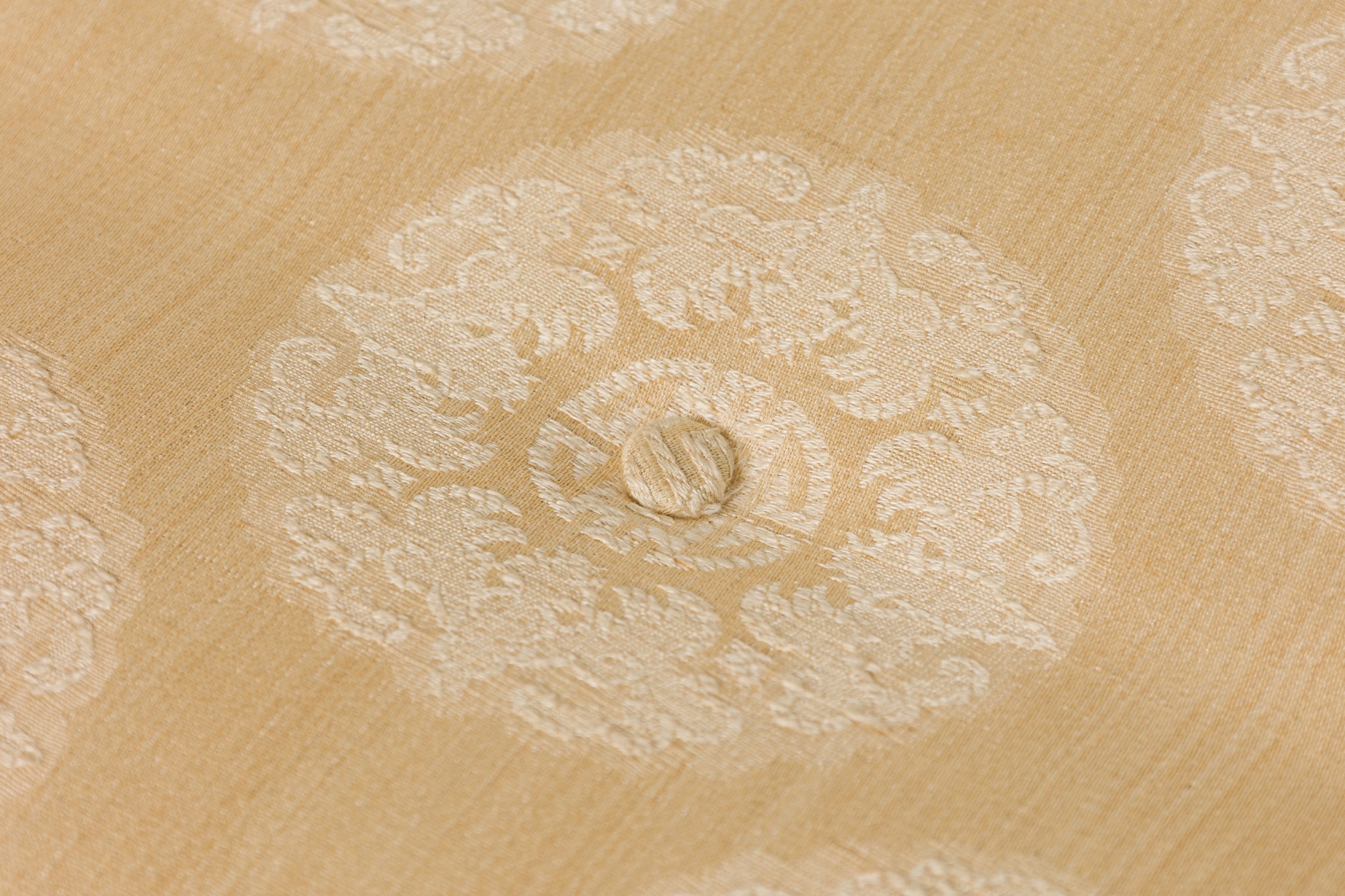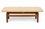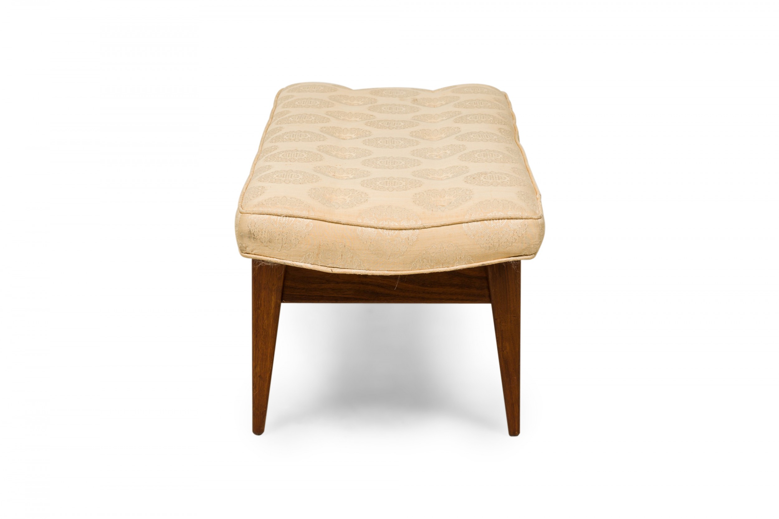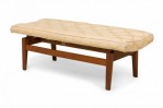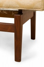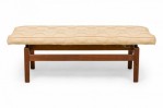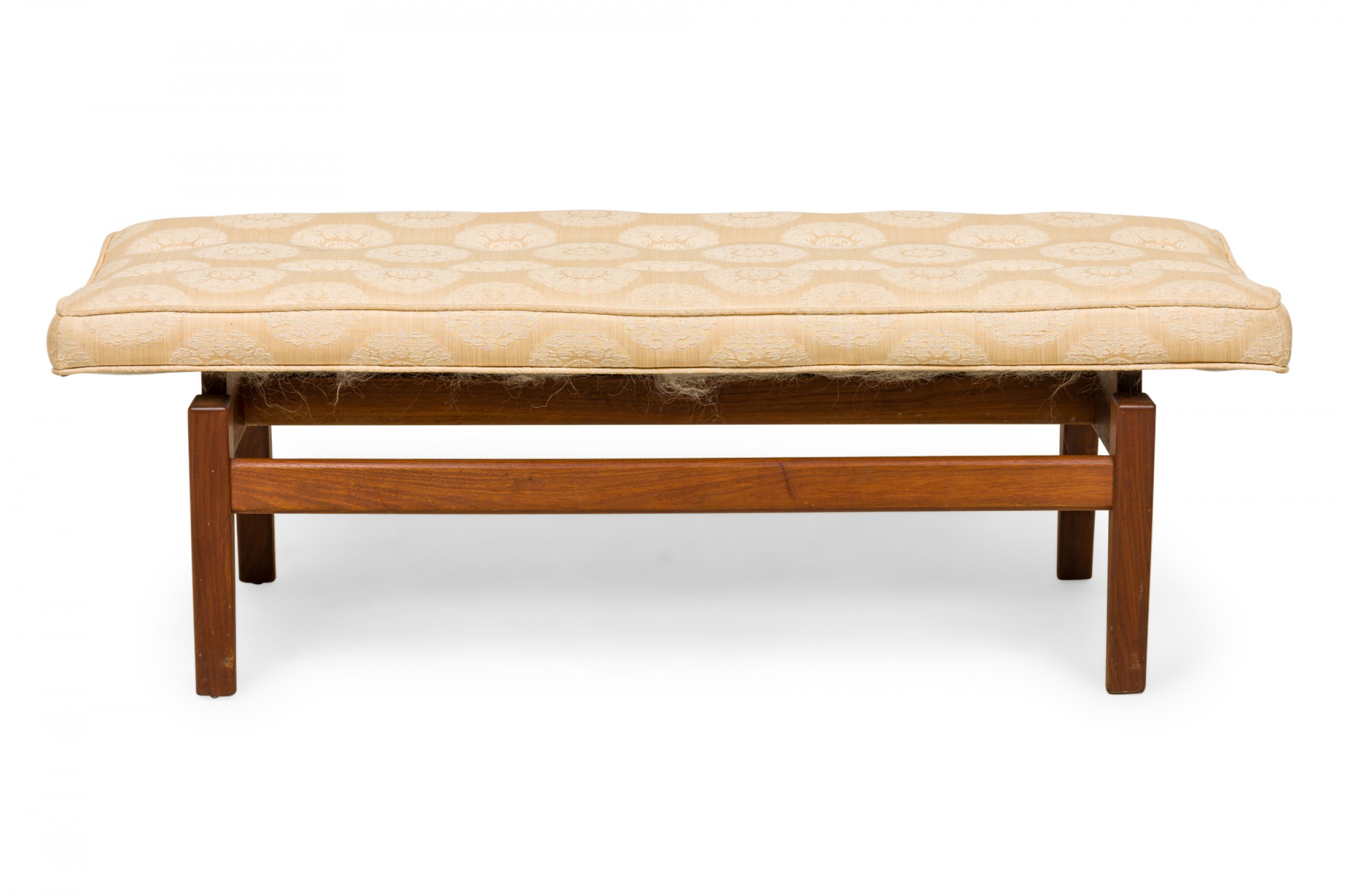 Danish Mid-Century rectangular floating bench with an off-white Shou-patterned fabric upholstered seat resting on a wooden floating frame base. (JENS RISOM)