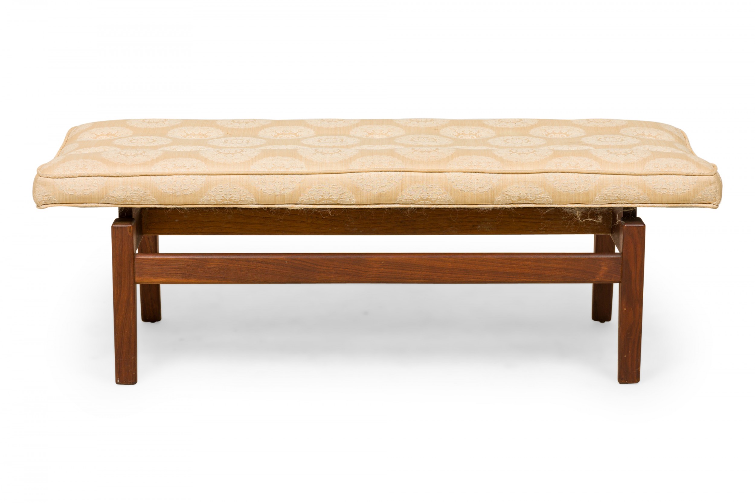 Danish Mid-Century rectangular floating bench with an off-white Shou-patterned fabric upholstered seat resting on a wooden floating frame base. (JENS RISOM).