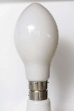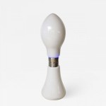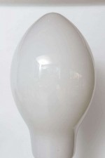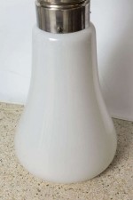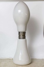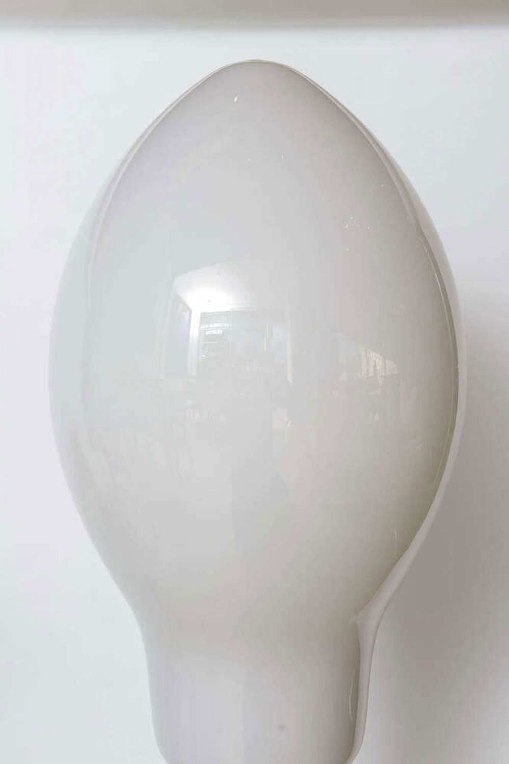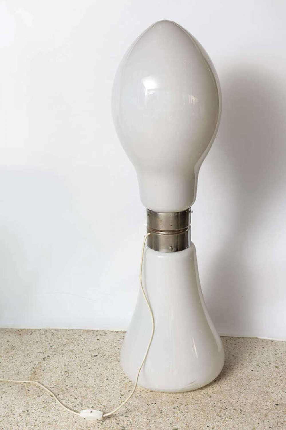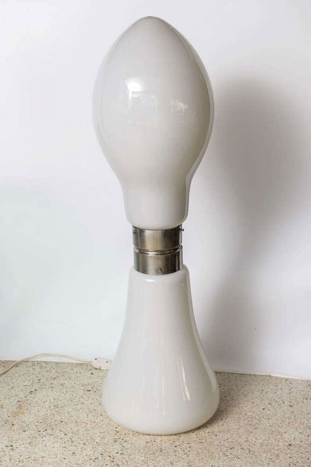 Mid-Century American Modern (1960s) "Light Bulb" design floor lamp comprised of two white glass sections with a silver metal joining band. (JOE COLOMBO)