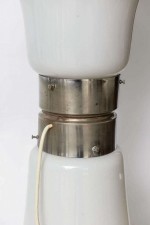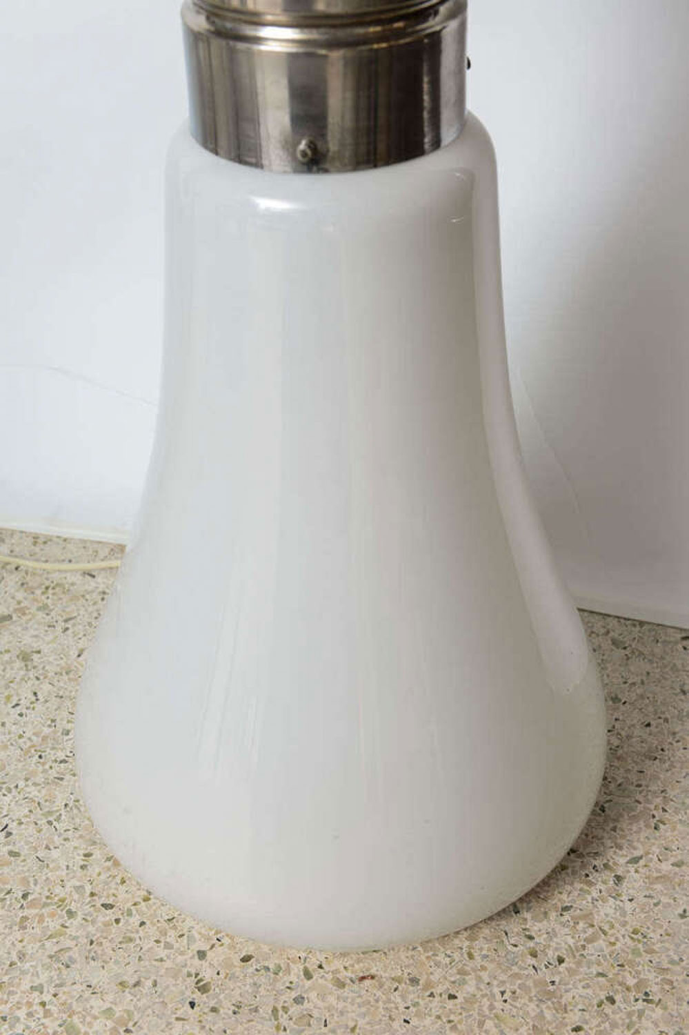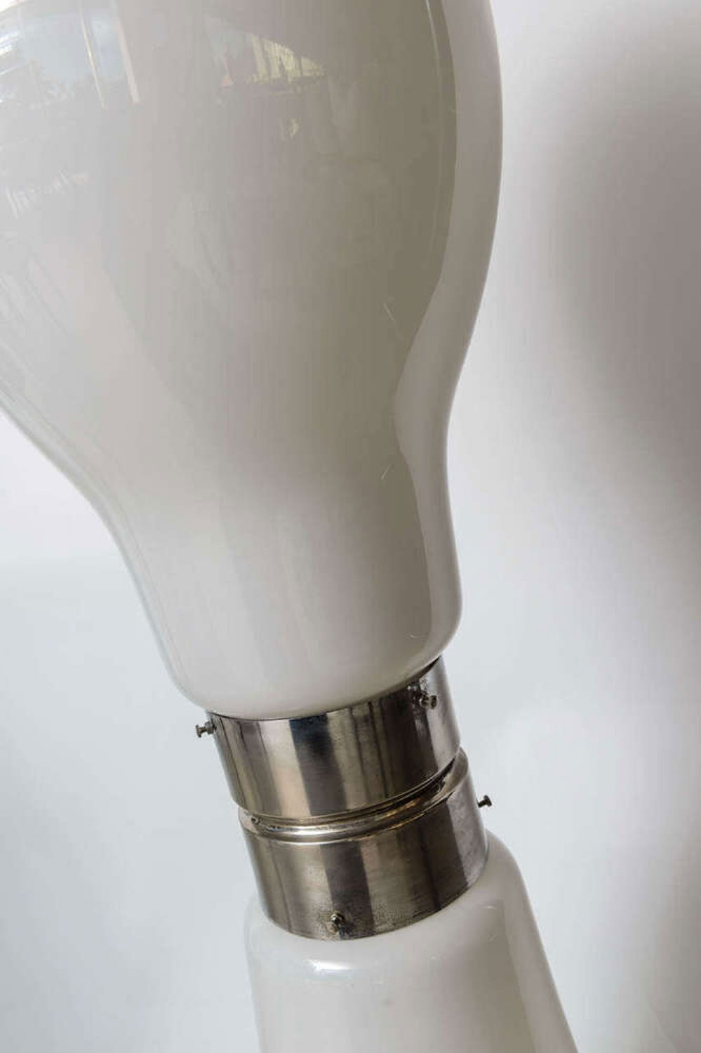 Mid-Century American Modern (1960s) "Light Bulb" design floor lamp comprised of two white glass sections with a silver metal joining band. (JOE COLOMBO).