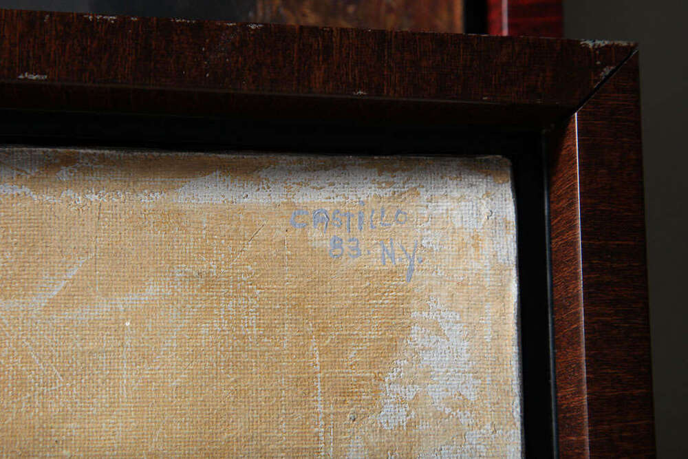 Spanish Contemporary oil painting of a stylized still life of fruit resting on a pedestal in a black frame (signed: [Jorge] CASTILLO 83 NY)