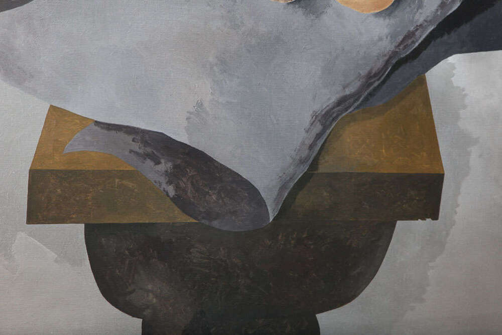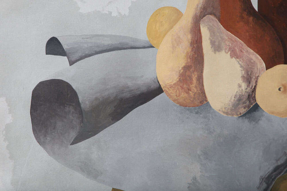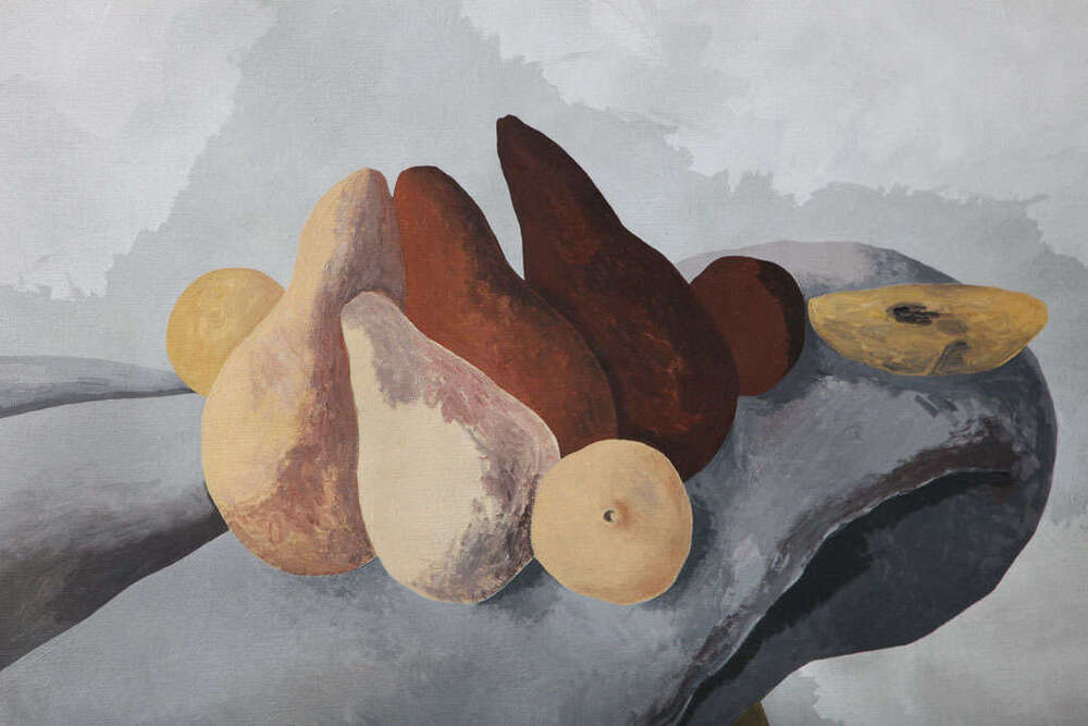 Spanish Contemporary oil painting of a stylized still life of fruit resting on a pedestal in a black frame (signed: [Jorge] CASTILLO 83 NY).