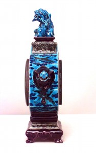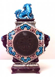 French (Mid-19th Century) Chinoiserie design faience 6-sided mantel clock with foo dog top and elephant heads on sides. (by JULES VIEILLARD, Bordeau France) (Not working)