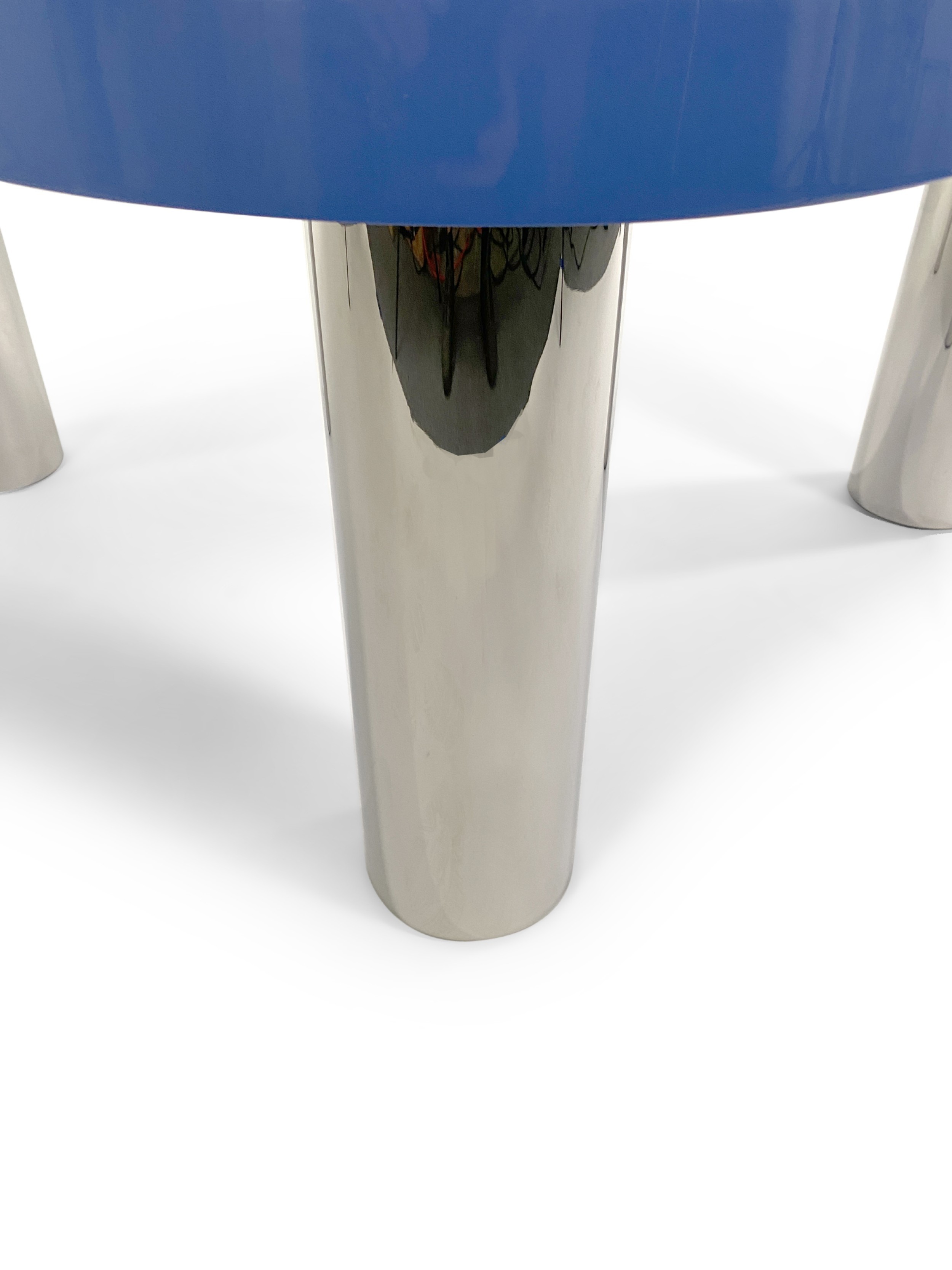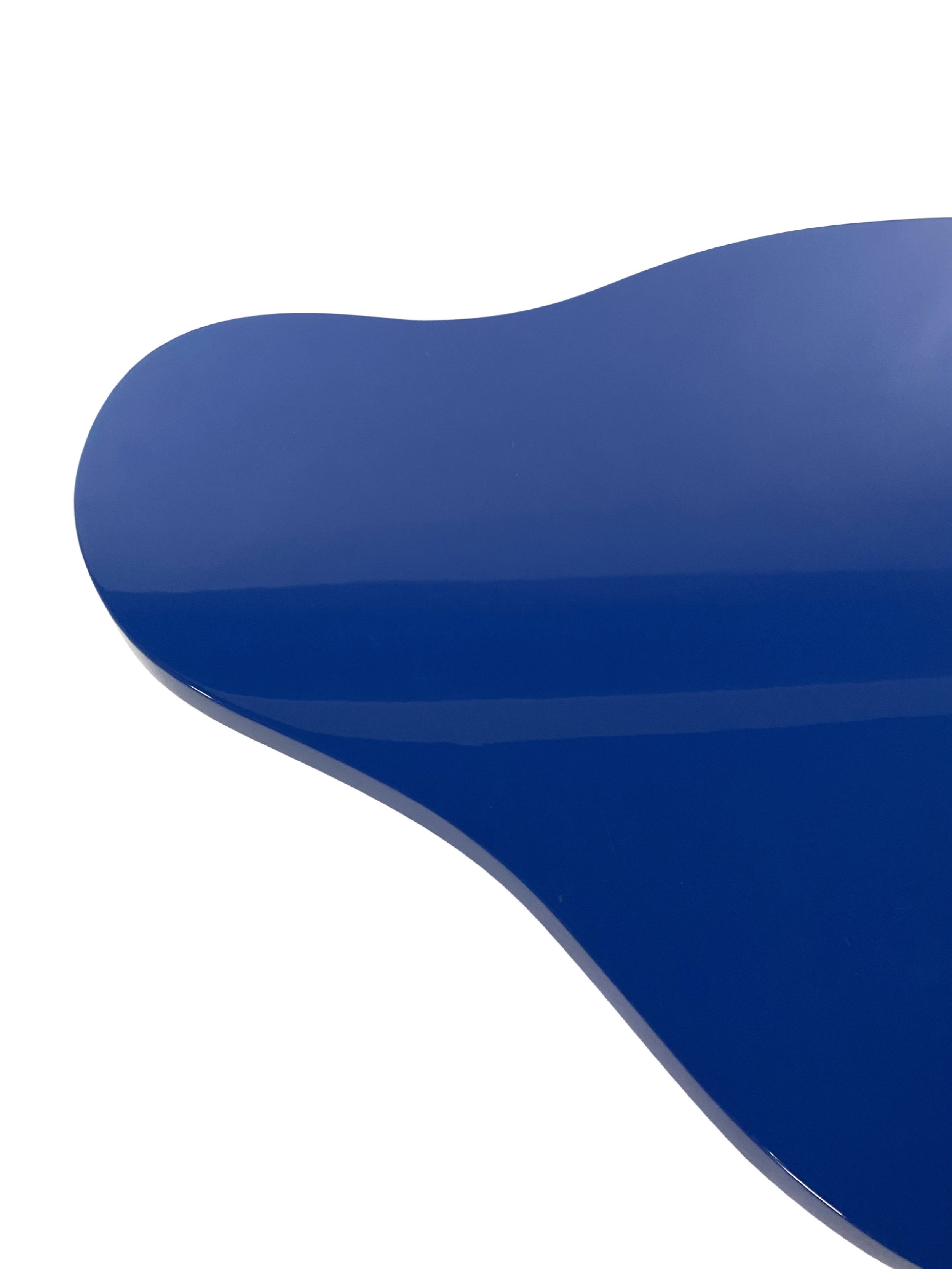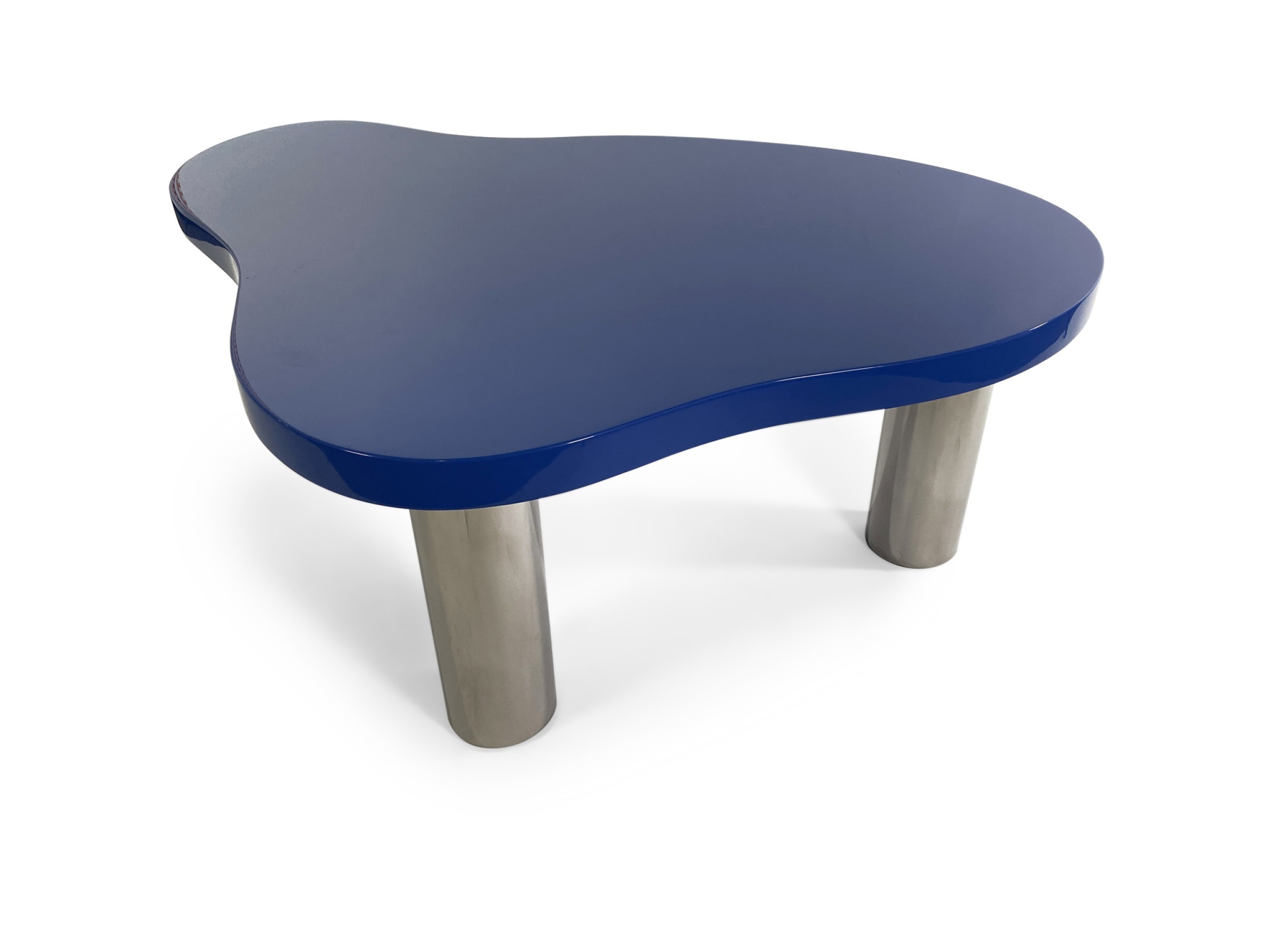 Contemporary American biomorphic "Royale" coffee table with a uniquely-shaped top painted in blue and finished in a high sheen lacquer, resting on three substantial cylindrical stainless steel legs. (KARL SPRINGER LTD). This piece is made to order to your very own specifications. Please inquire for pricing. This item can also be purchased as pictured (see REC5372).