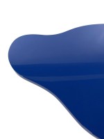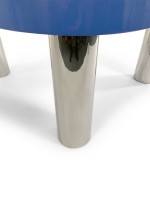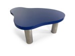 Contemporary American biomorphic "Royale" coffee table with a uniquely-shaped top painted in blue and finished in a high sheen lacquer, resting on three substantial cylindrical stainless steel legs. (KARL SPRINGER LTD). This piece is made to order to your very own specifications. Please inquire for pricing. This item can also be purchased as pictured (see REC5372)..