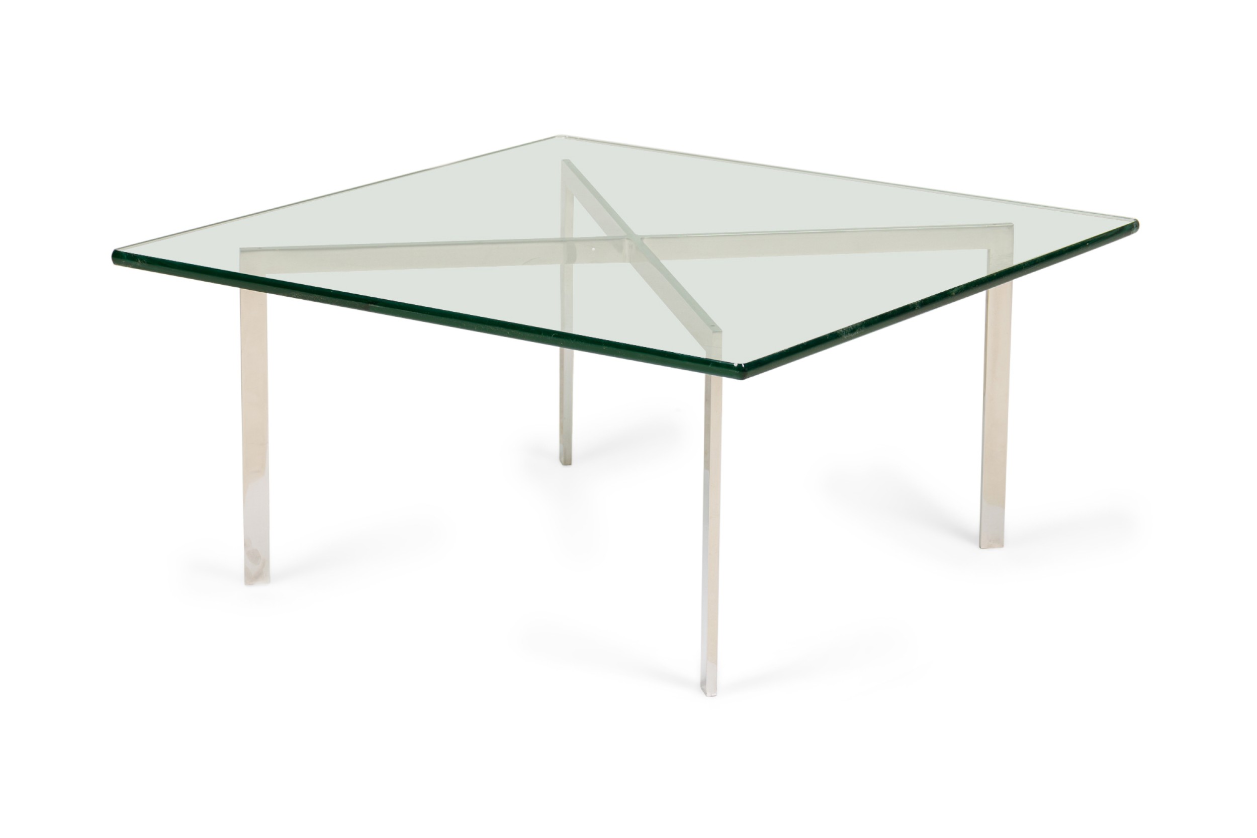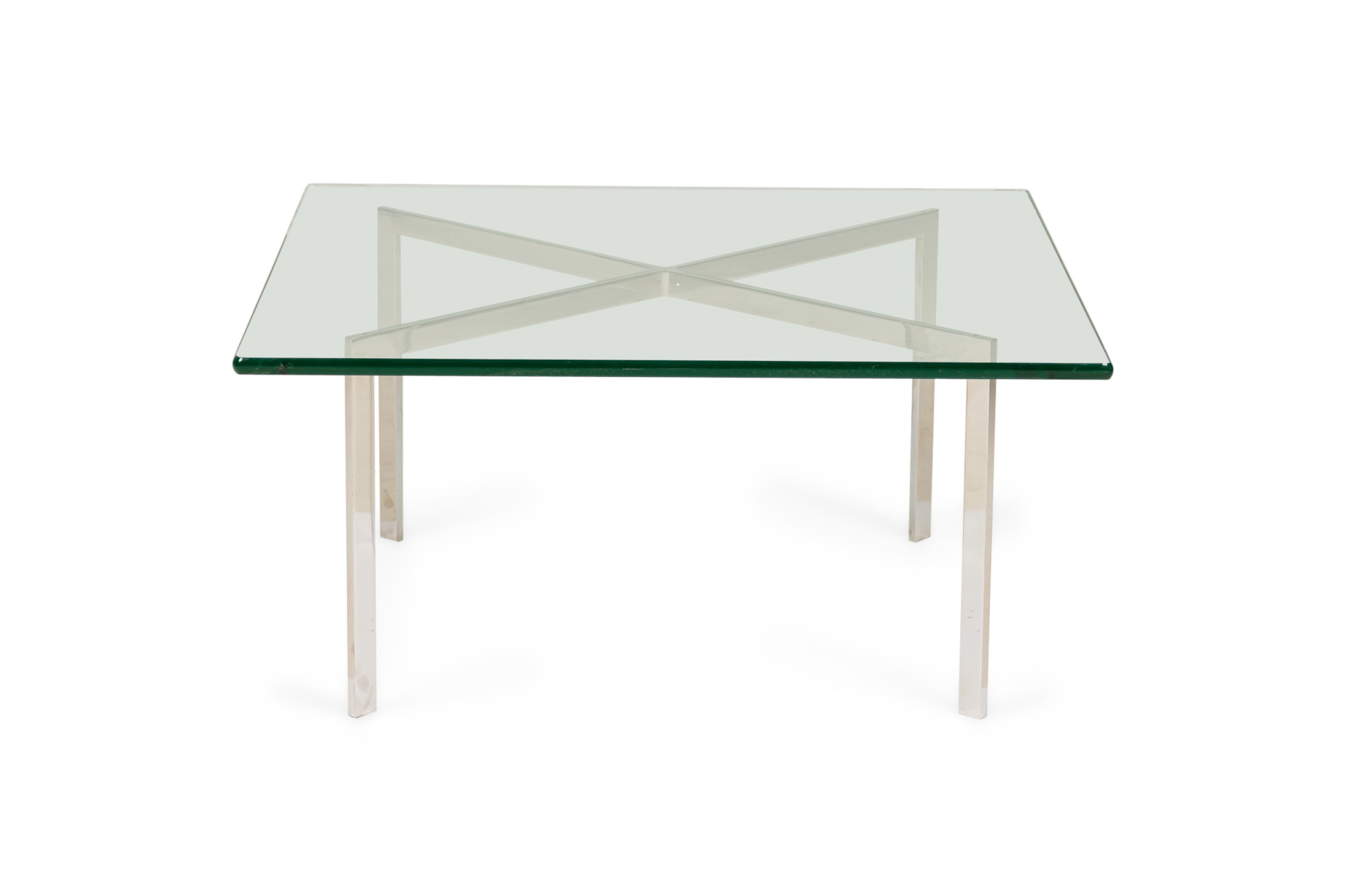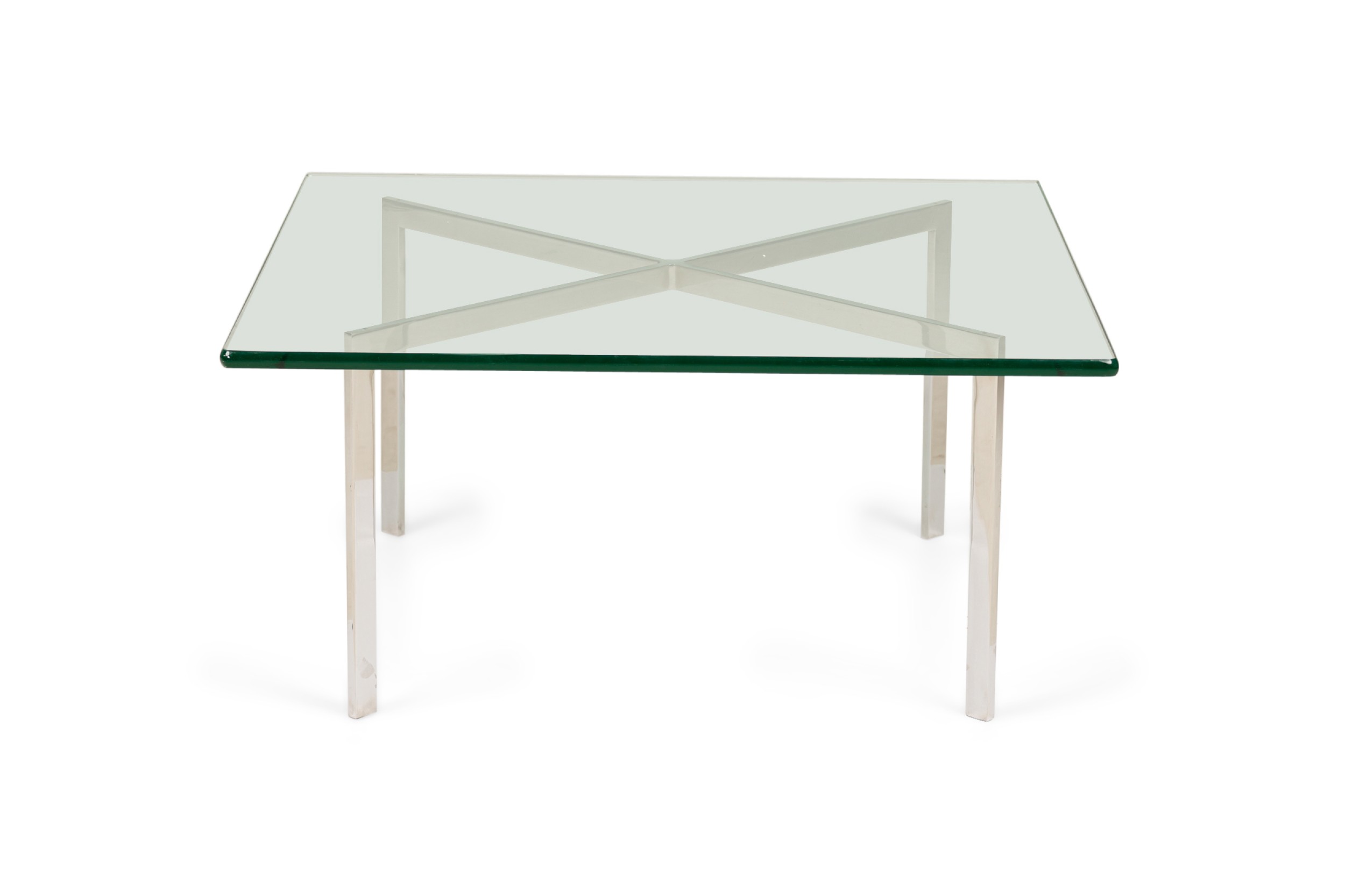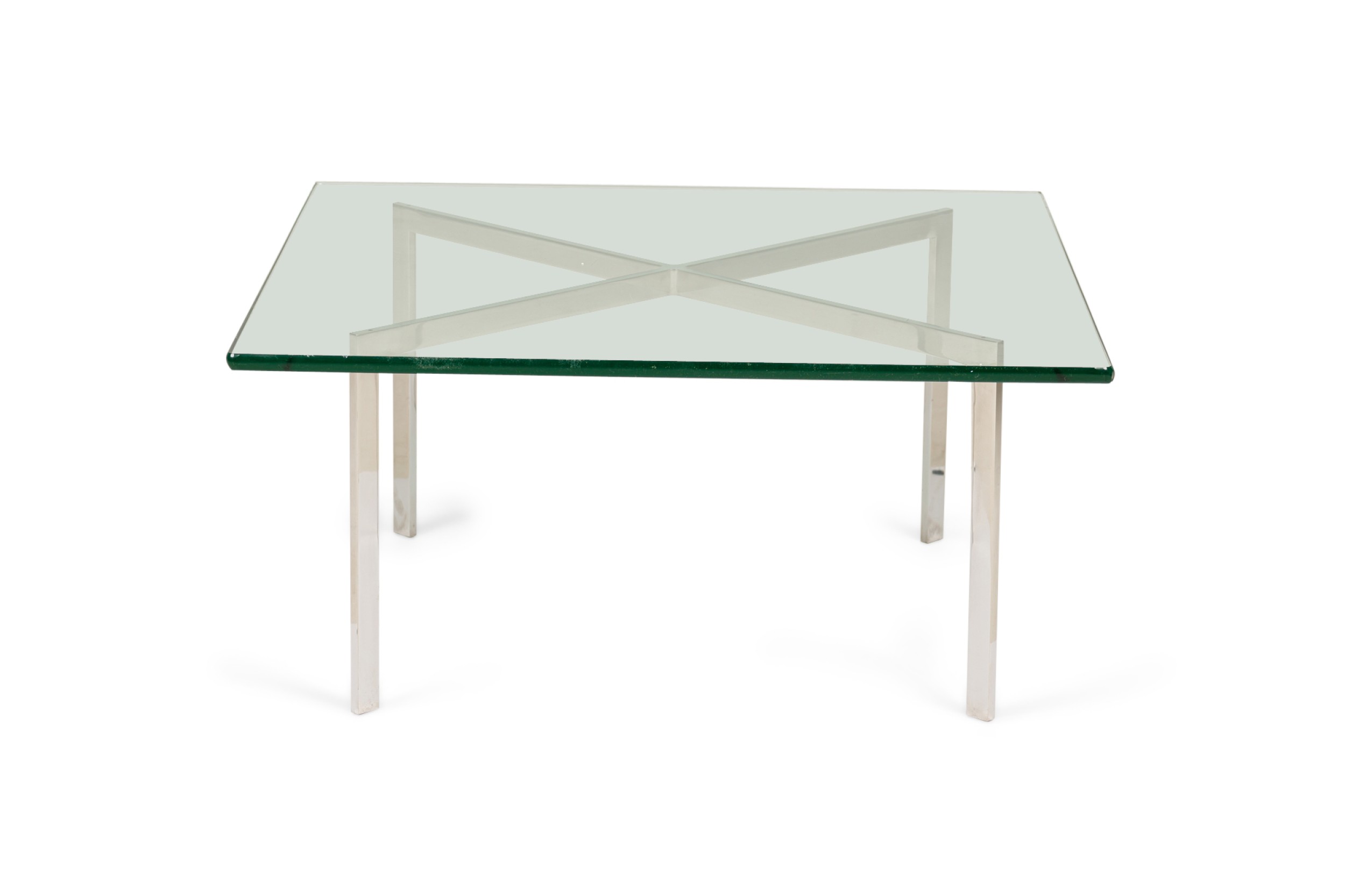 American Mid-Century "Barcelona" stainless steel chrome square coffee table with an "X" design under a glass top (KP (Knoll Products) stamp on the frame's underside; MIES VAN DER ROHE for KNOLL).