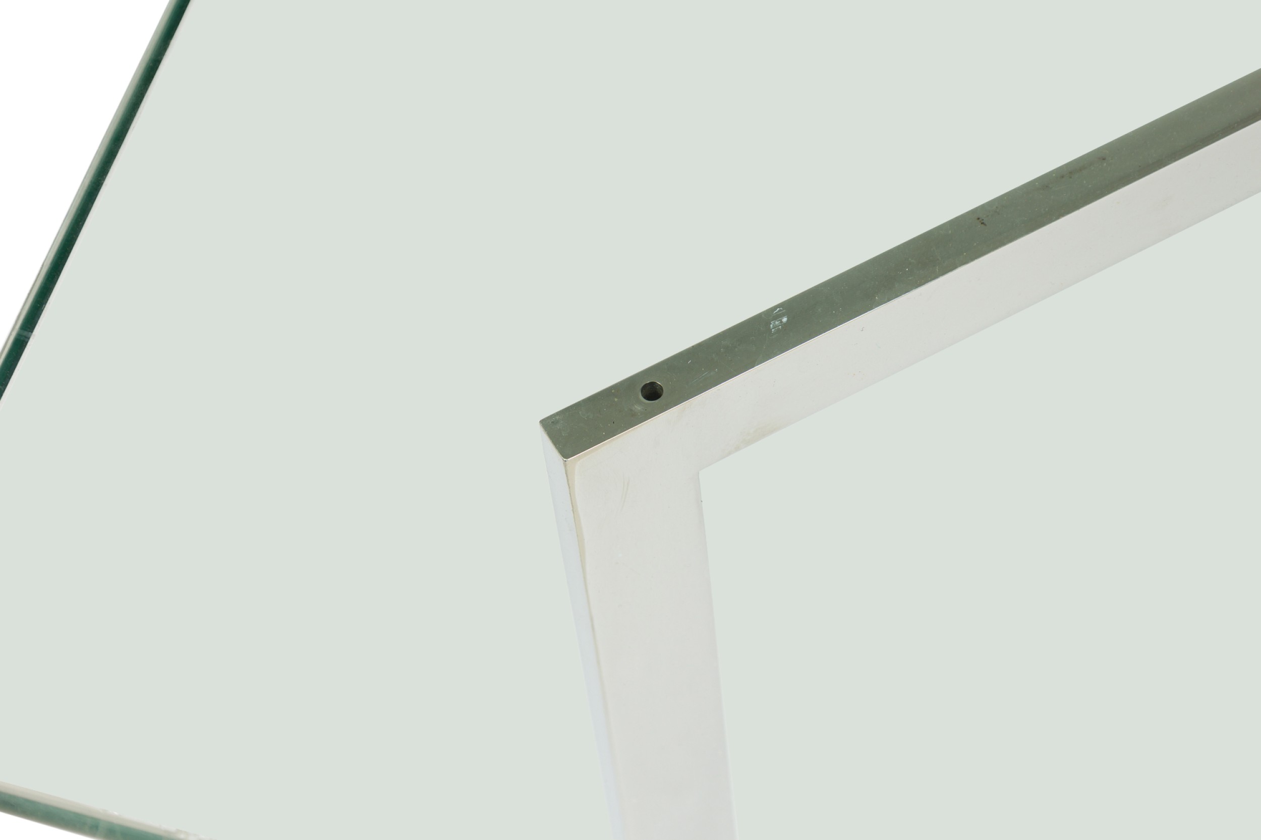American Mid-Century "Barcelona" stainless steel chrome square coffee table with an "X" design under a glass top (KP (Knoll Products) stamp on the frame's underside; MIES VAN DER ROHE for KNOLL)