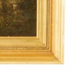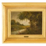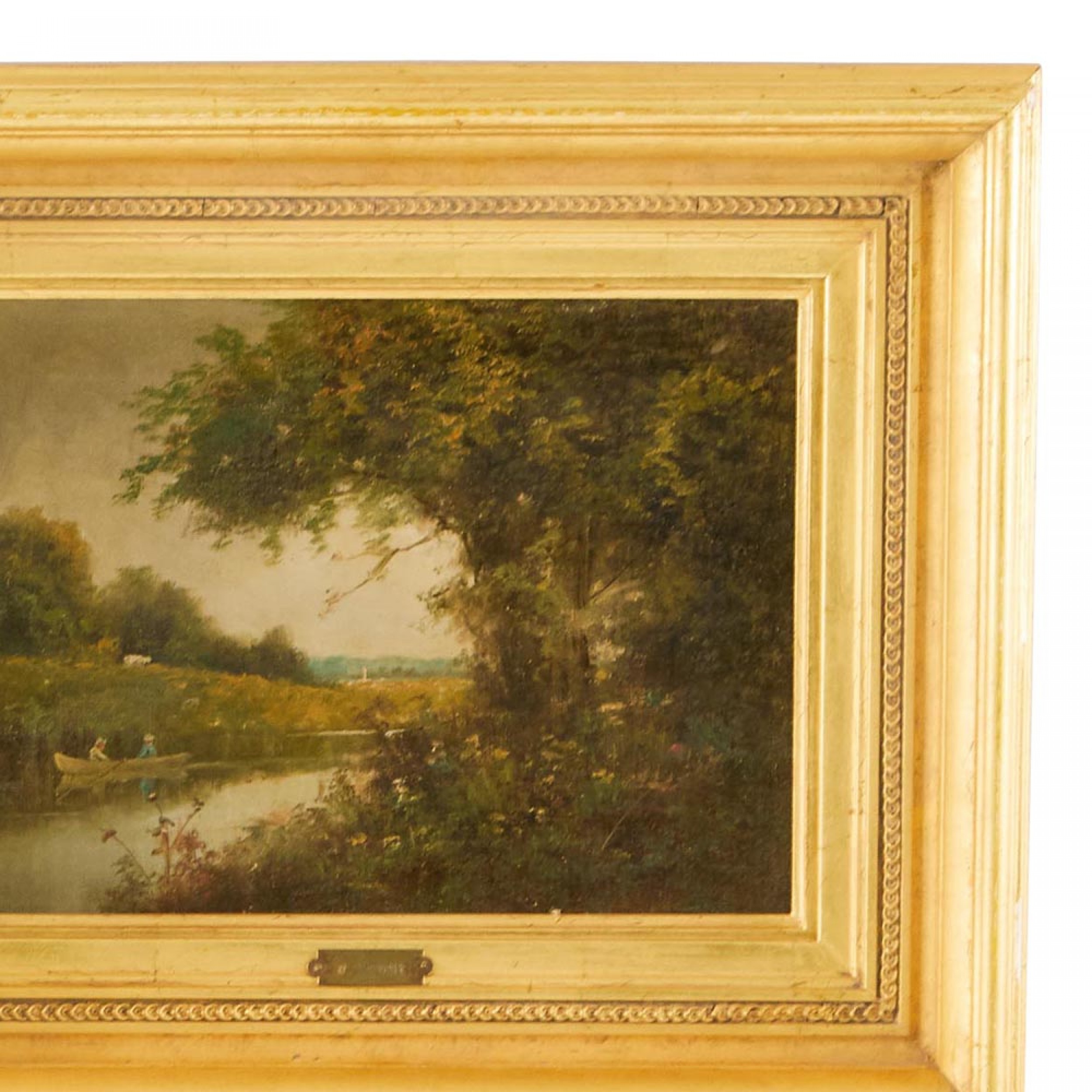 English Victorian (19th/20th-Cent) landscape pastoral scene of rowers on a stream. Oil on canvas in a carved gilt wood frame.