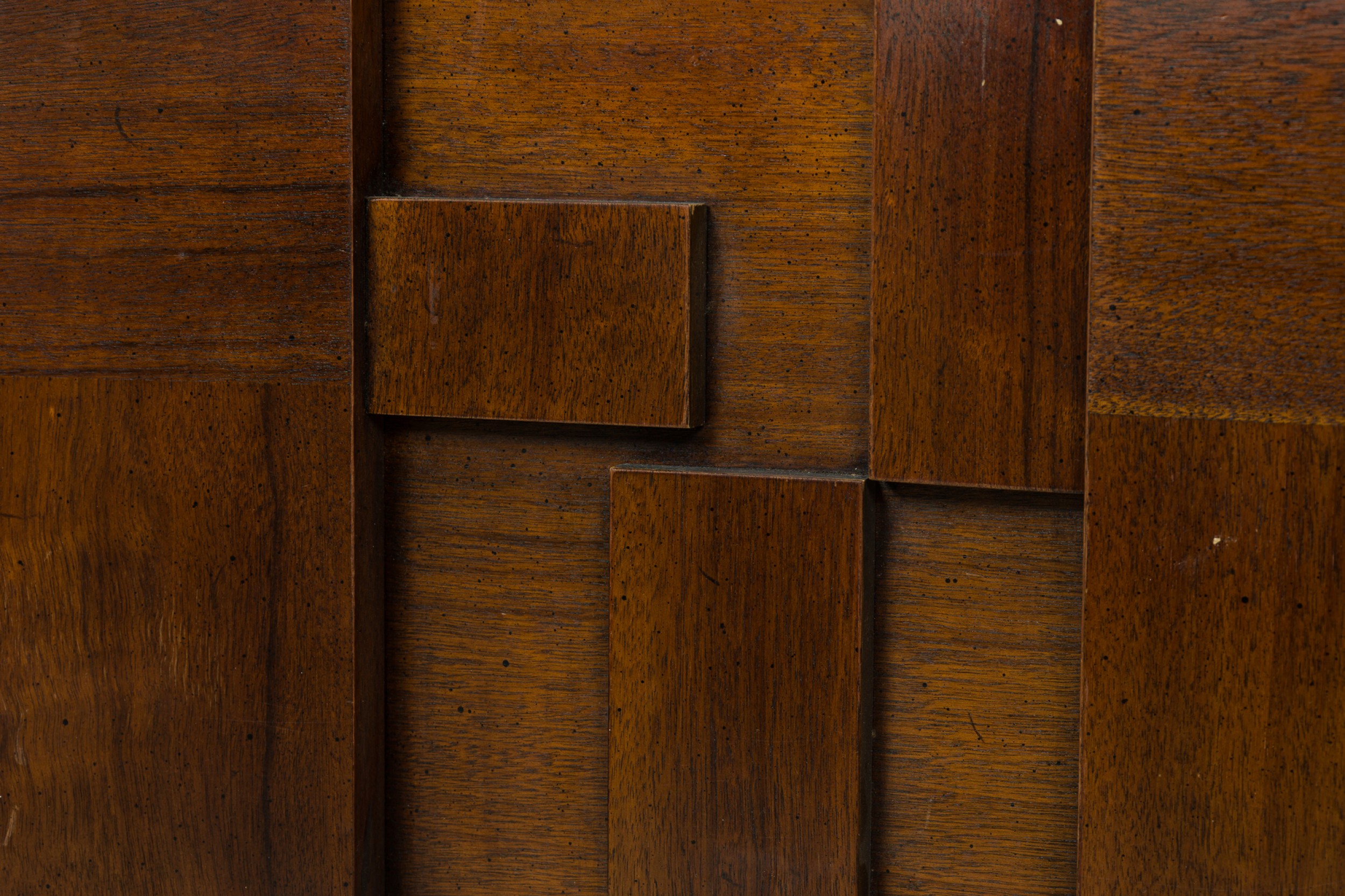 American Mid-Century queen-size cubist design mahogny headboard having a geometric design of squares and rectangles (LANE FURNITURE)