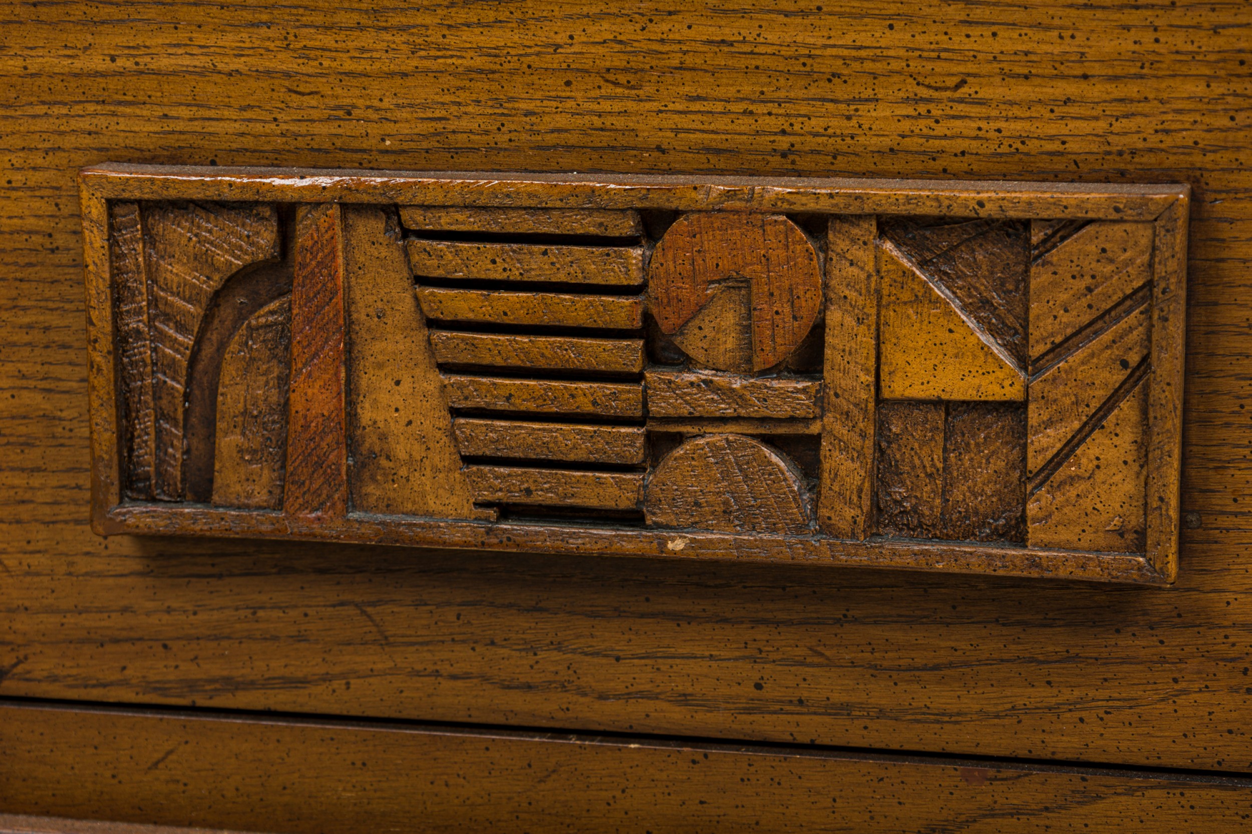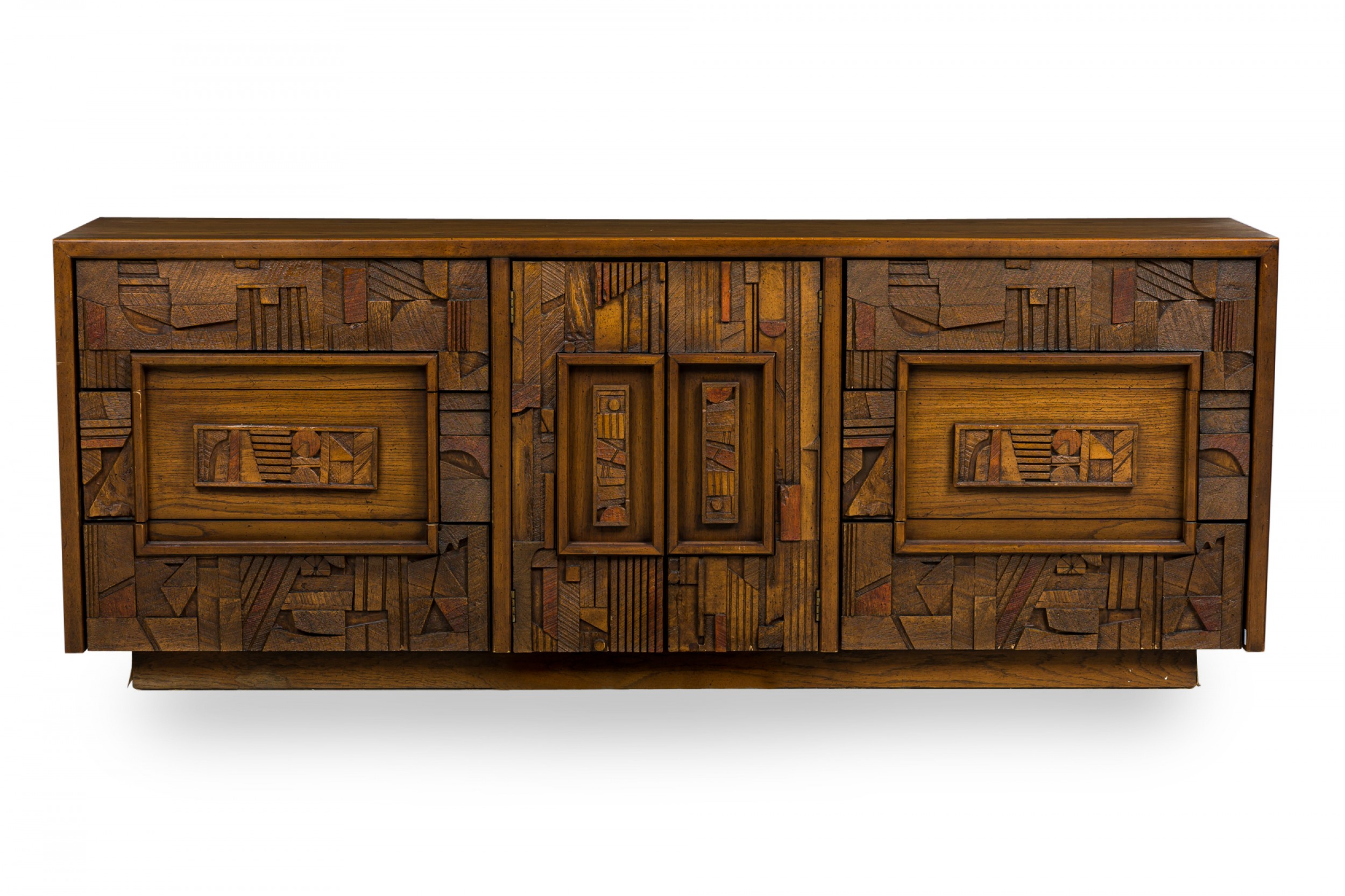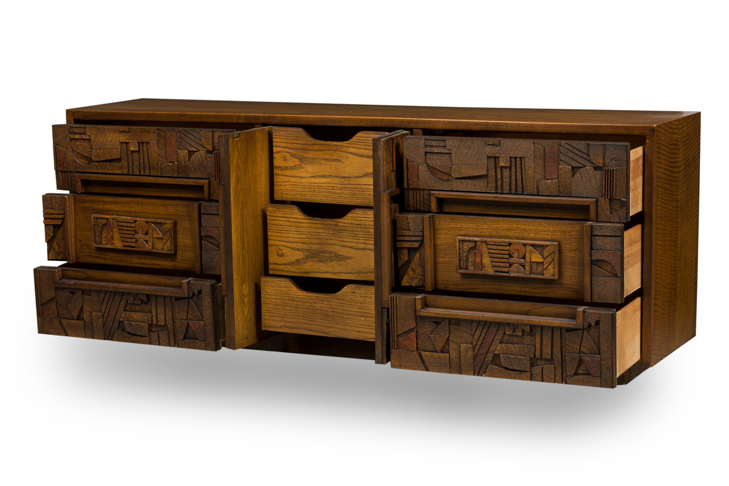 Mid-Century American Modern (1960s) "Brutalist" credenza / sideboard / dresser with three sets of drawers on either side centering two cabinet doors that open to reveal three interior drawers, all with elaborately geometrically carved drawer fronts. (LANE FURNITURE).