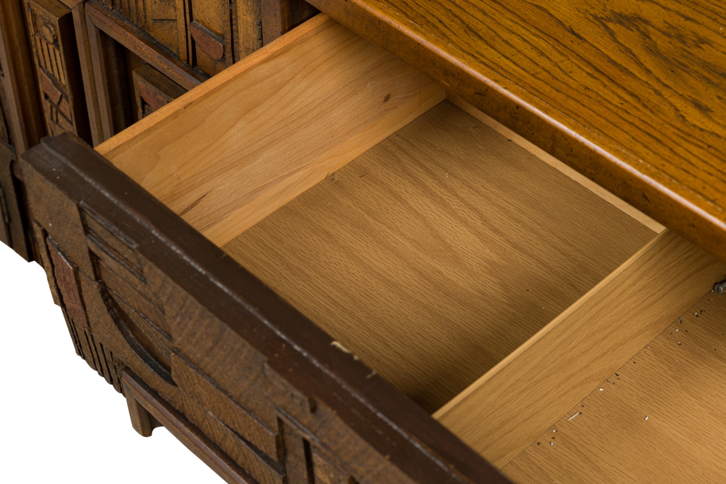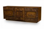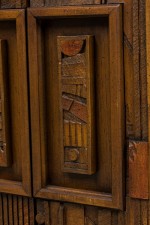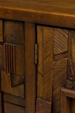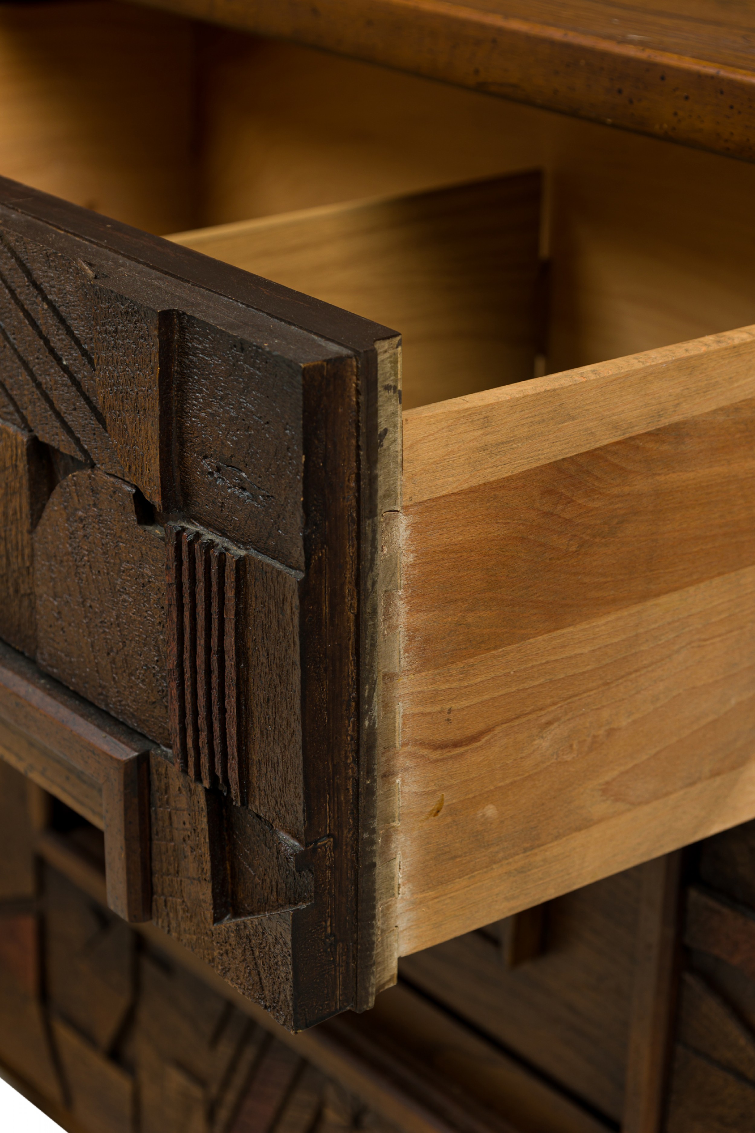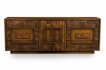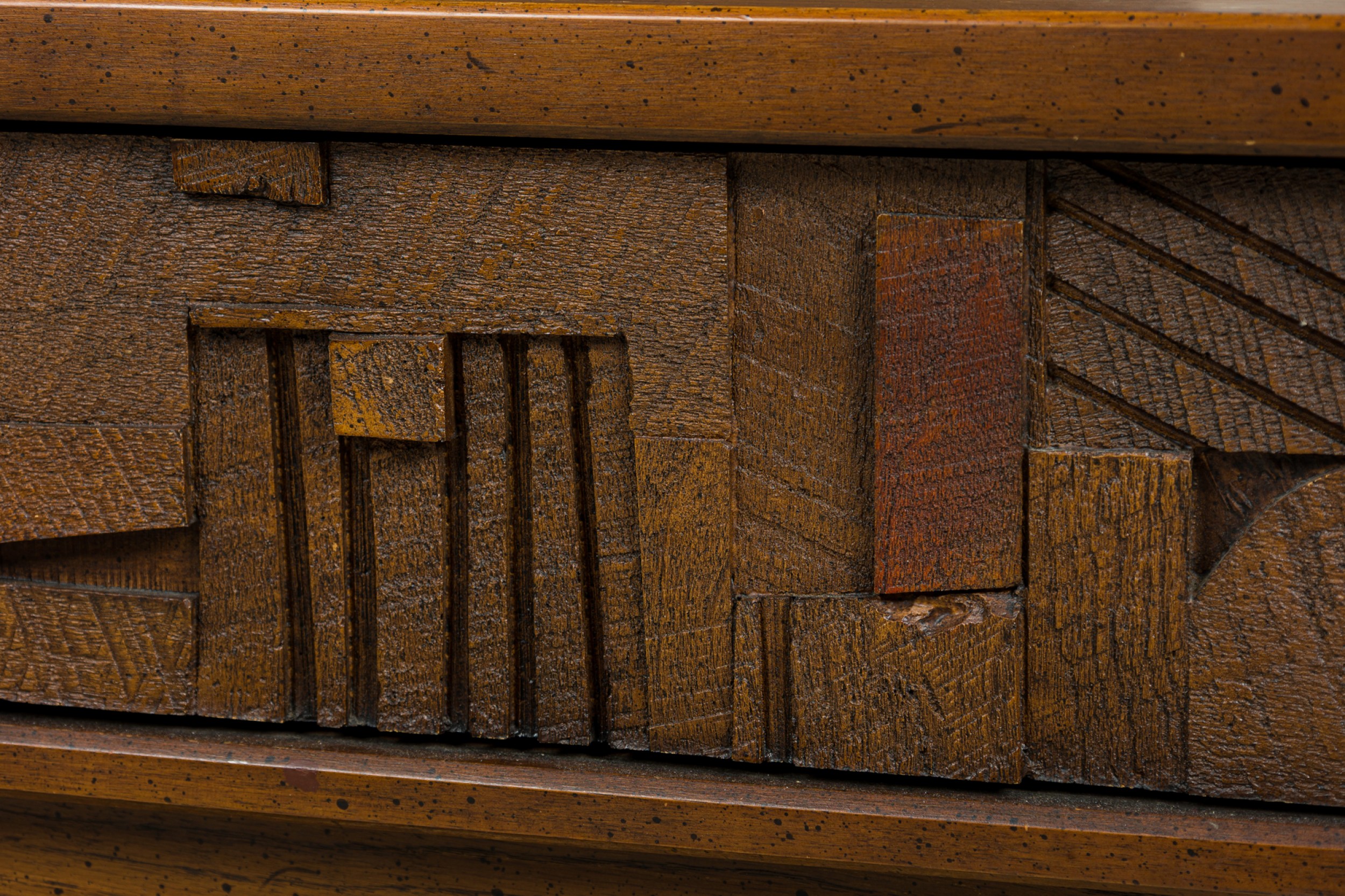 Mid-Century American Modern (1960s) "Brutalist" credenza / sideboard / dresser with three sets of drawers on either side centering two cabinet doors that open to reveal three interior drawers, all with elaborately geometrically carved drawer fronts. (LANE FURNITURE).