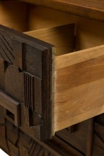 Mid-Century American Modern (1960s) "Brutalist" credenza / sideboard / dresser with three sets of drawers on either side centering two cabinet doors that open to reveal three interior drawers, all with elaborately geometrically carved drawer fronts. (LANE FURNITURE)