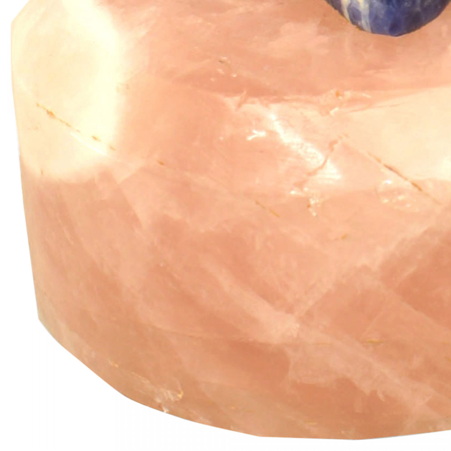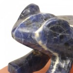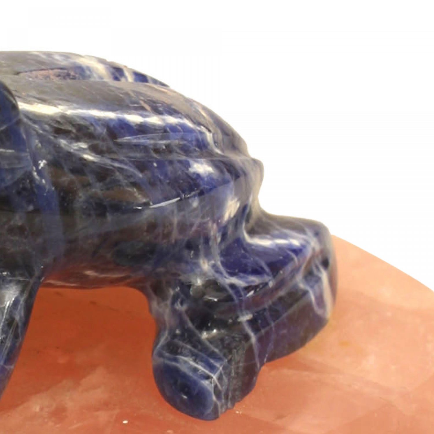 Modern lapis frog figure standing on an oval pink quartz base.
