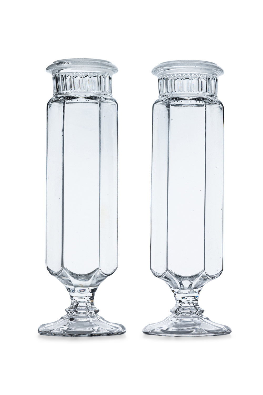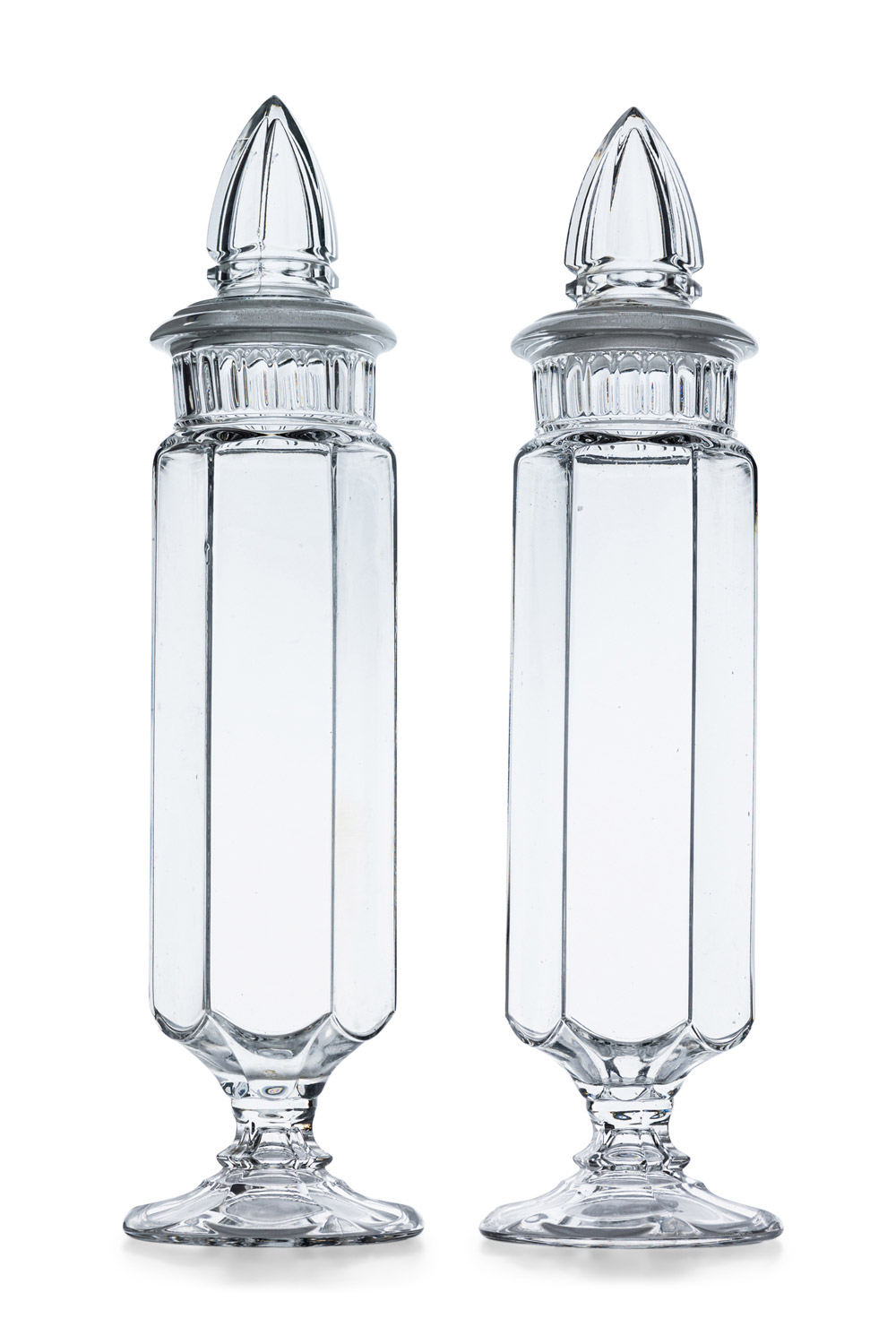 6 American Country-style glass 6 sided apothecary jars with stopper (PRICED EACH).