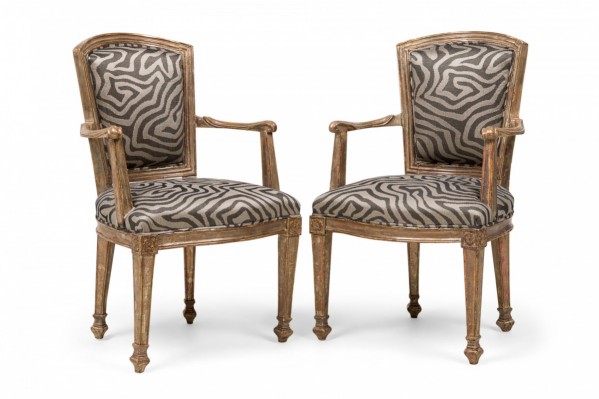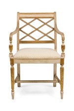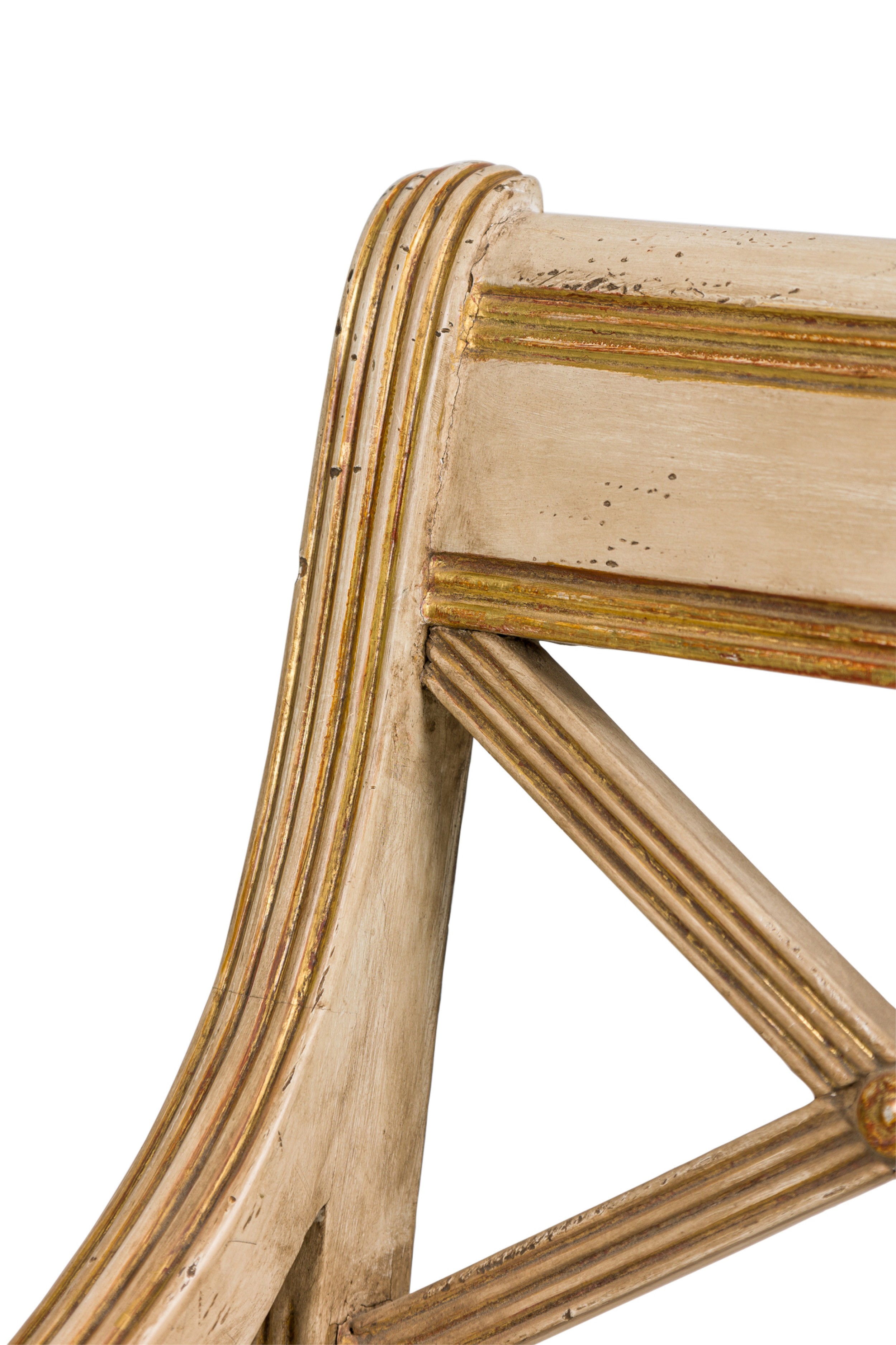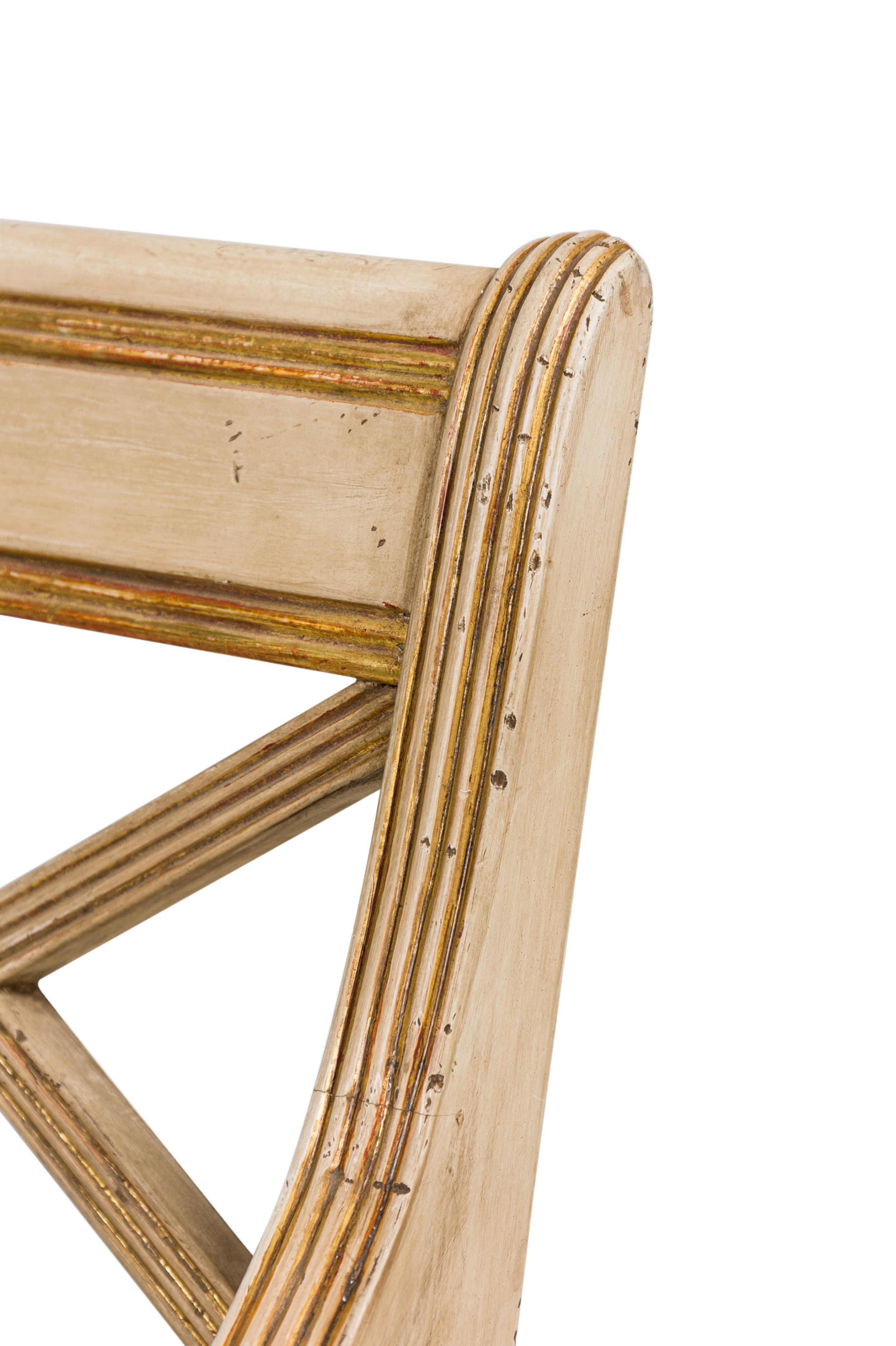 Italian Neo-Classic style (20th Century) cream painted and gilt trim armchair with fluted legs and open geomegtric diamond "X" design back with a stretcher and an off-white uphostered slip seat (matching side chair: REG9090A).