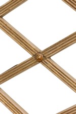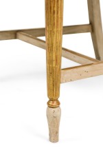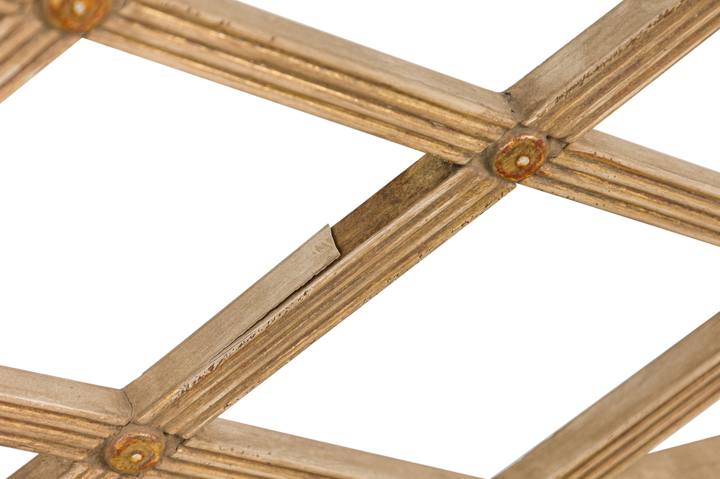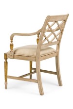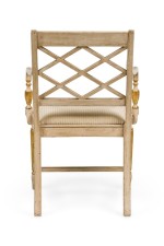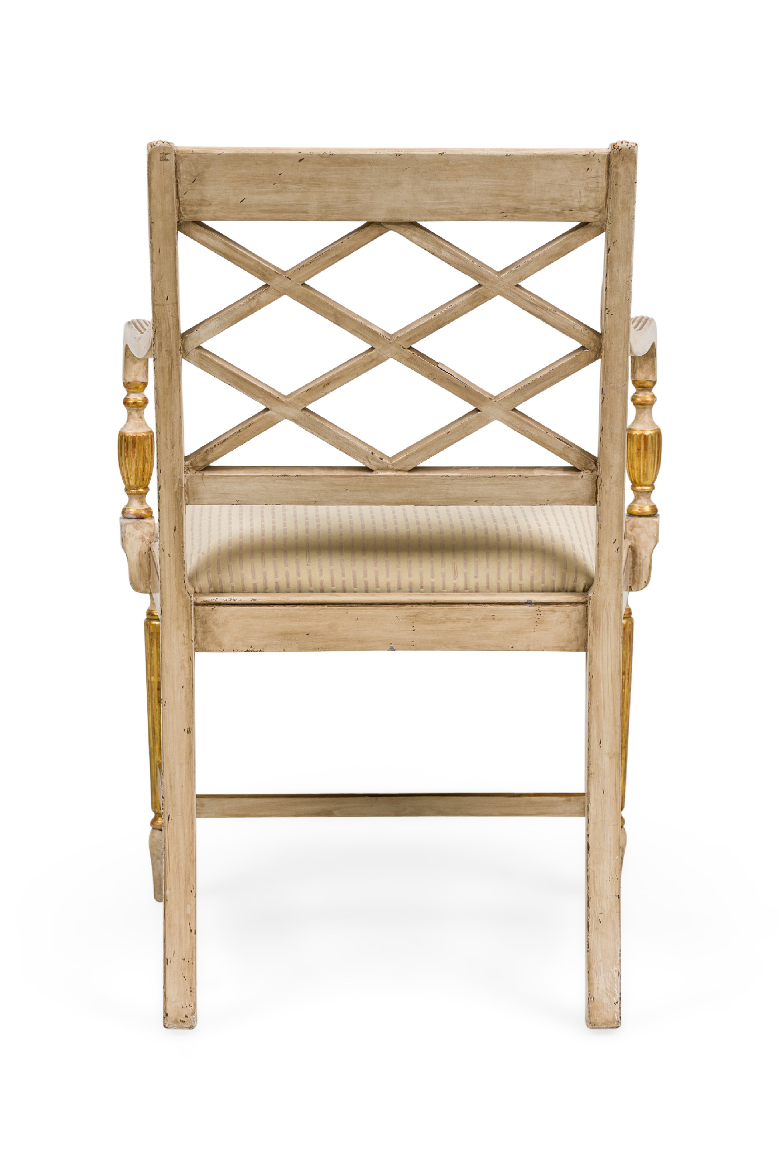Italian Neo-Classic style (20th Century) cream painted and gilt trim armchair with fluted legs and open geomegtric diamond "X" design back with a stretcher and an off-white uphostered slip seat (matching side chair: REG9090A)