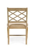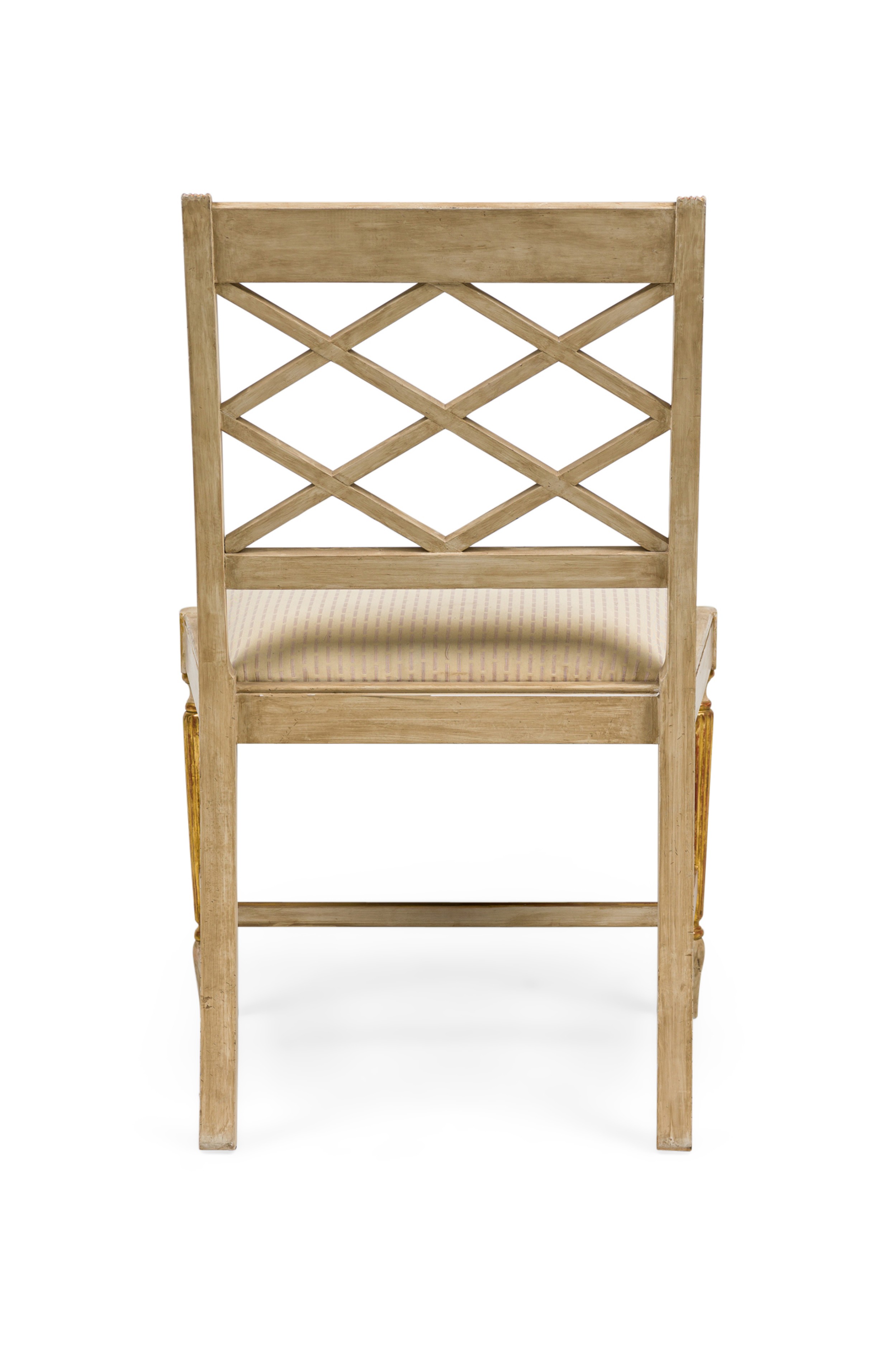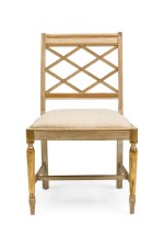 Italian Neo-Classic style (20th Century) cream painted and gilt trim side chair with fluted legs and open geomegtric diamond "X" design back with a stretcher and 0ff-white upholstered slip seat (matching armchair: REG9090).