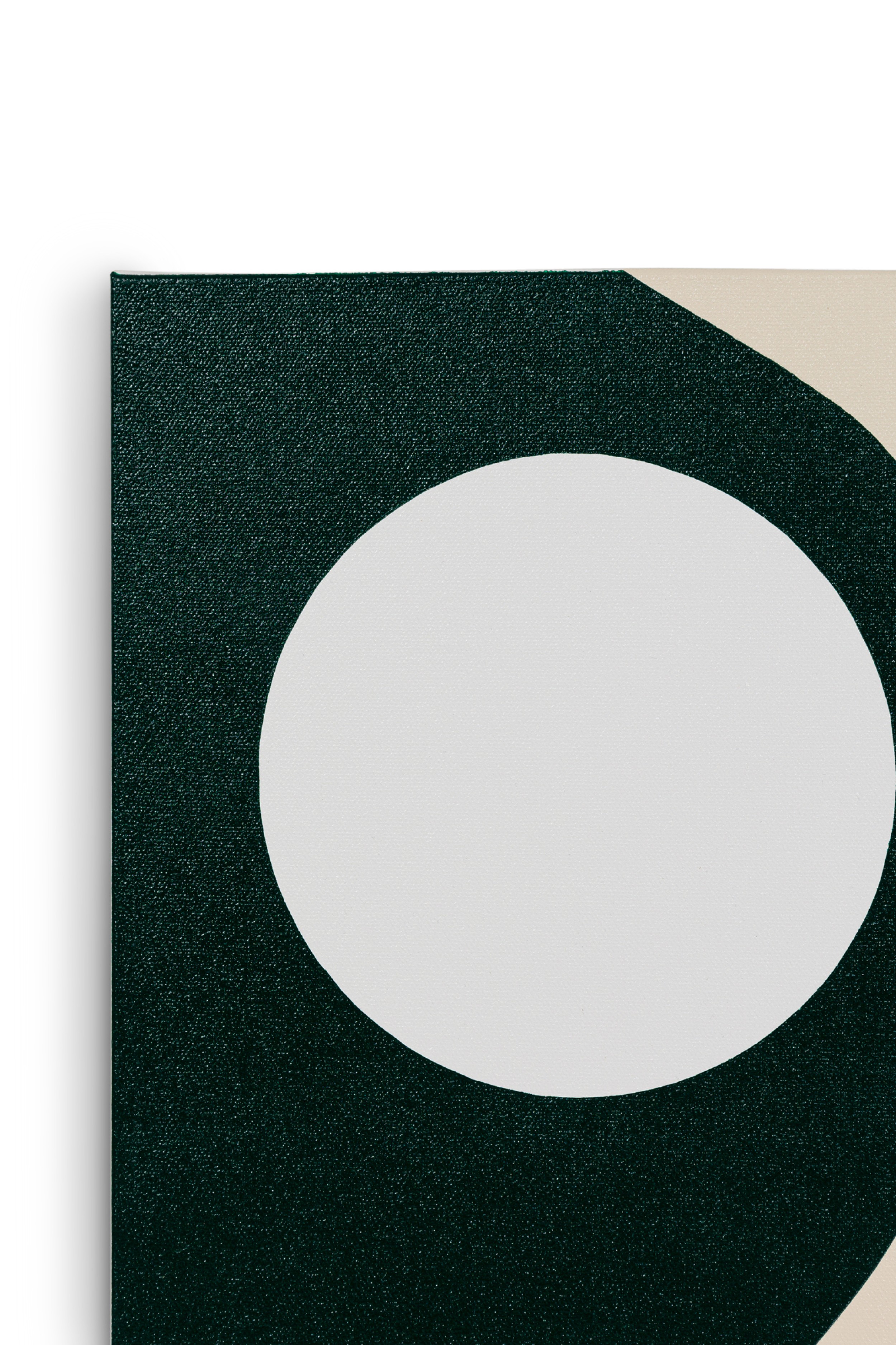 American contemporary abstract composition of a grey background with a green and pink round shape on opposite ends with a grey circle in both, acylic on canvas (LARRY BENTLEY).