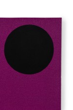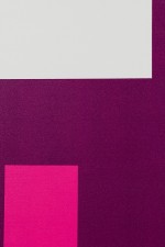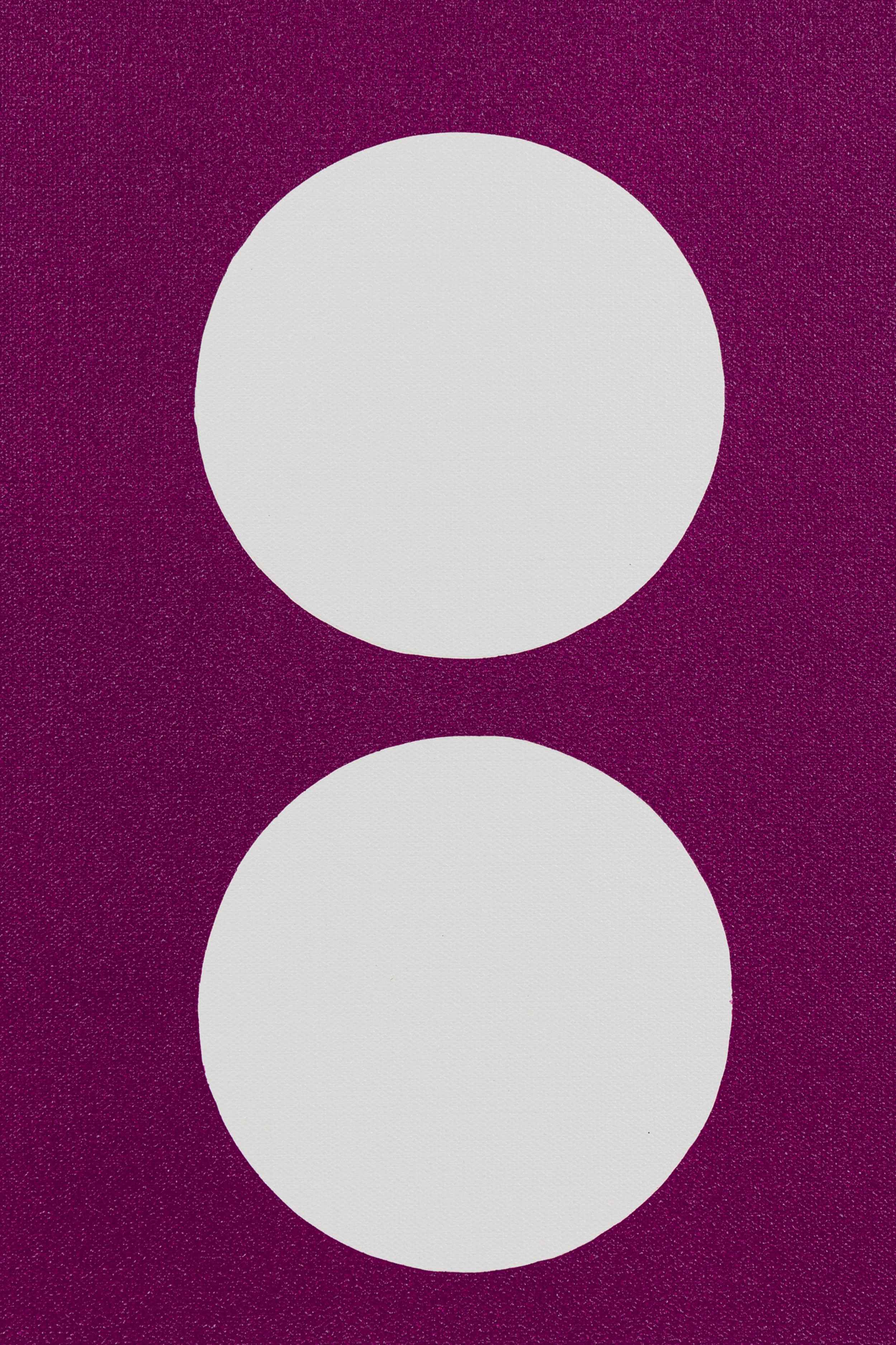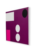 American contemporary abstract composition of a purple background with grey and pink rectangles and grey circles, acrylic on canvas