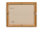 American contemporary abstract composition of geometric shapes featuring colors of purple, yellow, grey and blue, acrylic on canvas in a dark wooden gallery frame (LARRY BENTLEY).