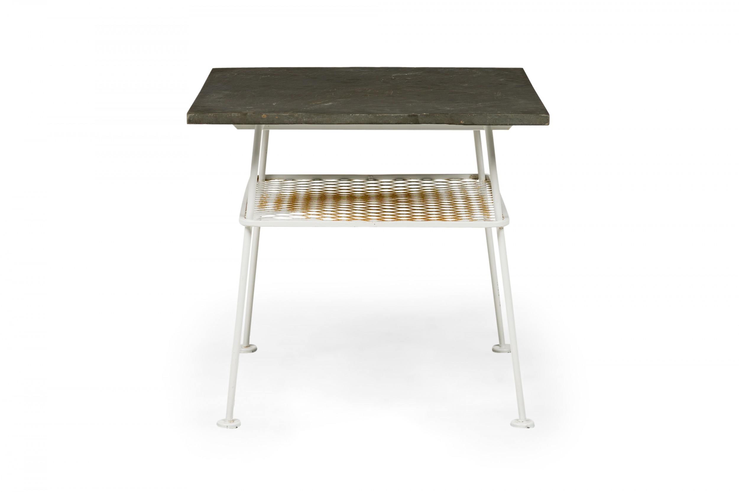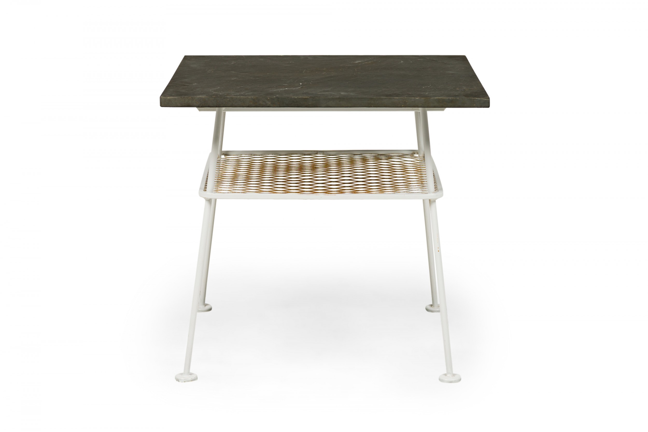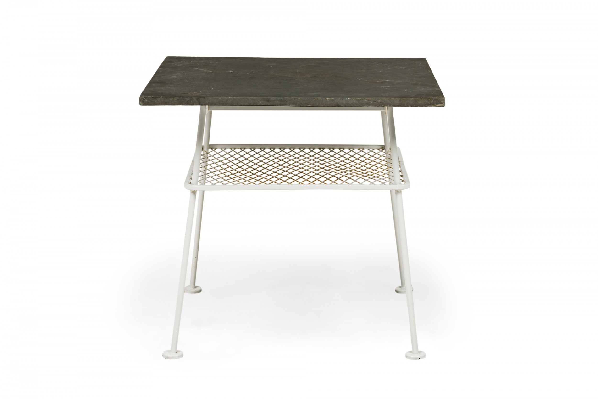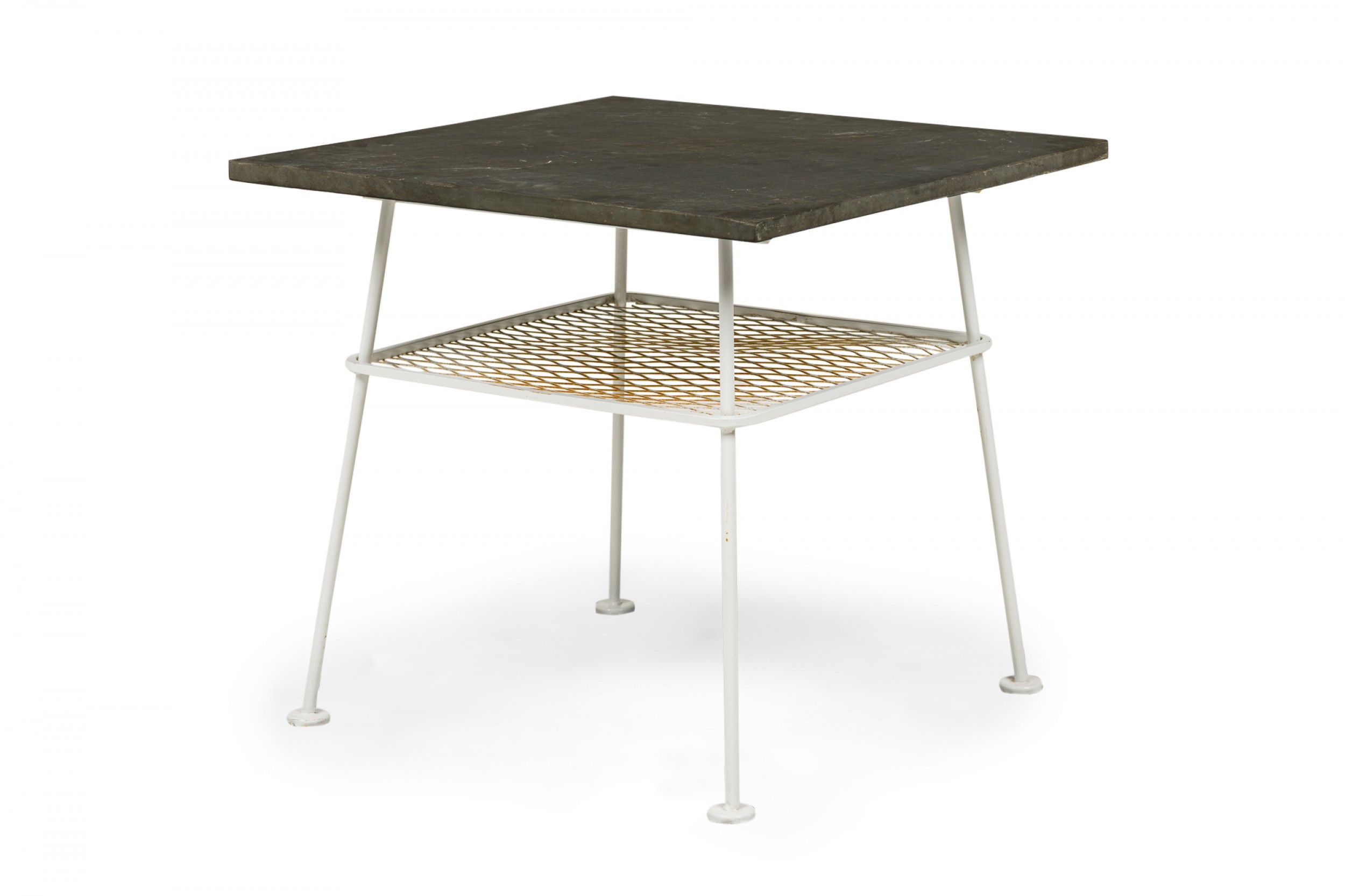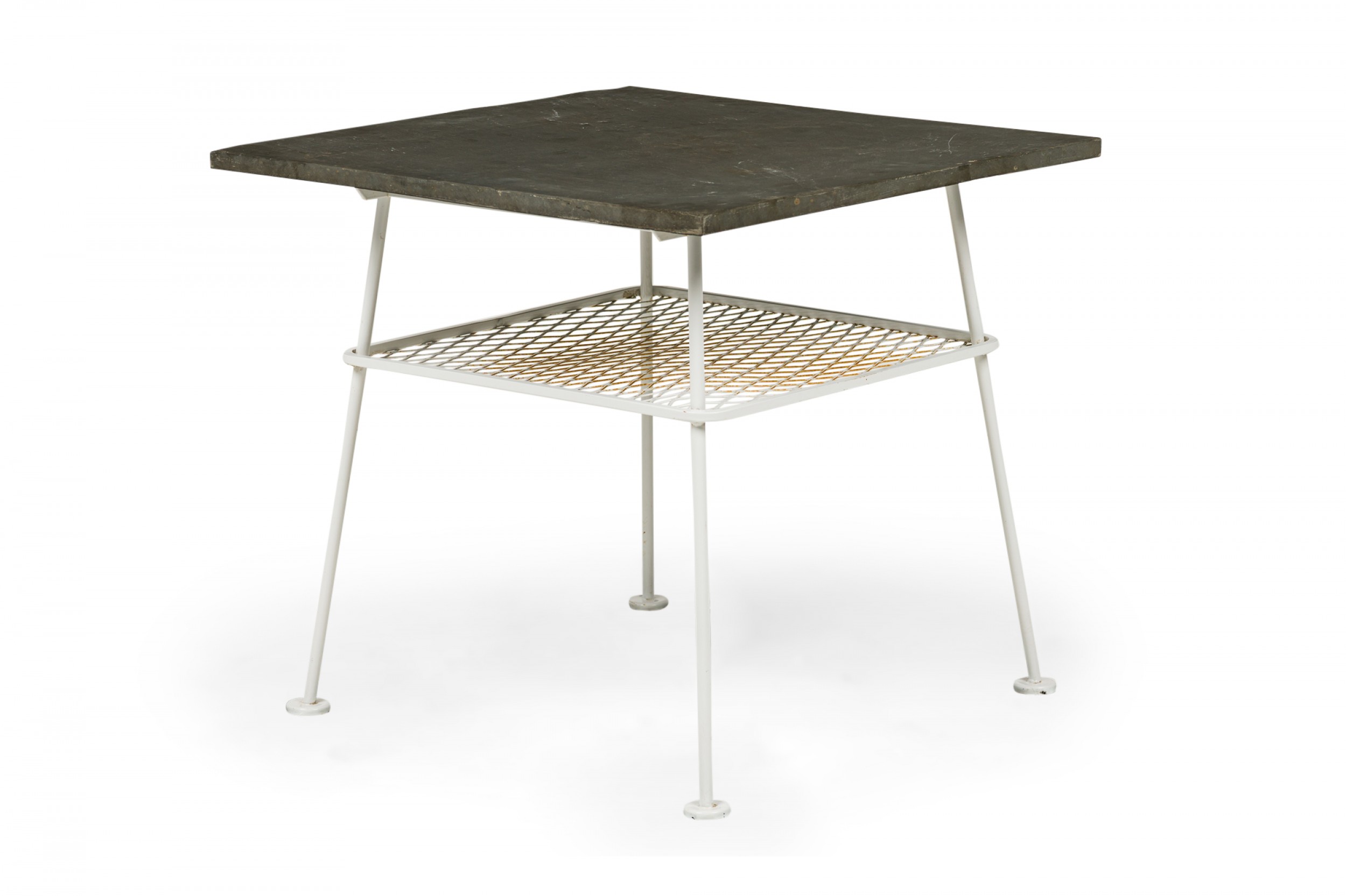 Lee L. Woodard Mid-Century American Square White Metal Lamp Table with Mesh Shelf and Slate Top