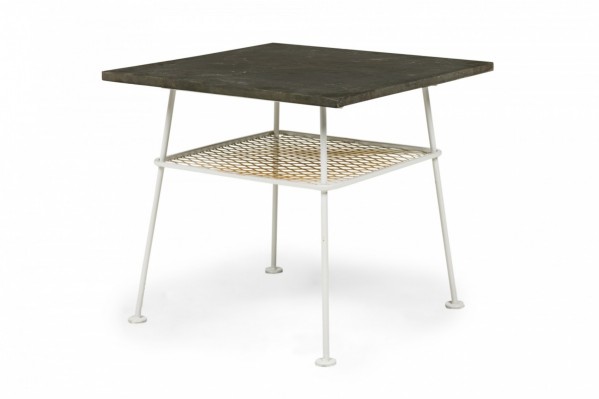 Mid-Century American square white metal, heavyweight lamp table with mesh shelf and thick, slate slab top (LEE L. WOODARD).