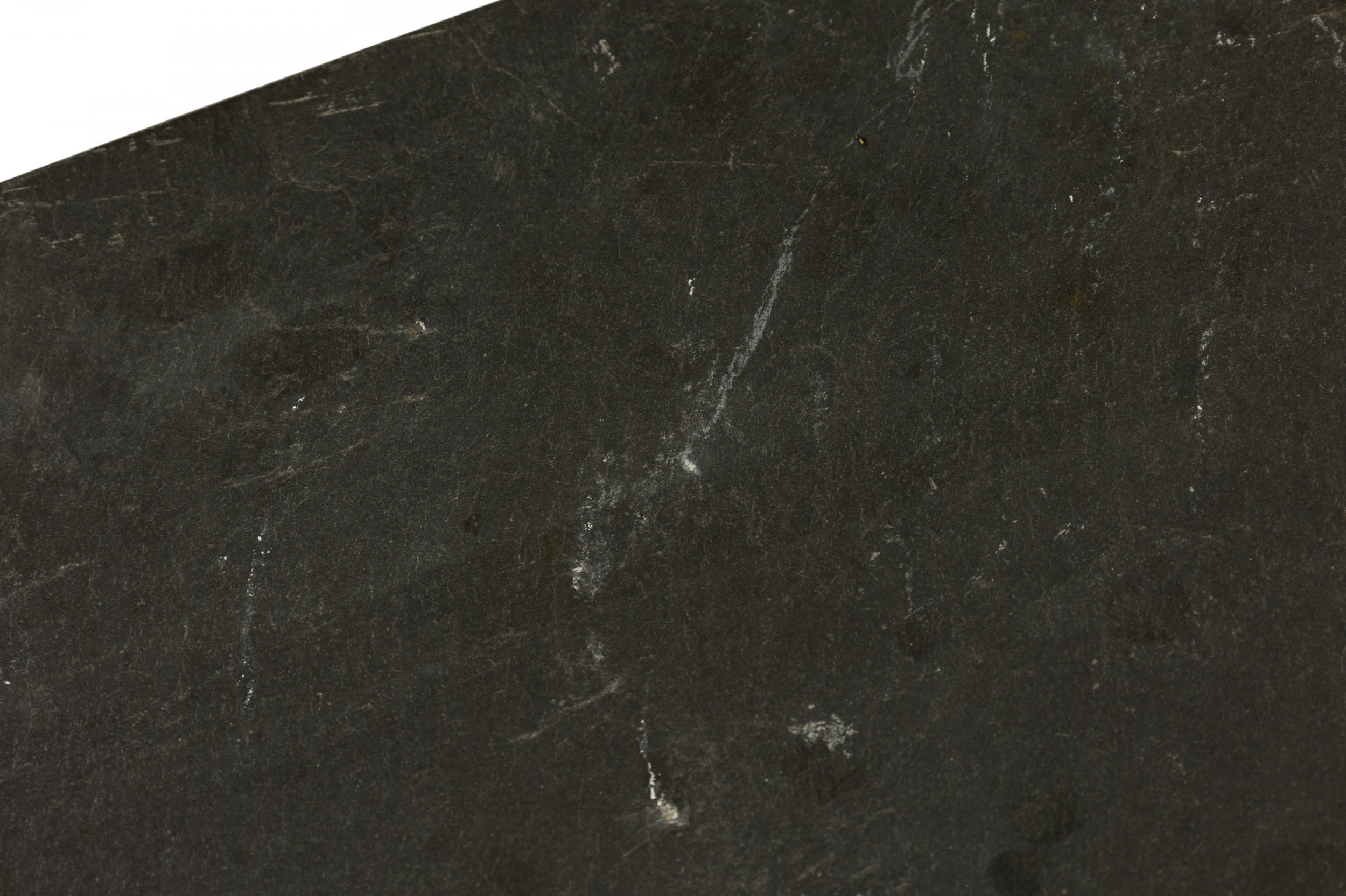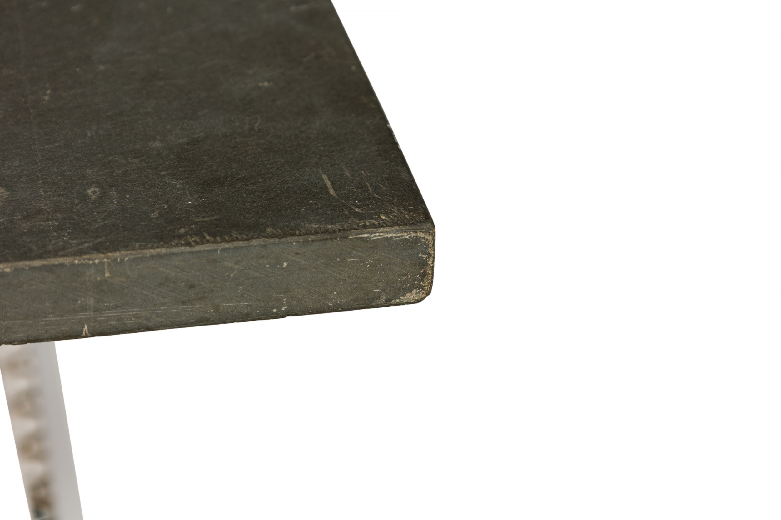 Mid-Century American square white metal, heavyweight lamp table with mesh shelf and thick, slate slab top (LEE L. WOODARD)