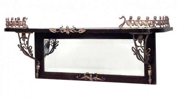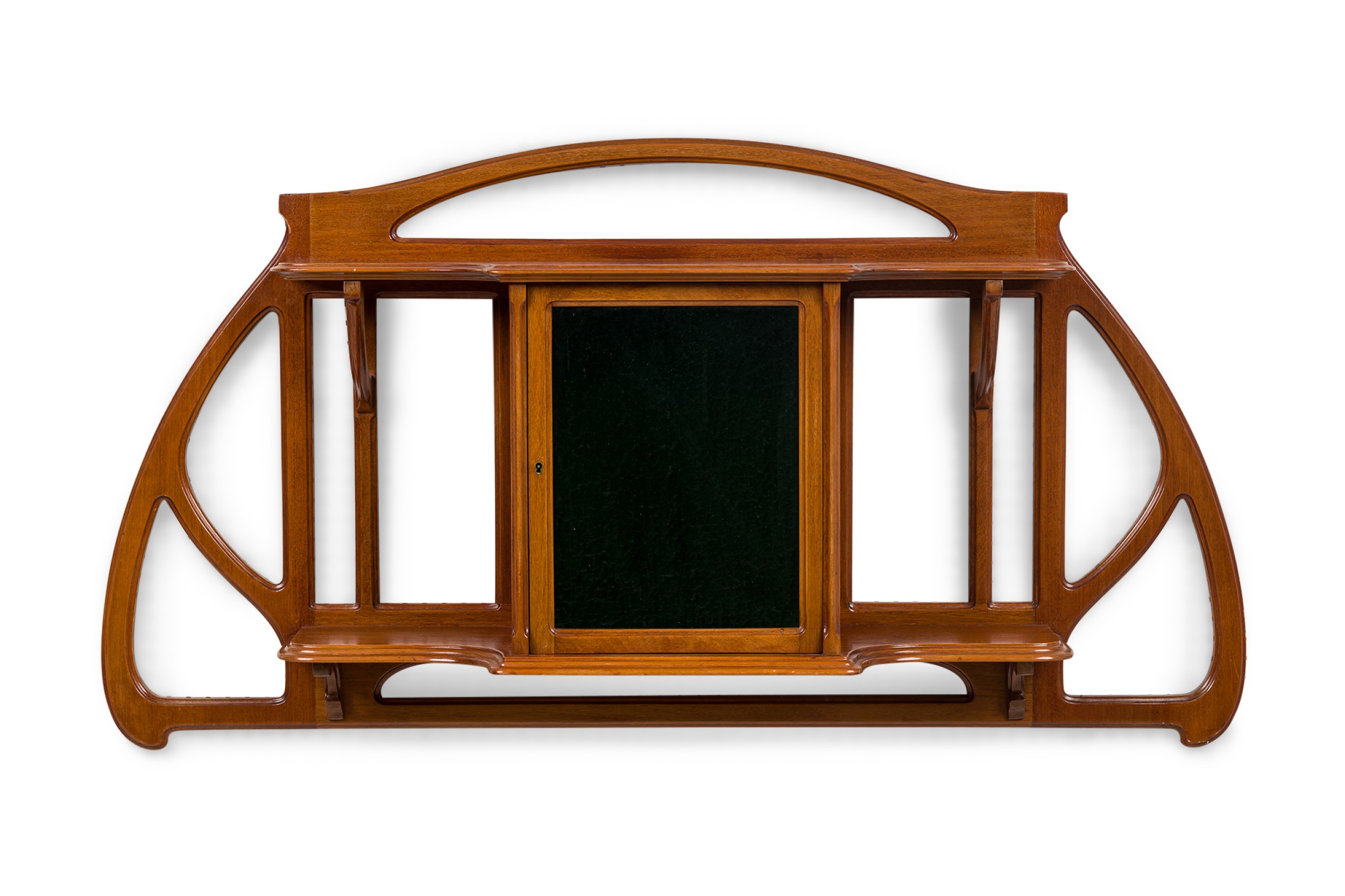 French Art Nouveau "D" shaped hanging cabinet with openwork sides and crest rail, centering a closed cabinet with a light green textured glass door with two open shelves on either side. (LEON BENOUVILLE).