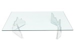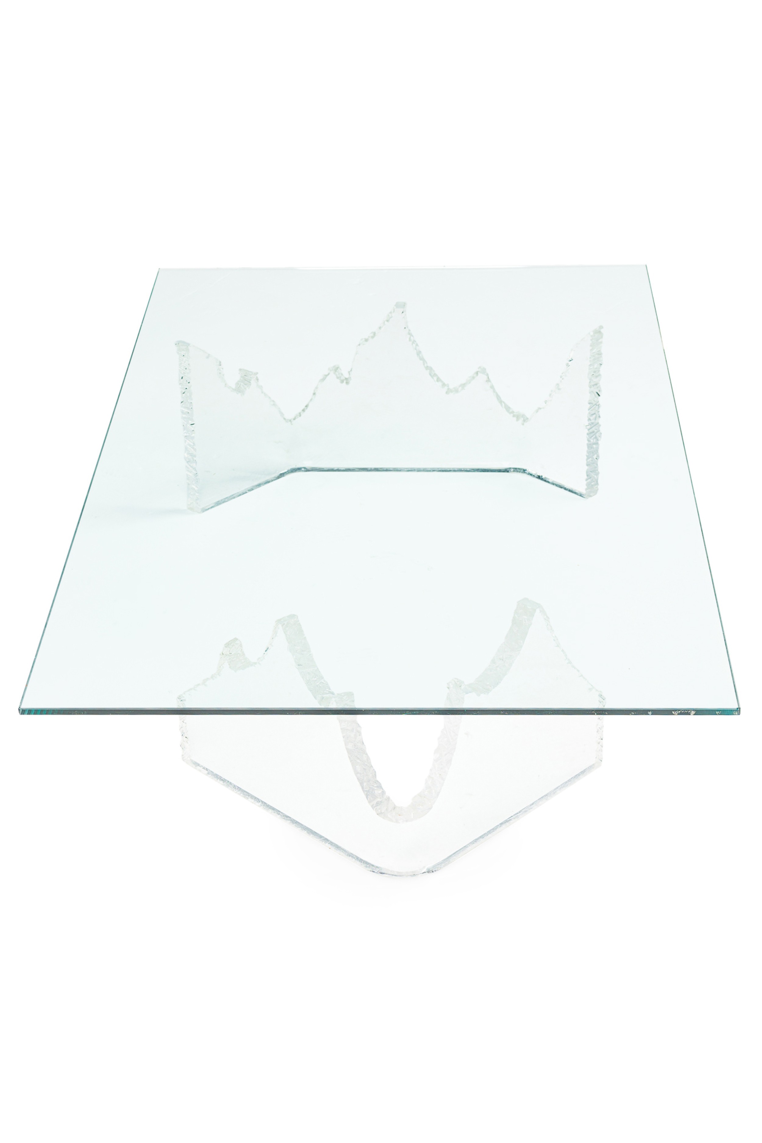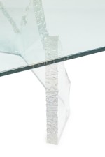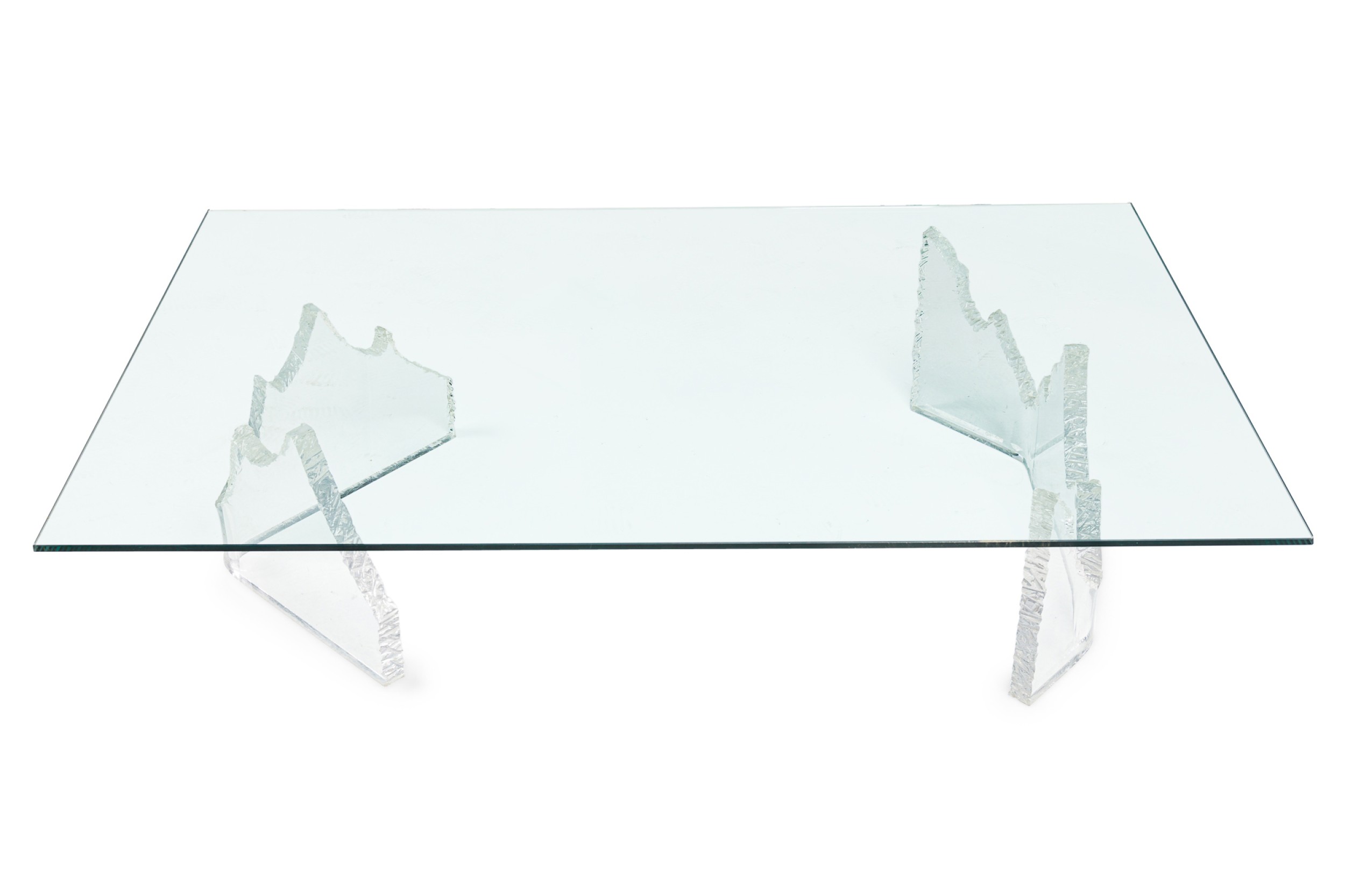 Mid-Century American lucite cocktail / coffee table made up of 2 iceberg form bases with the longer base being U-shaped and the shorter is V-shaped. (signed, LION IN FROST)