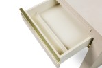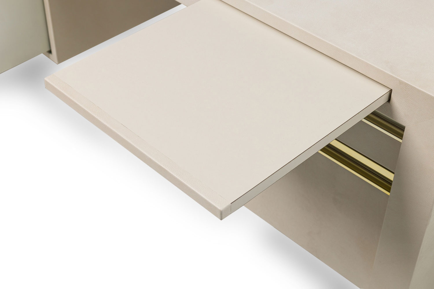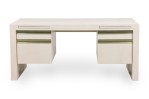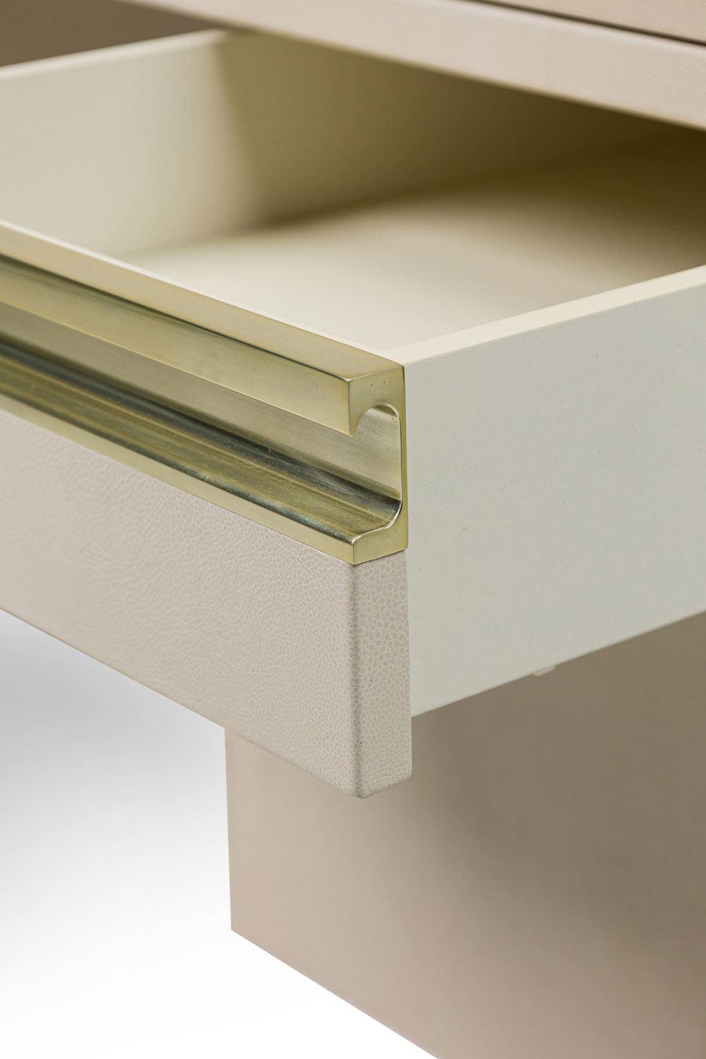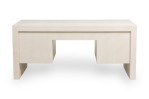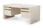 American mid-century Karl Springer style custom desk with a white leather finish, having two pull out trays, two drawers with pencil wells and two file drawers with metal pulls.