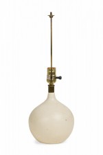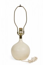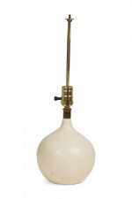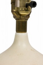 Mid-Century (1960s) Danish ceramic bone stoneware table lamp in orb form with pinched neck featuring an extended brass functioning light switch socket plus harp, the body fired in a matte white glaze. (LOTTE AND GUNNAR BOSTLUND)