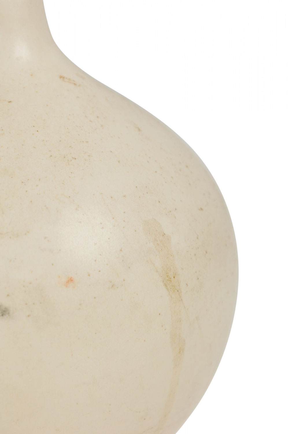 Mid-Century (1960s) Danish ceramic bone stoneware table lamp in orb form with pinched neck featuring an extended brass functioning light switch socket plus harp, the body fired in a matte white glaze. (LOTTE AND GUNNAR BOSTLUND).