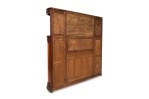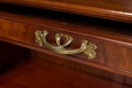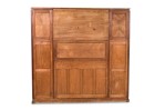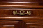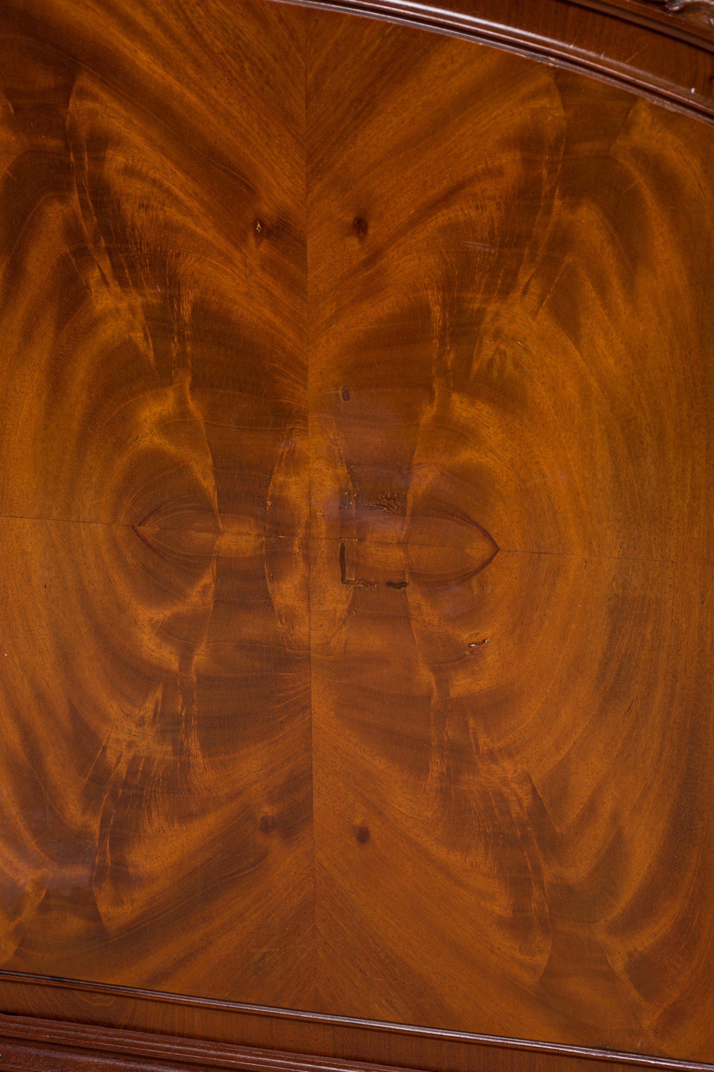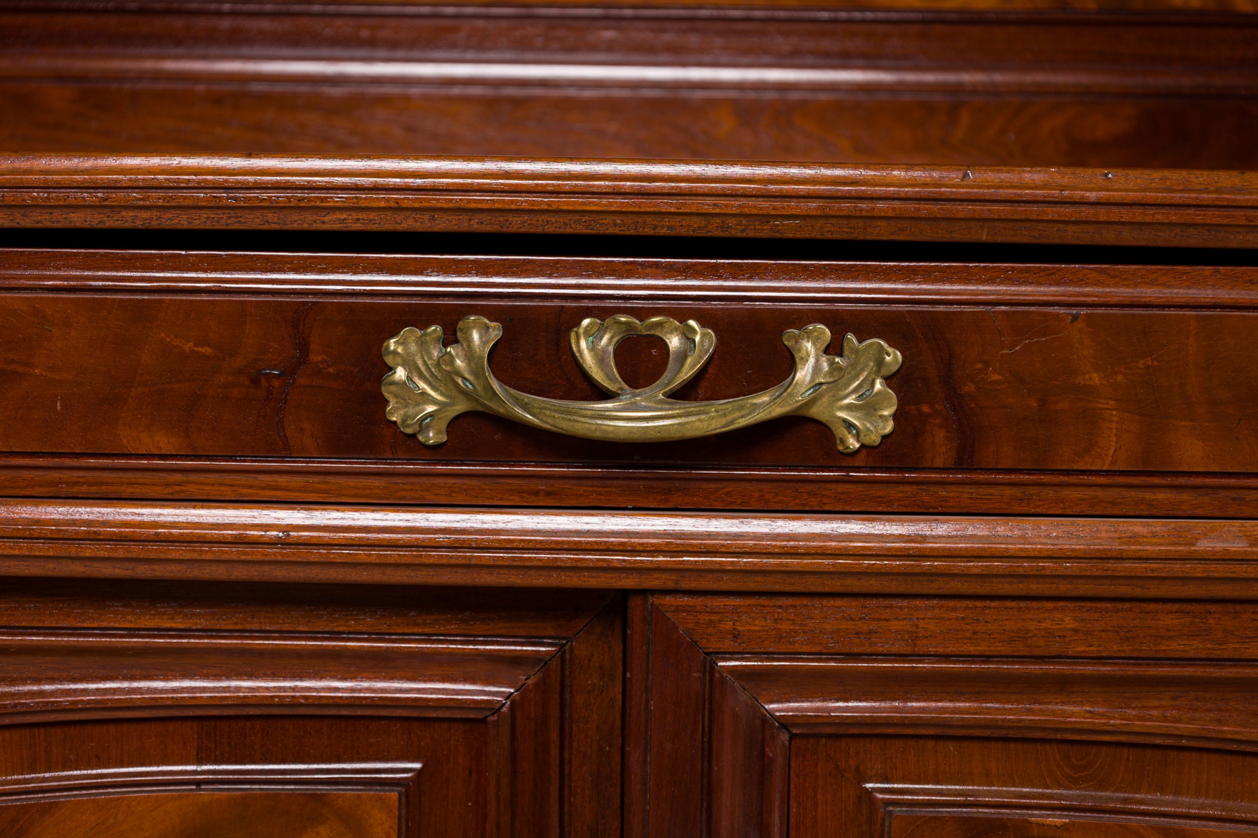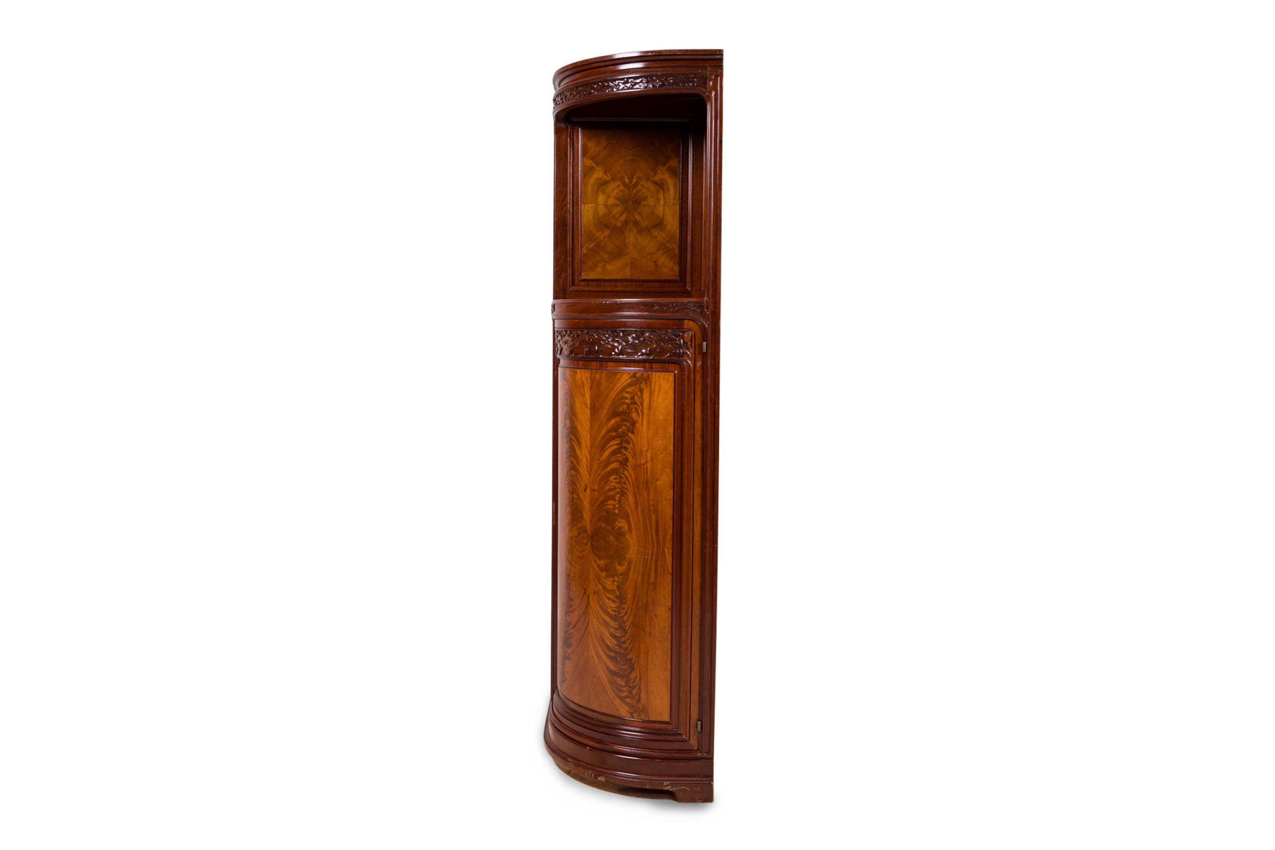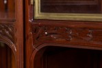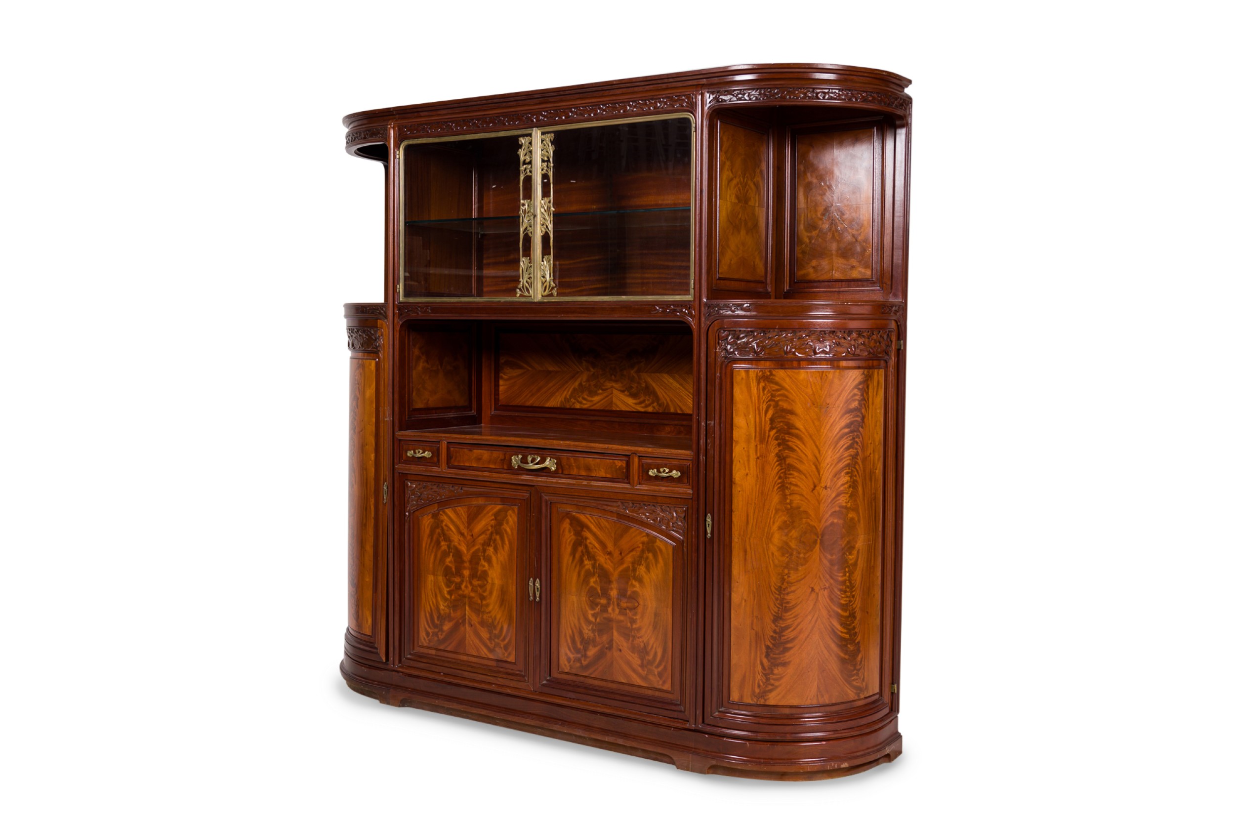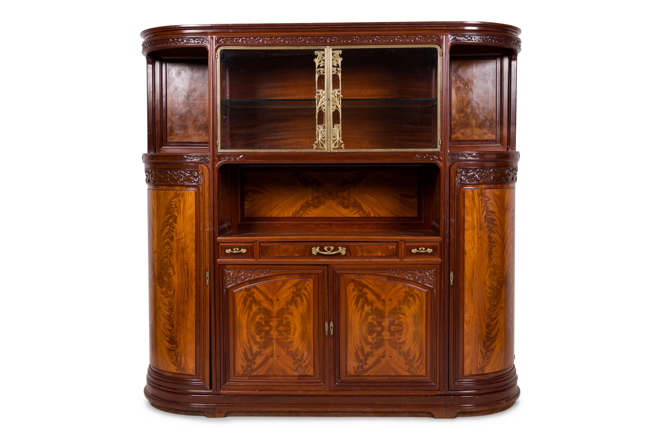 French Art Nouveau monumental display cabinet / vitrine having two rounded exterior sections containing an upper small and lower large cabinet, centering an upper glass door breakfront cabinet over an open shelf compartment, resting on a lower cabinet with two pull out drawers and two cabinets, embellished with Nouveau-style gilt mounts. (LOUIS MAJORELLE)