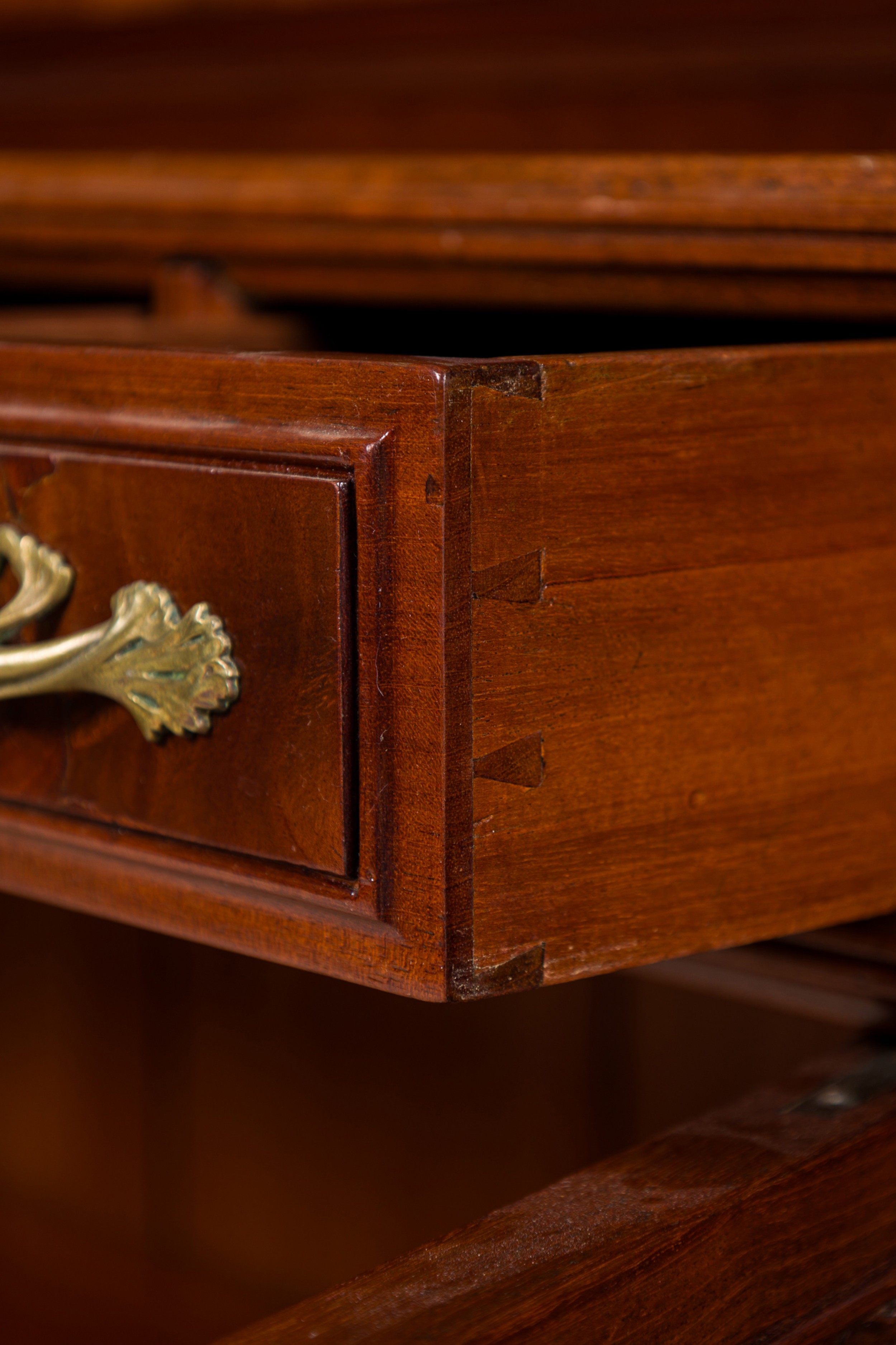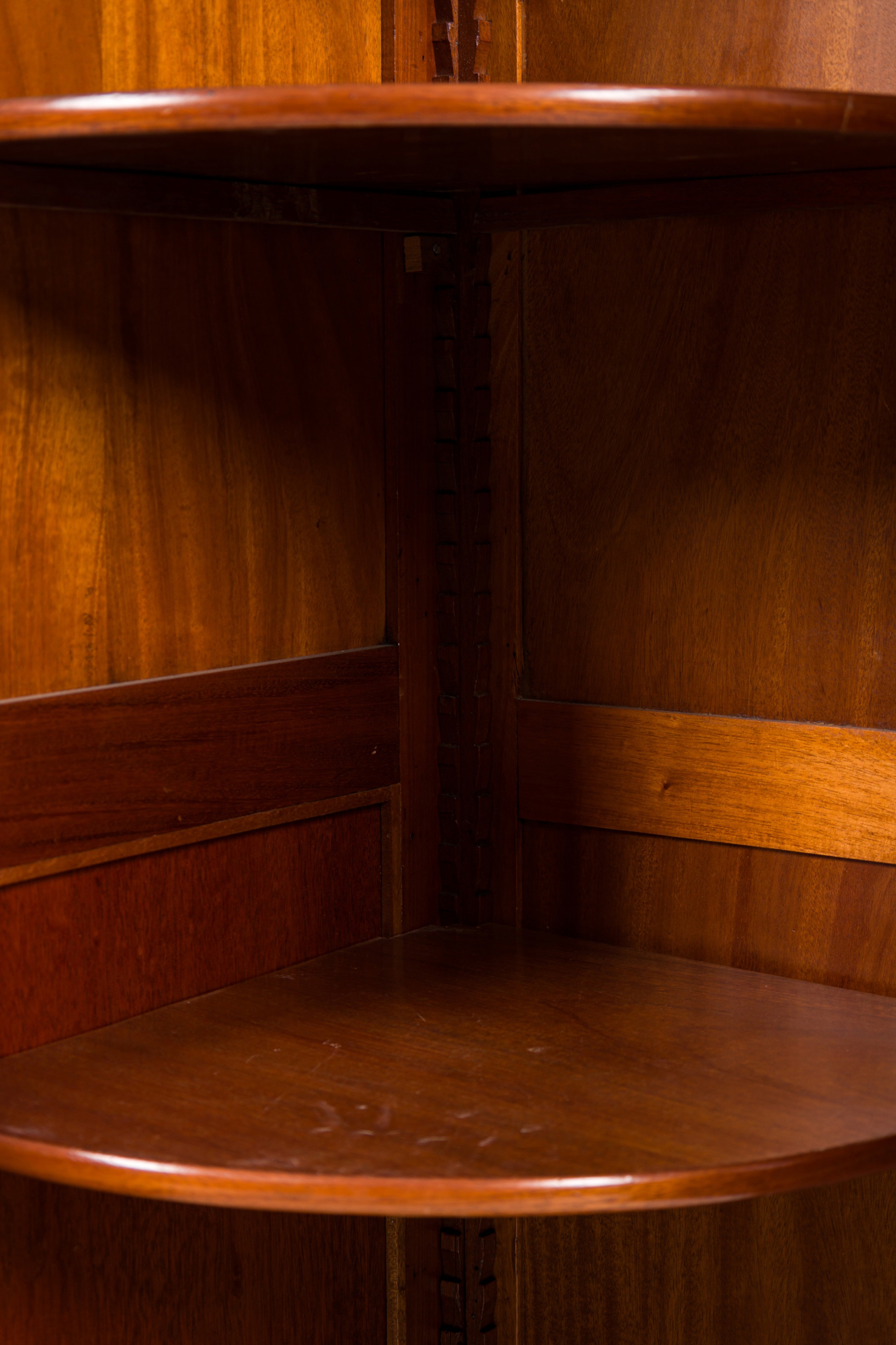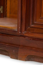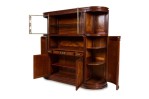 French Art Nouveau monumental display cabinet / vitrine having two rounded exterior sections containing an upper small and lower large cabinet, centering an upper glass door breakfront cabinet over an open shelf compartment, resting on a lower cabinet with two pull out drawers and two cabinets, embellished with Nouveau-style gilt mounts. (LOUIS MAJORELLE).