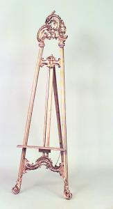 French Louis XV style (19/20th Cent) gilt easel stand with ornate carved triple scroll top..