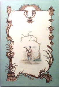 French Louis XV style (20th Century) oil on canvas celadon painting of Chinoiserie genre scenes in the style of Jean Pillement. (see also #059118).