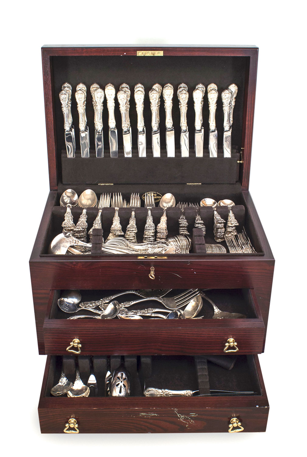 French "Francis 1st pattern" 1920s sterling silver flatware dinner service set for 18 with a rococo floral design in a mahogany case. 250 pieces. (REED & BARTON).