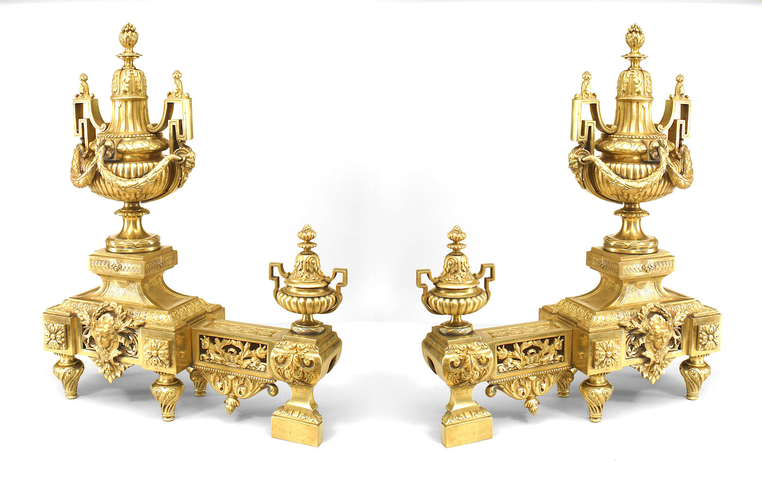 PAIR of French Louis XVI-style (19th Century) bronze dore double urn and festoon andirons with female head and filigree design. (PRICED AS PAIR)