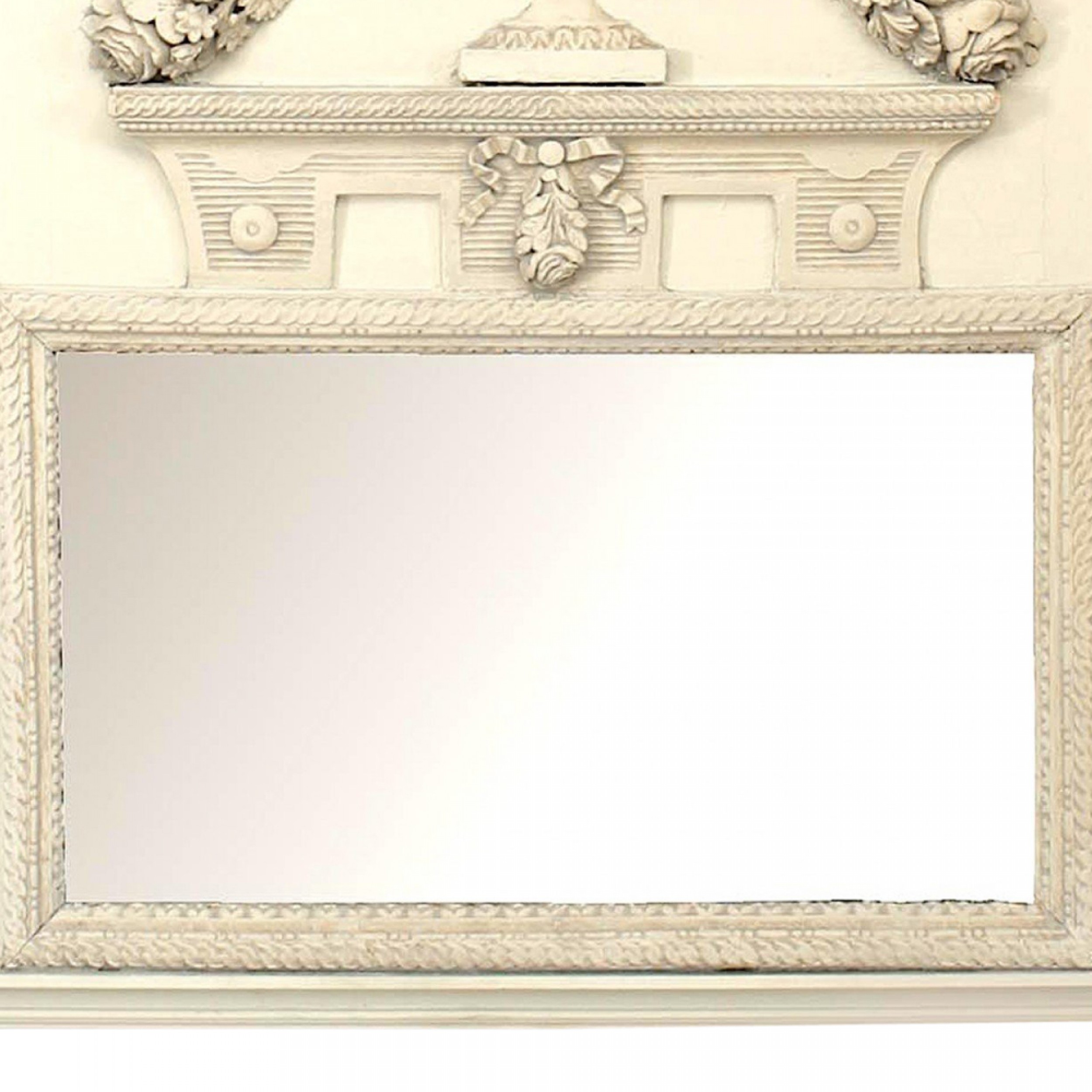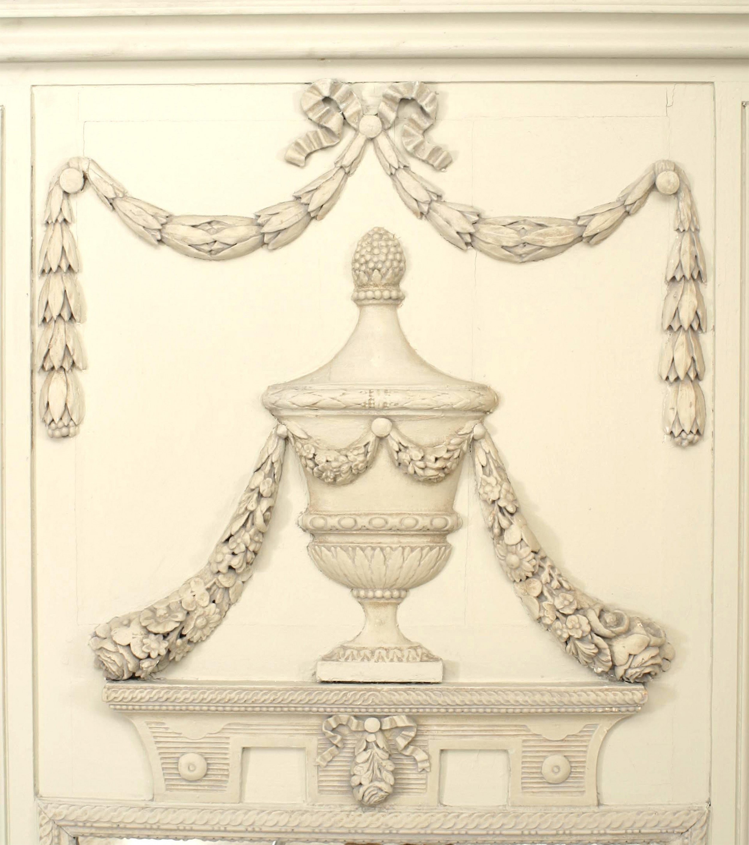 French Louis XVI white painted trumeau / wall mirror with neoclassical urn and festoon relief details and side panels with a mirror insert on the lower panel.