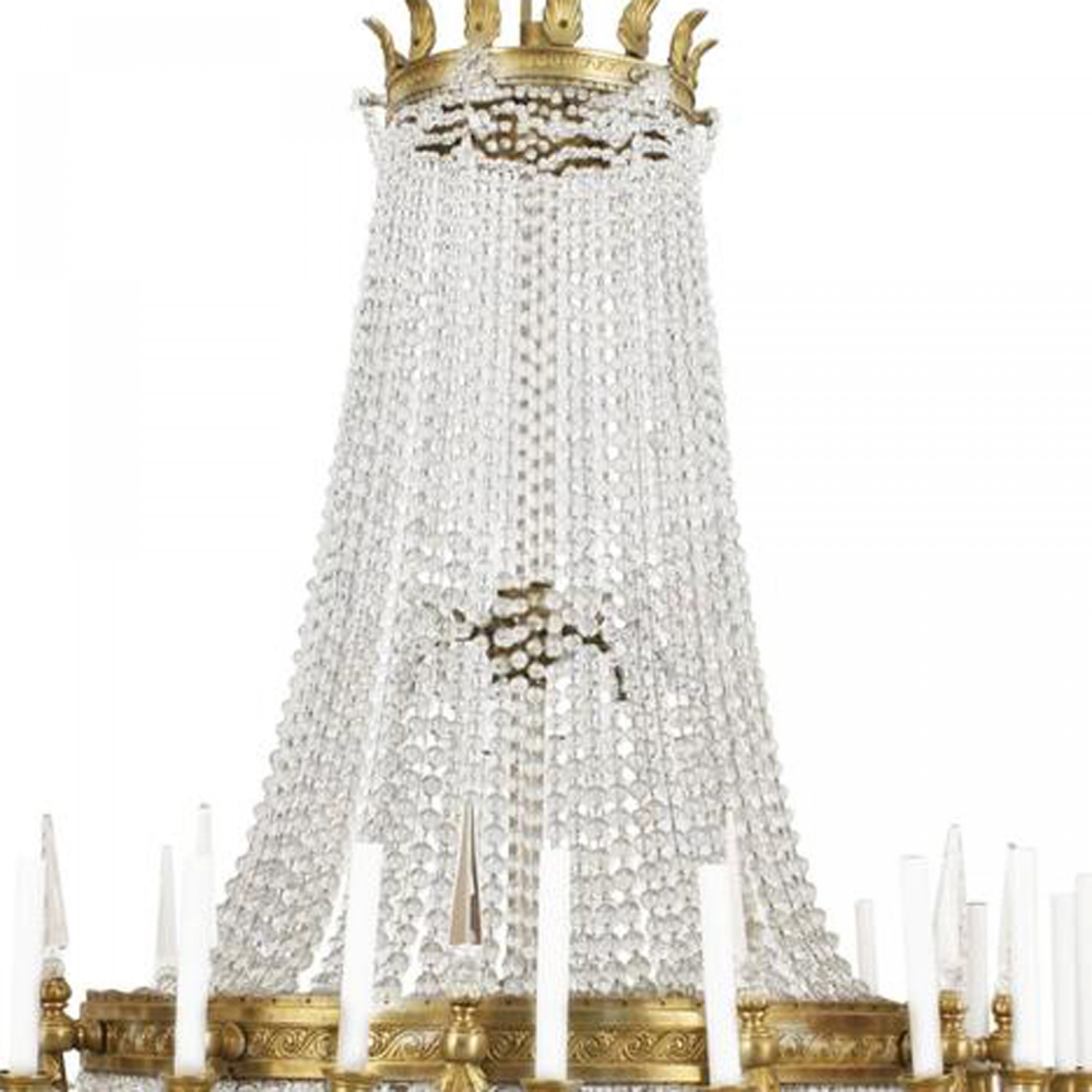 Louis XVI-style (20th Century) large crystal chandelier with a gilt bronze ring holding 24 scroll arms with lights under strands of beaded crystals with multi-tier crystal drop prisms below..