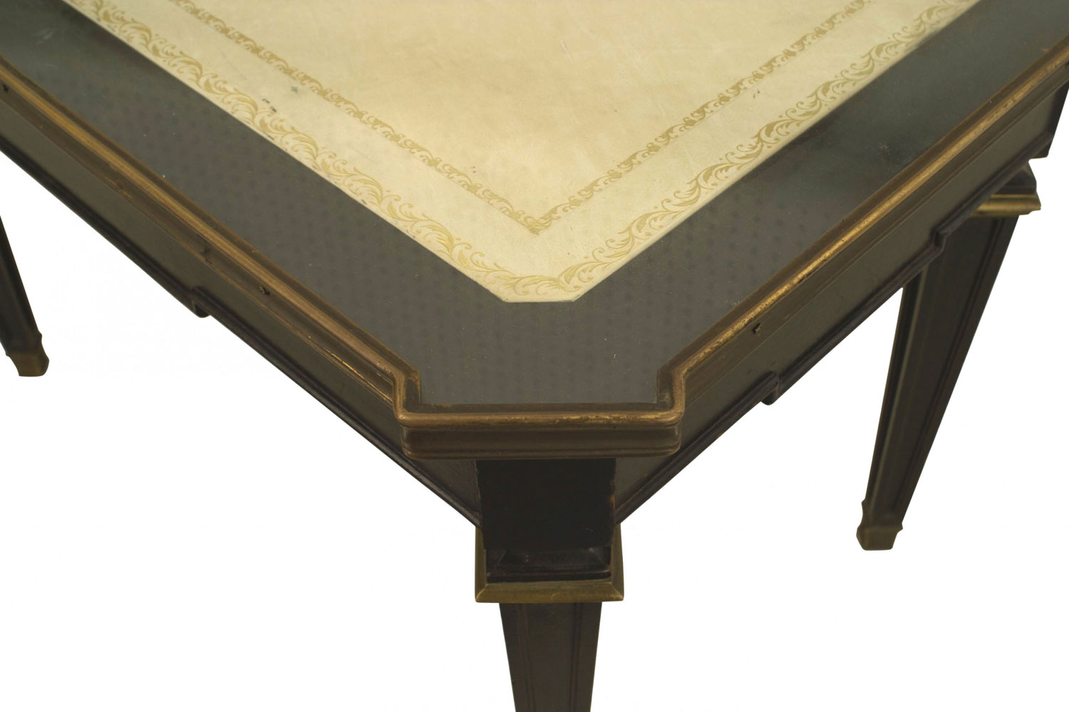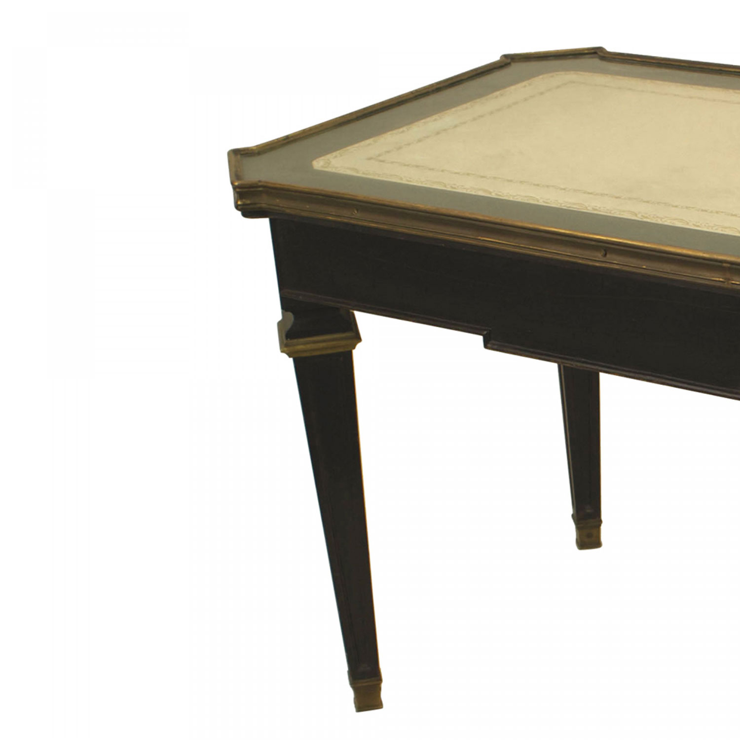 French Louis XVI-style (1940s) ebonized wood and bronze trimmed coffee table with tapered square legs and off-white leather inset top under glass. (stamped: JANSEN).