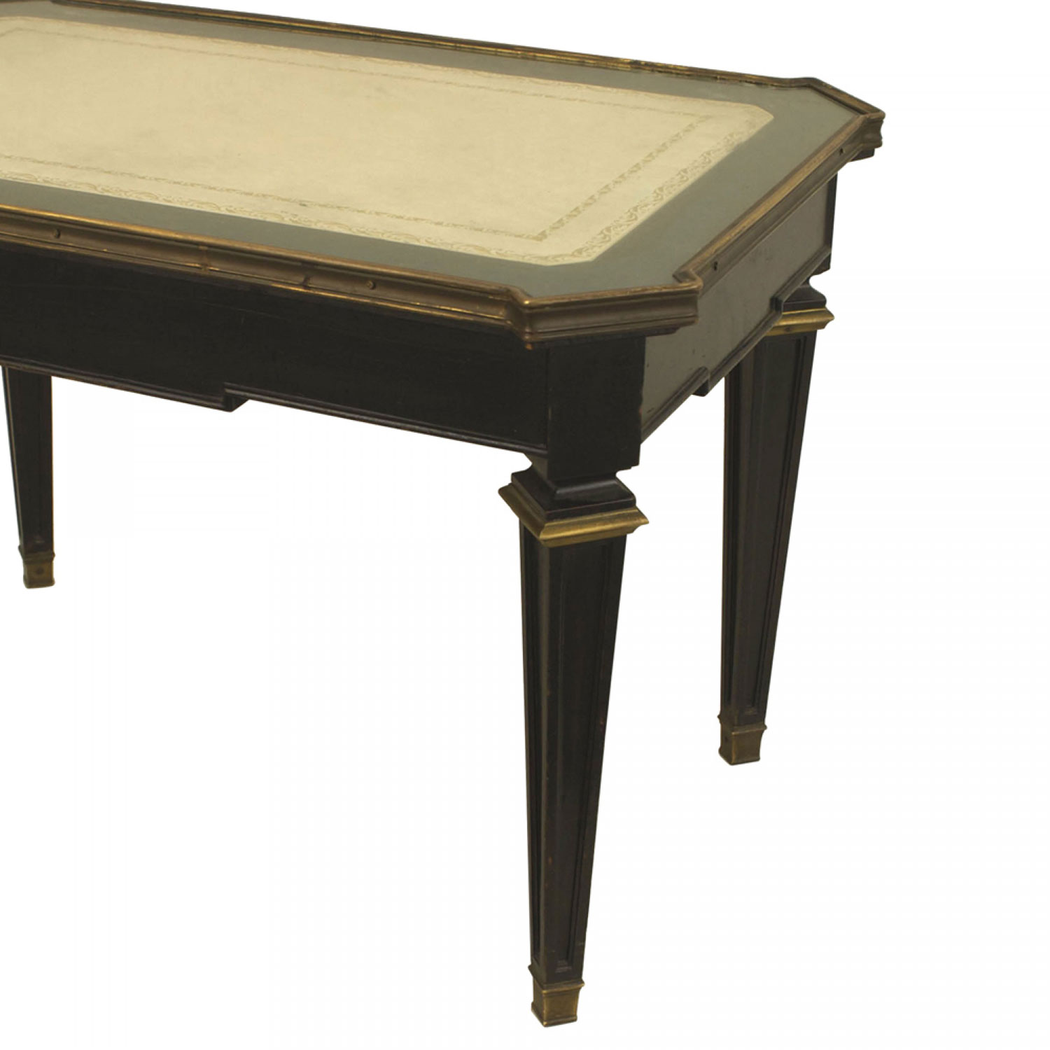 French Louis XVI-style (1940s) ebonized wood and bronze trimmed coffee table with tapered square legs and off-white leather inset top under glass. (stamped: JANSEN)
