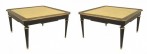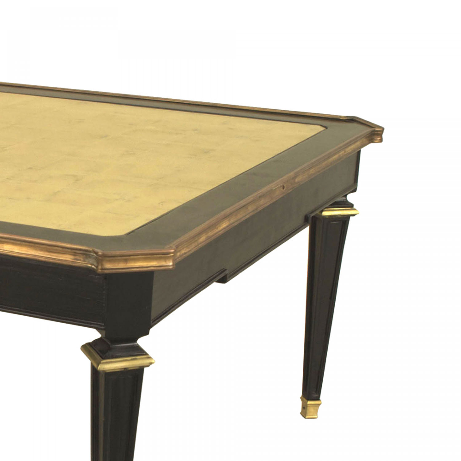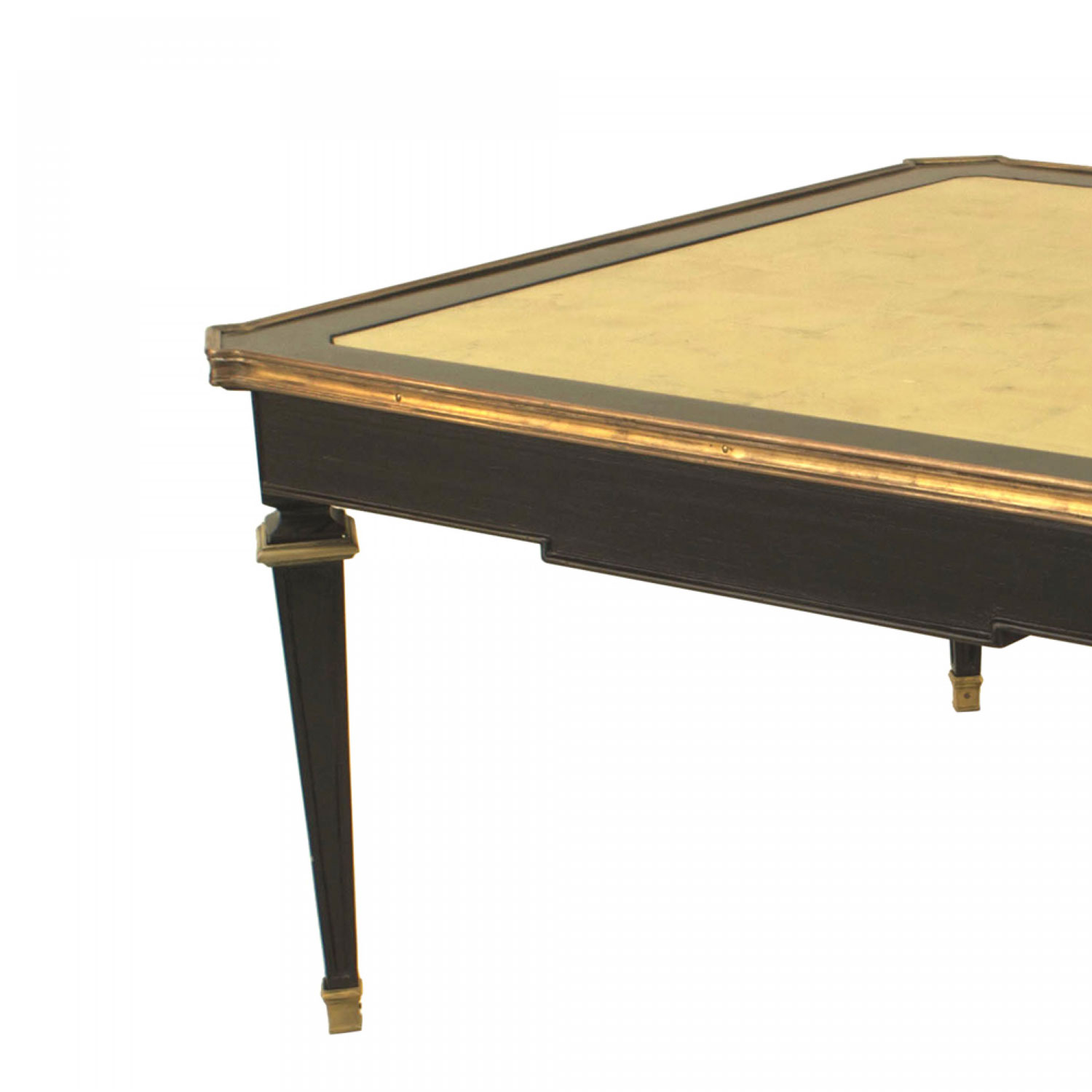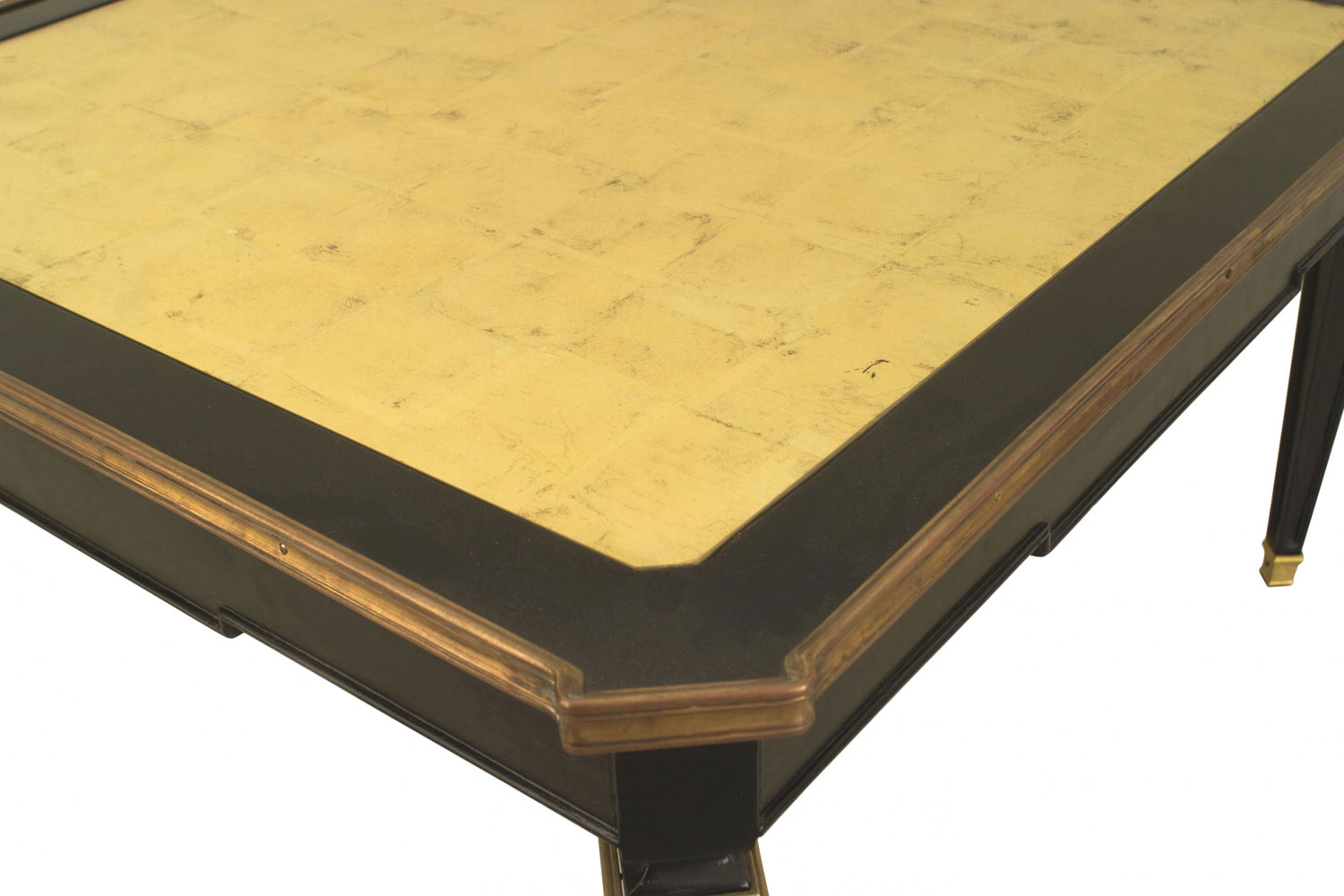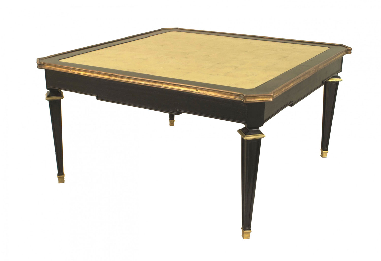 2 French Mid-Century (1940s) ebonized square coffee tables with a gilt bronze rim and trim with a gold leaf inset top and tapered square legs. (MAISON JANSEN) (PRICED EACH).