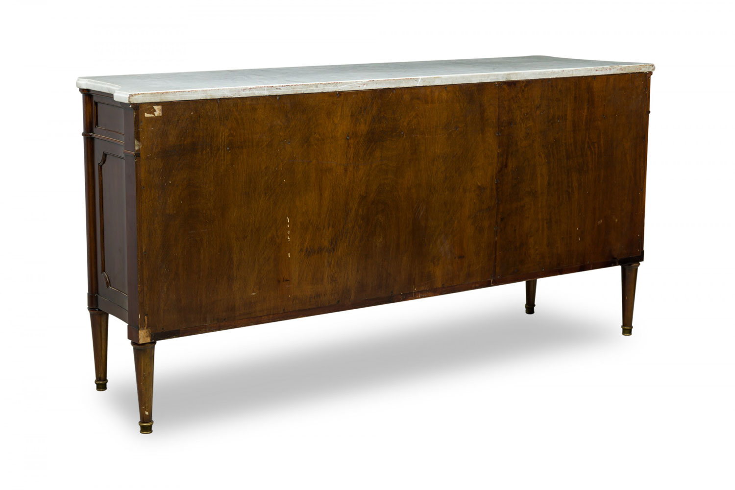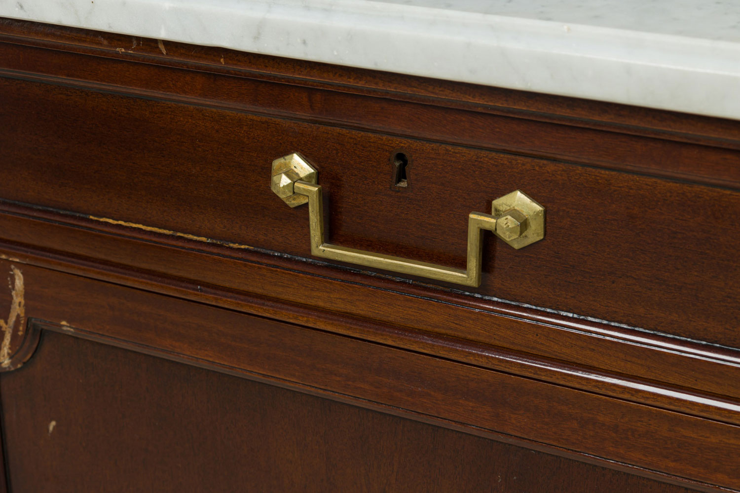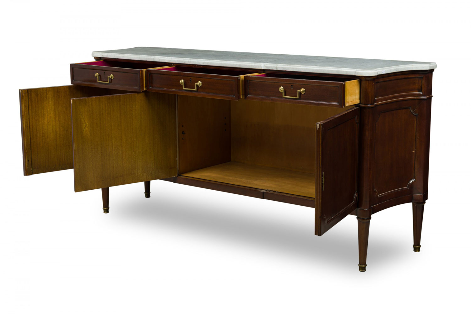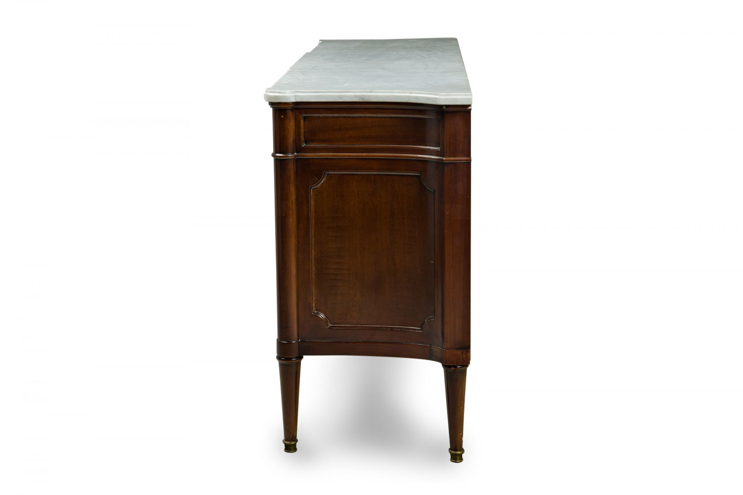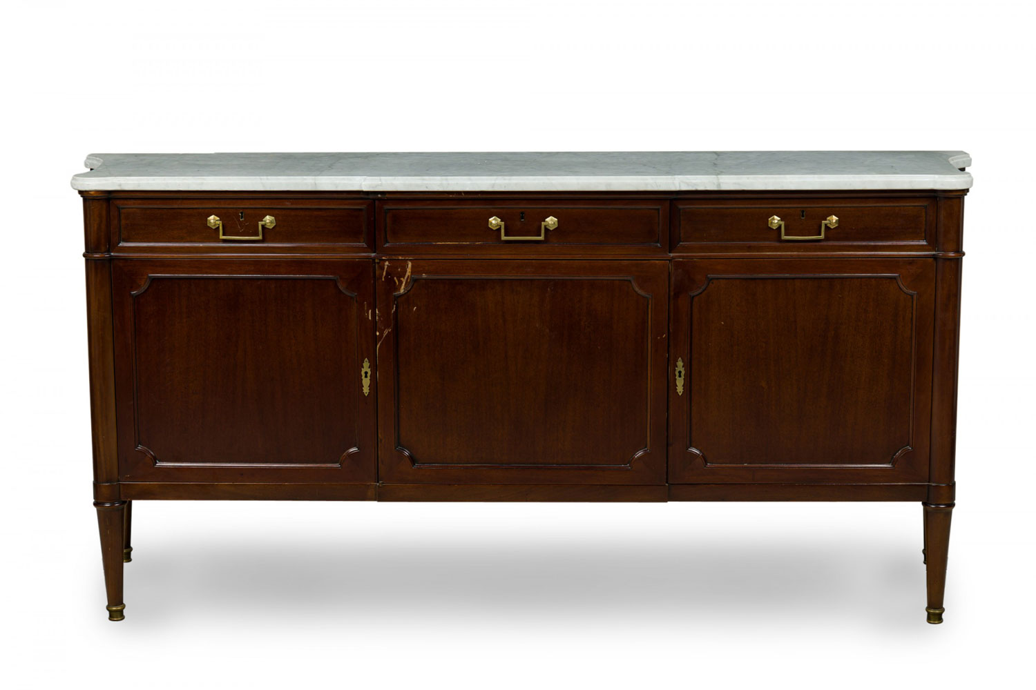 French Mid-Century mahogany chest / sideboard with three upper drawers with brass drawer pulls above three hinged door cabinets supporting a shaped white marble top and resting on four tapered legs. (MAISON JANSEN)